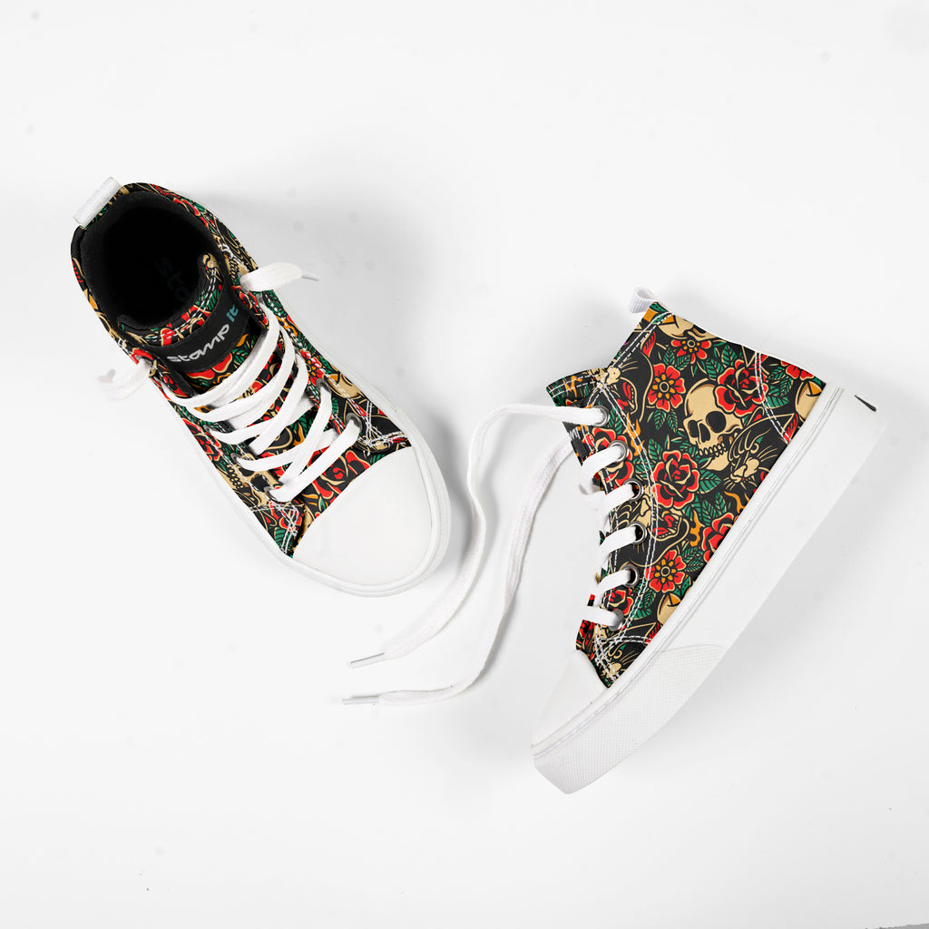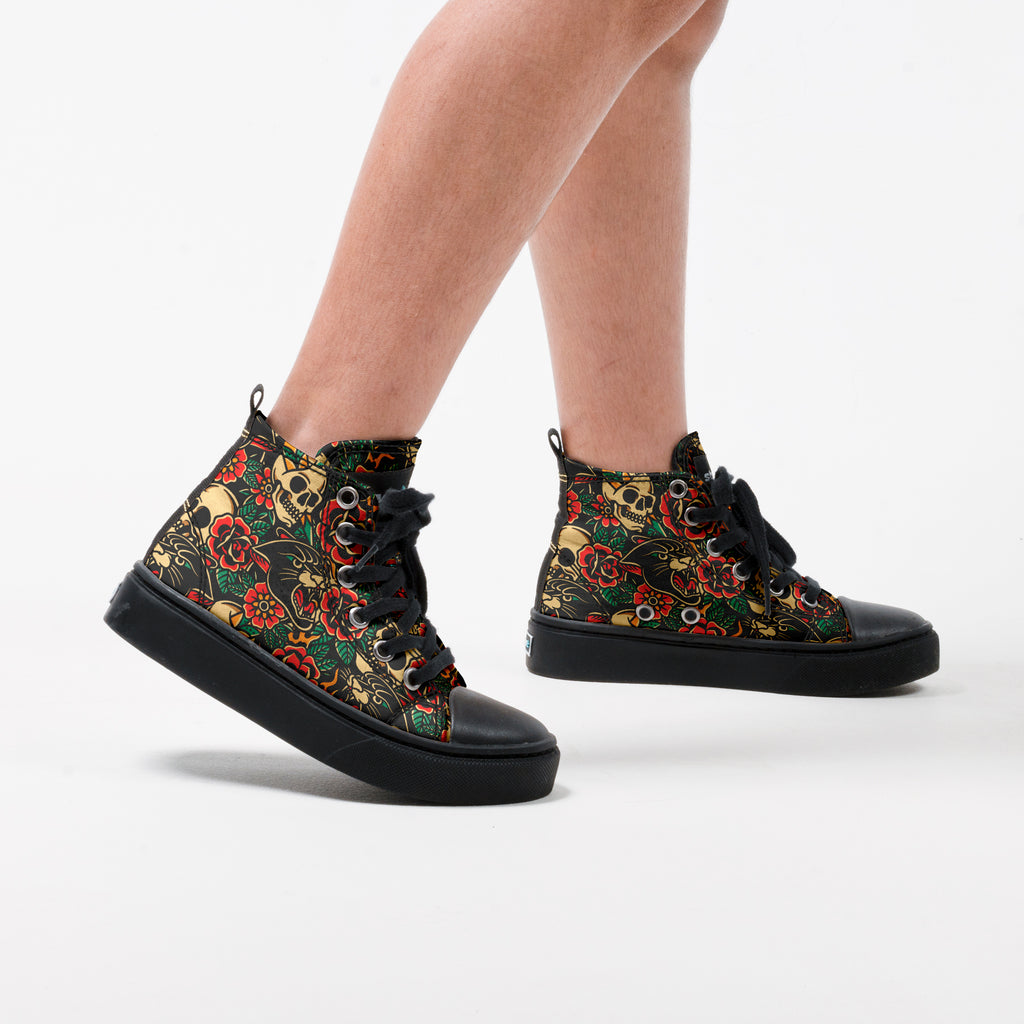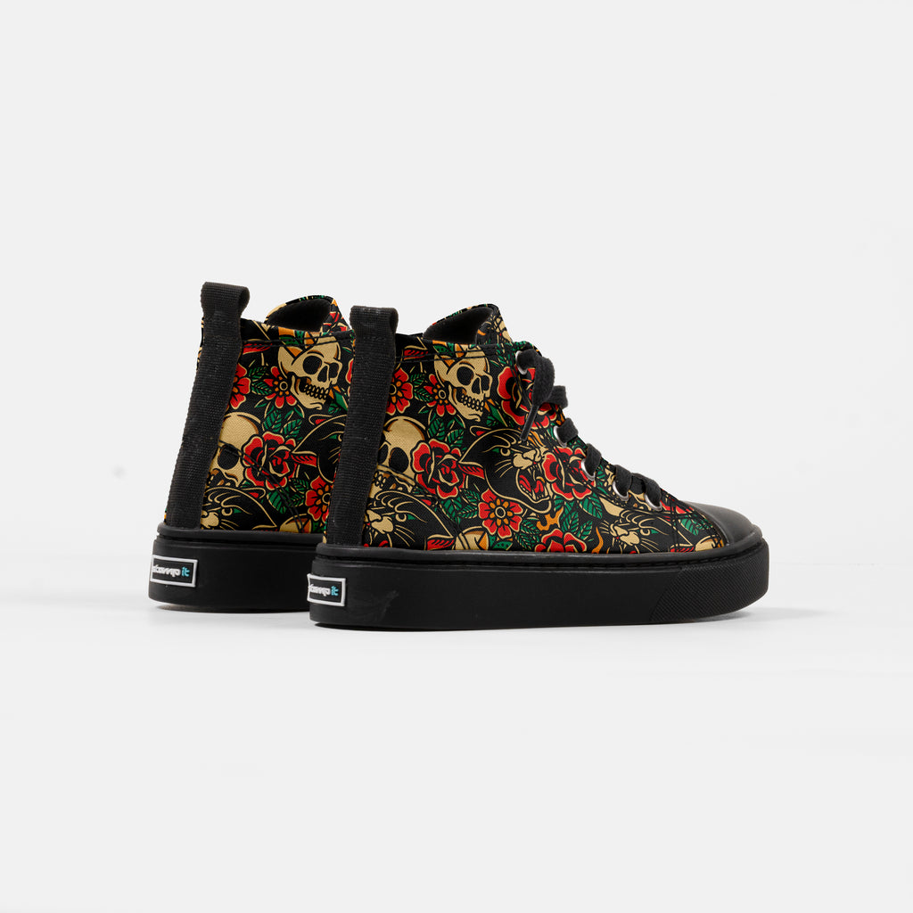 Tênis Cano Alto Infantil Old School, confeccionado em lona, com cores e estampas exclusivas.
