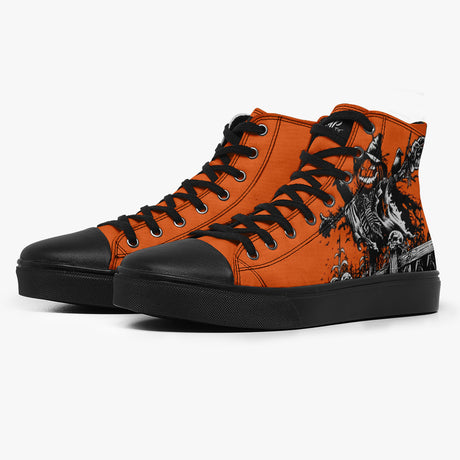 Tênis Cano Alto Laranja Espantalho Cabeça de Abóbora Halloween, confeccionado em lona, com cores e estampas exclusivas.