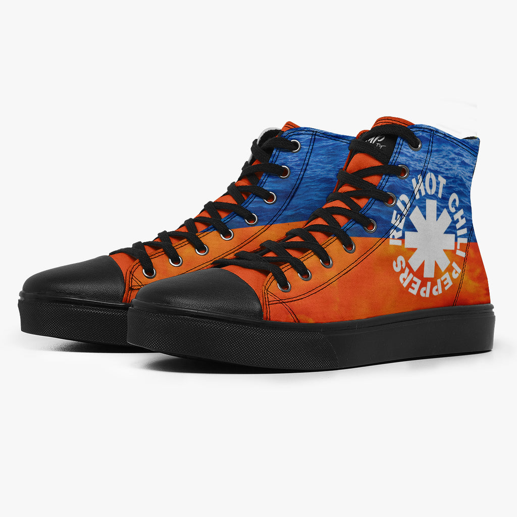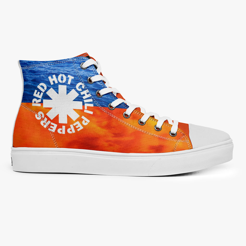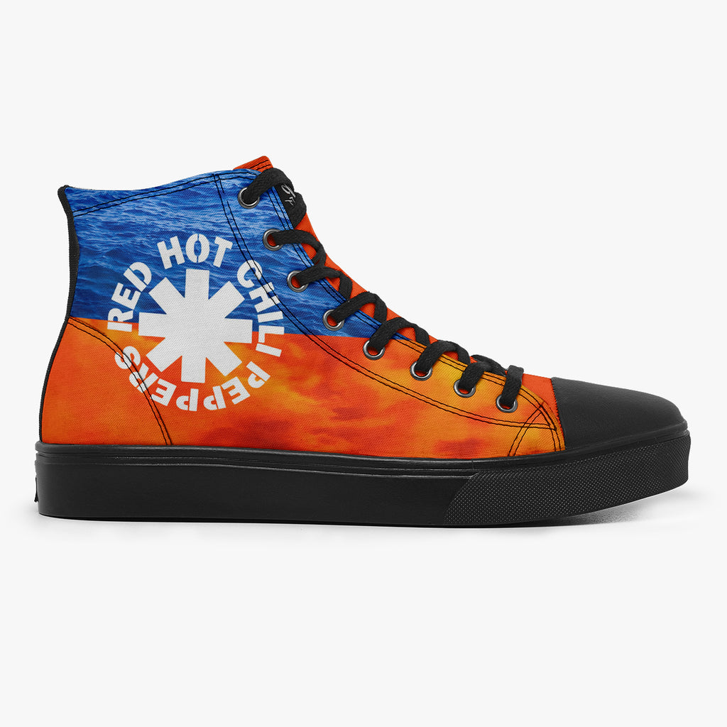 Tênis Cano Alto Laranja Rock N Roll Red Hot Chili Peppers Californication Aesthetic Bandas de Rock, confeccionado em lona, com cores e estampas exclusivas.