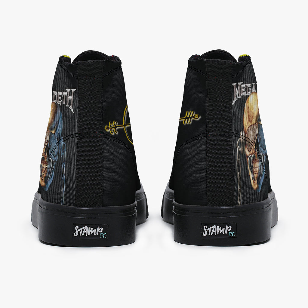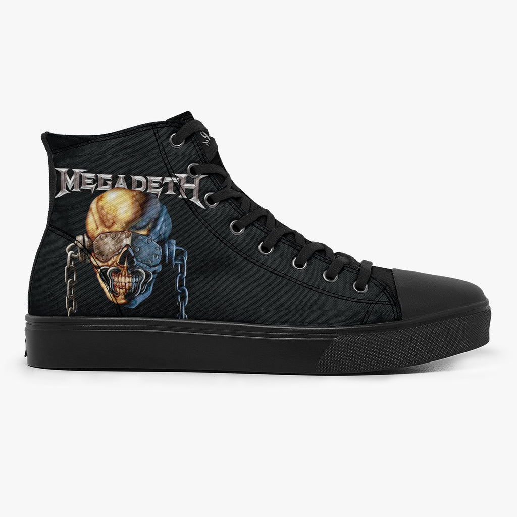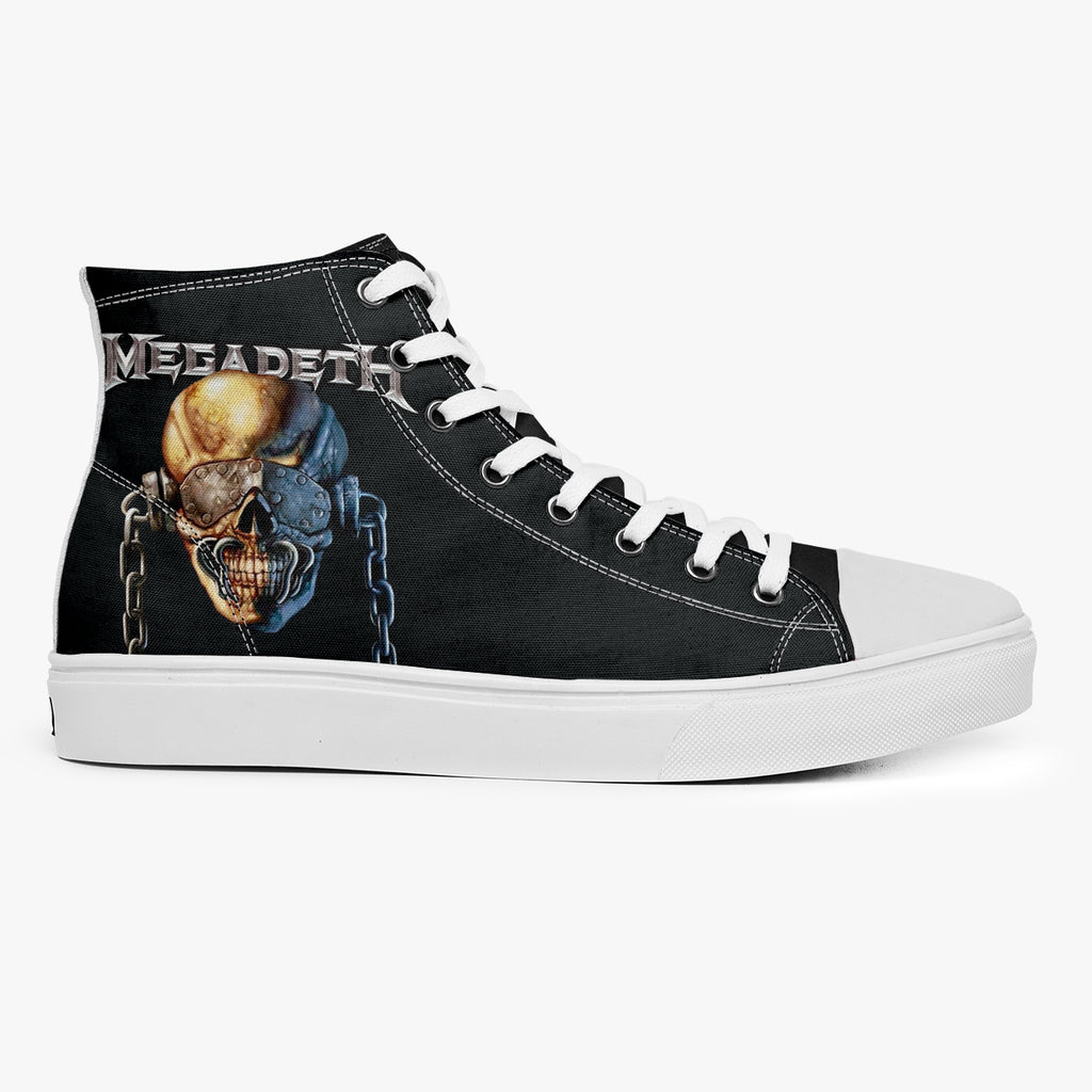 Tênis Cano Alto Megadeth Peace Sells, confeccionado em lona, com cores e estampas exclusivas.