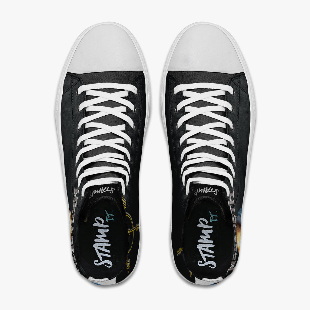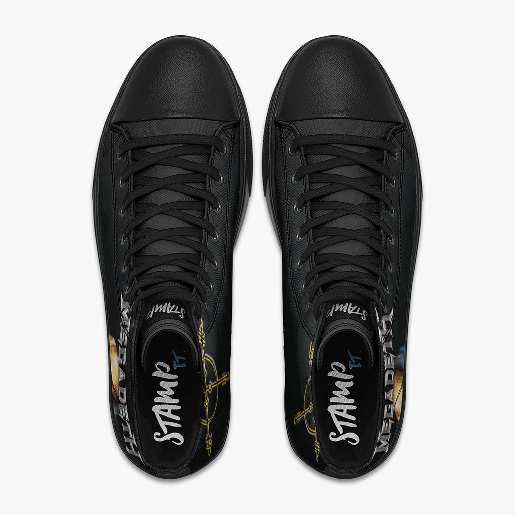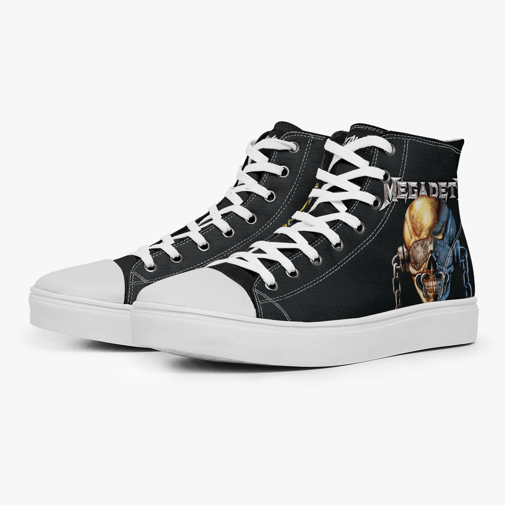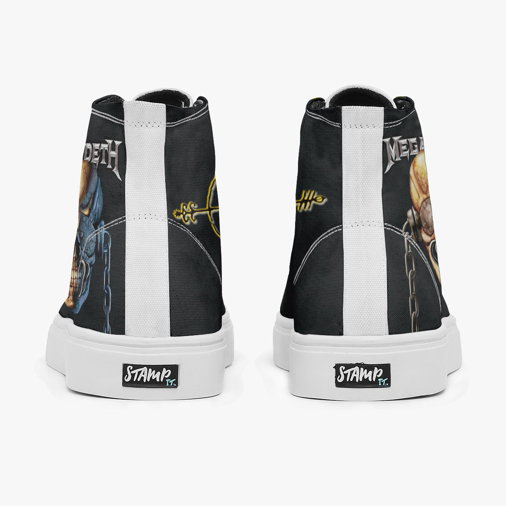 Tênis Cano Alto Megadeth Peace Sells, confeccionado em lona, com cores e estampas exclusivas.