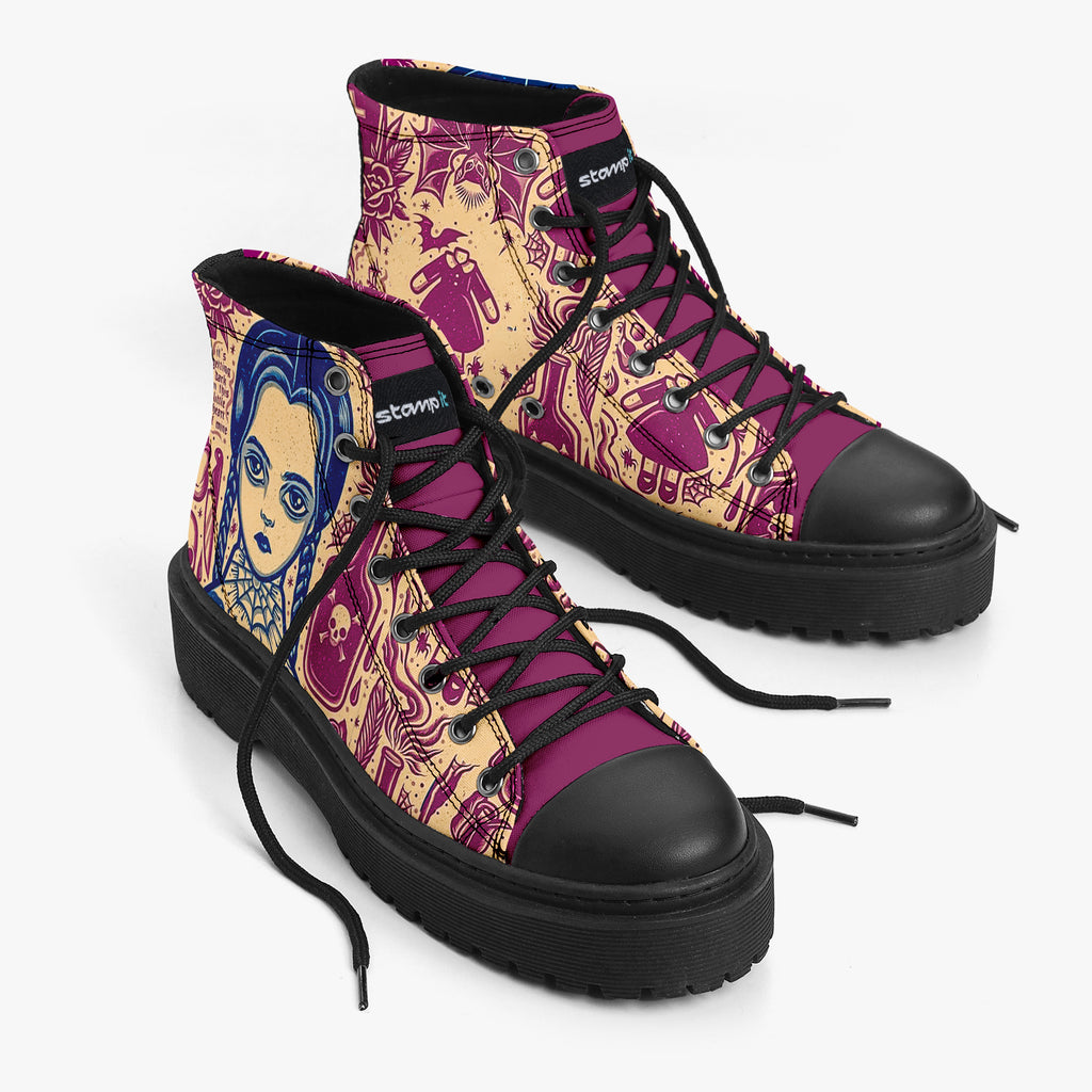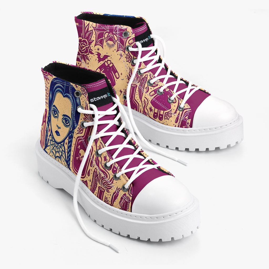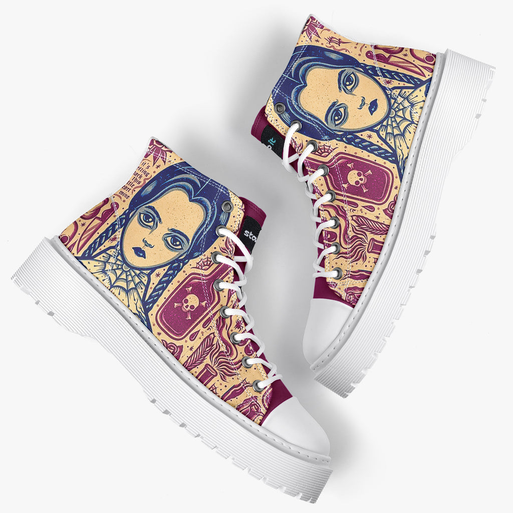 Tênis Cano Alto Plataforma Creme e Roxo Wednesday Horror Style Séries e Filmes, confeccionado em lona, com cores e estampas exclusivas.