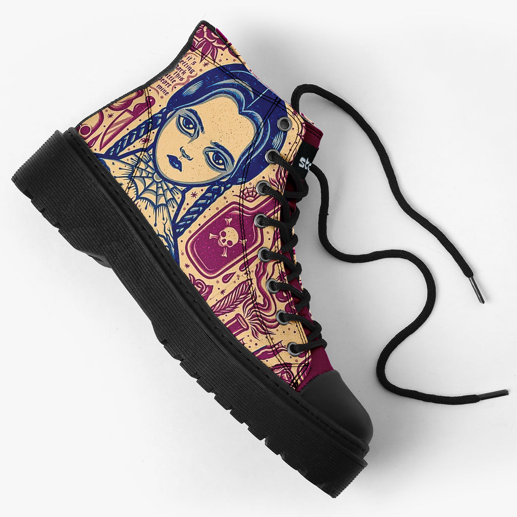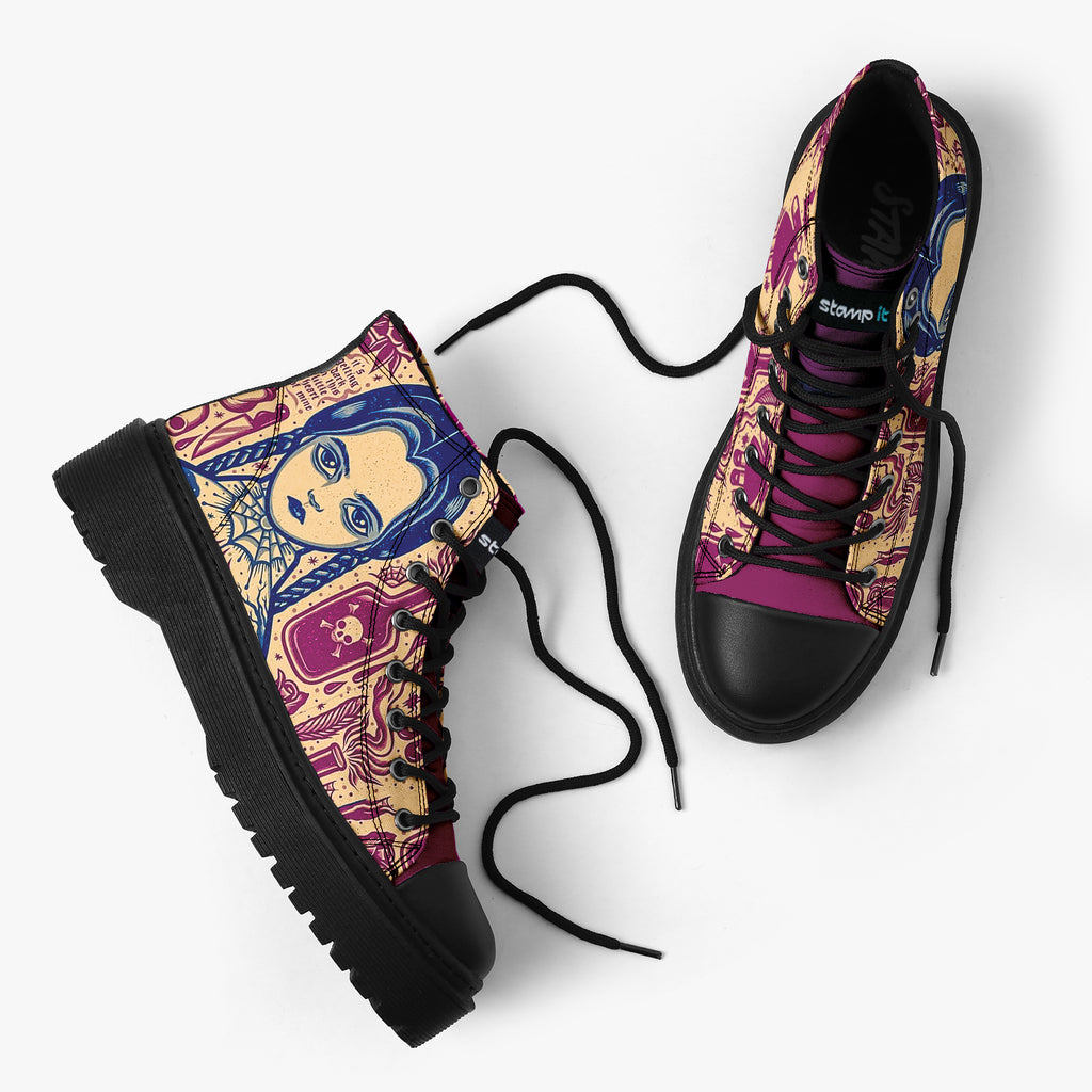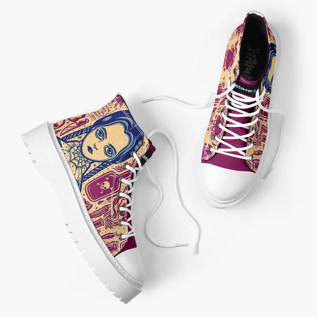 Tênis Cano Alto Plataforma Creme e Roxo Wednesday Horror Style Séries e Filmes, confeccionado em lona, com cores e estampas exclusivas.