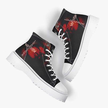 Tênis Cano Alto Plataforma Lady Gaga Mayhem, confeccionado em lona, com cores e estampas exclusivas.