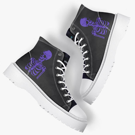 Tênis Cano Alto Plataforma Preto Esqueleto Rock n Roll Caveiras, confeccionado em lona, com cores e estampas exclusivas.