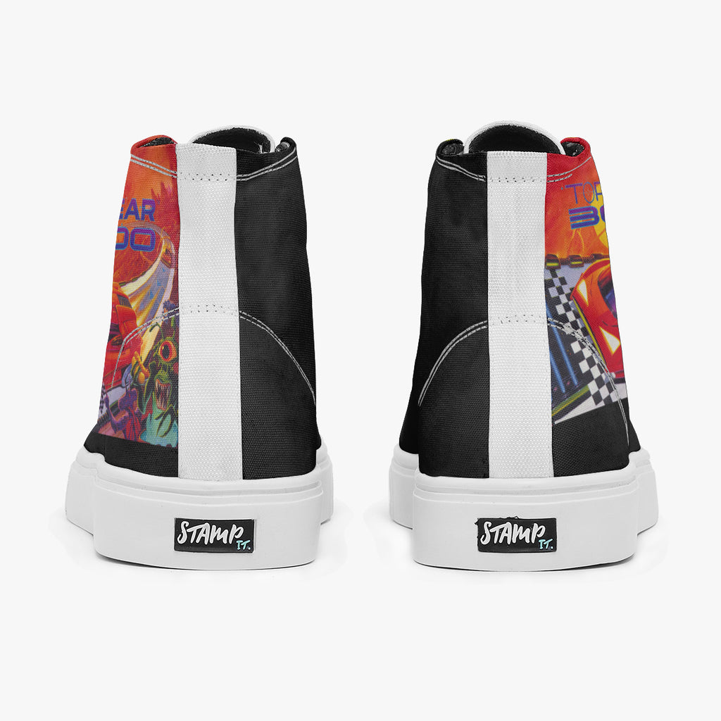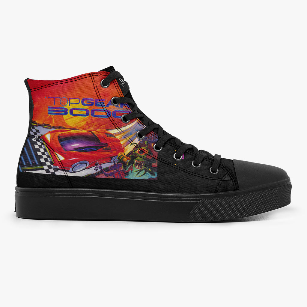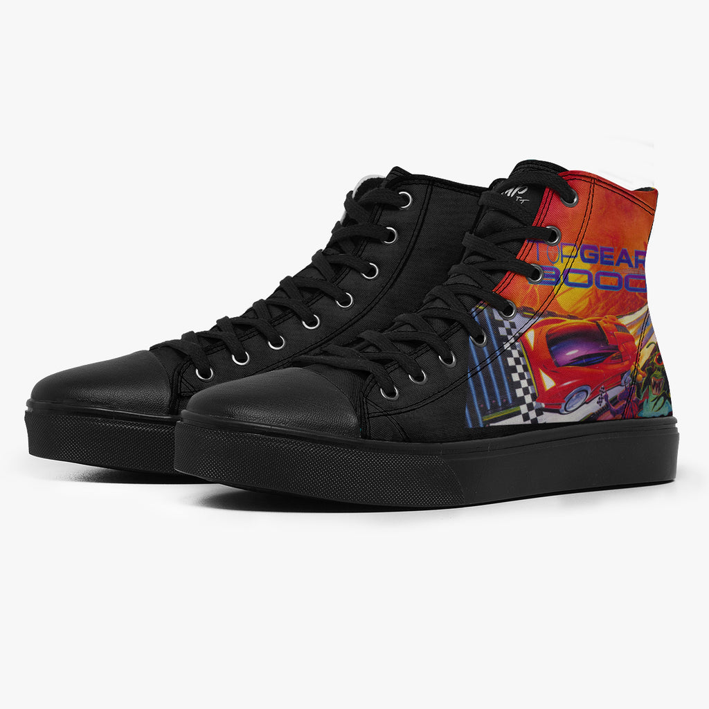 Tênis Cano Alto Preto Jogos Clássicos Top Gear 3000 Capa da Fita Games, confeccionado em lona, com cores e estampas exclusivas.