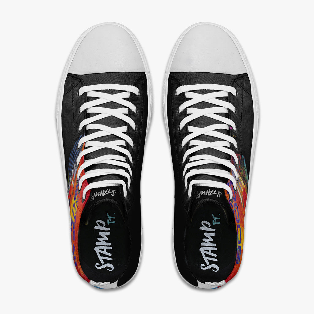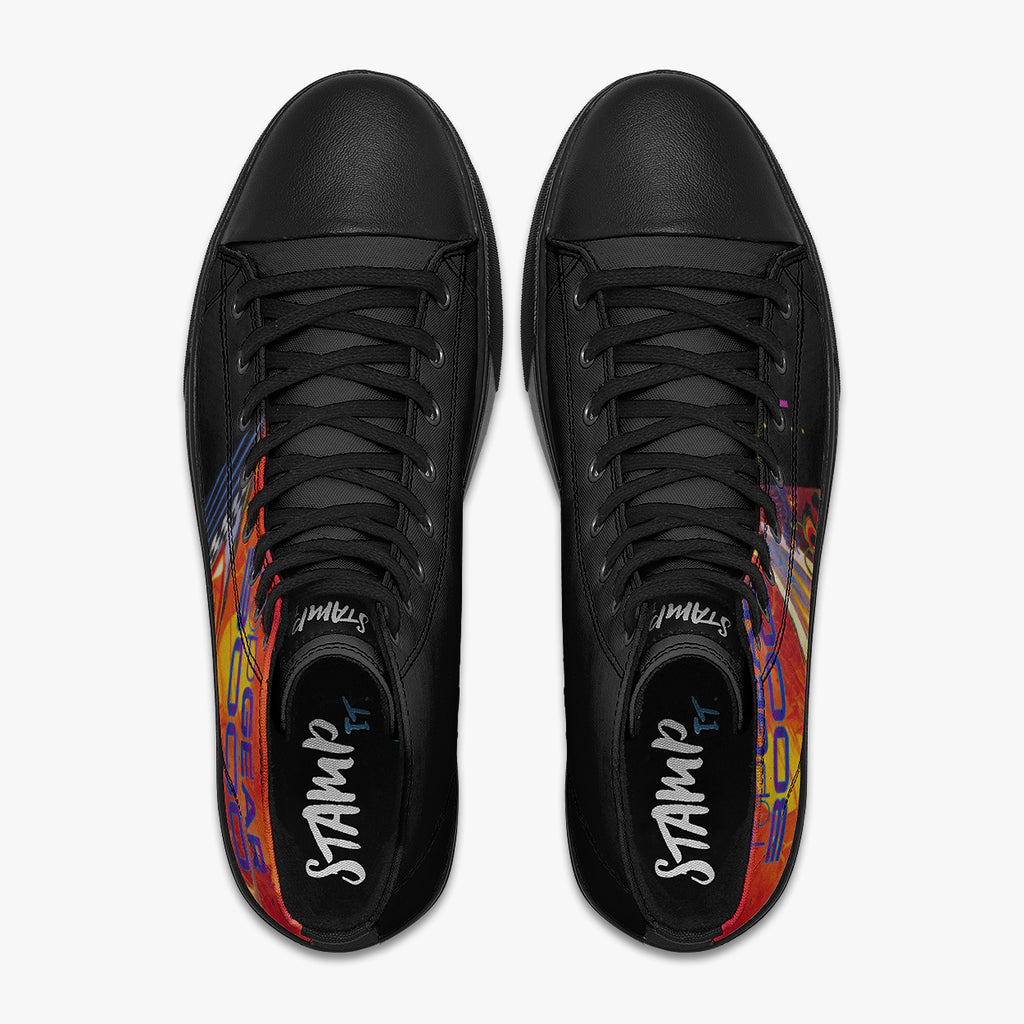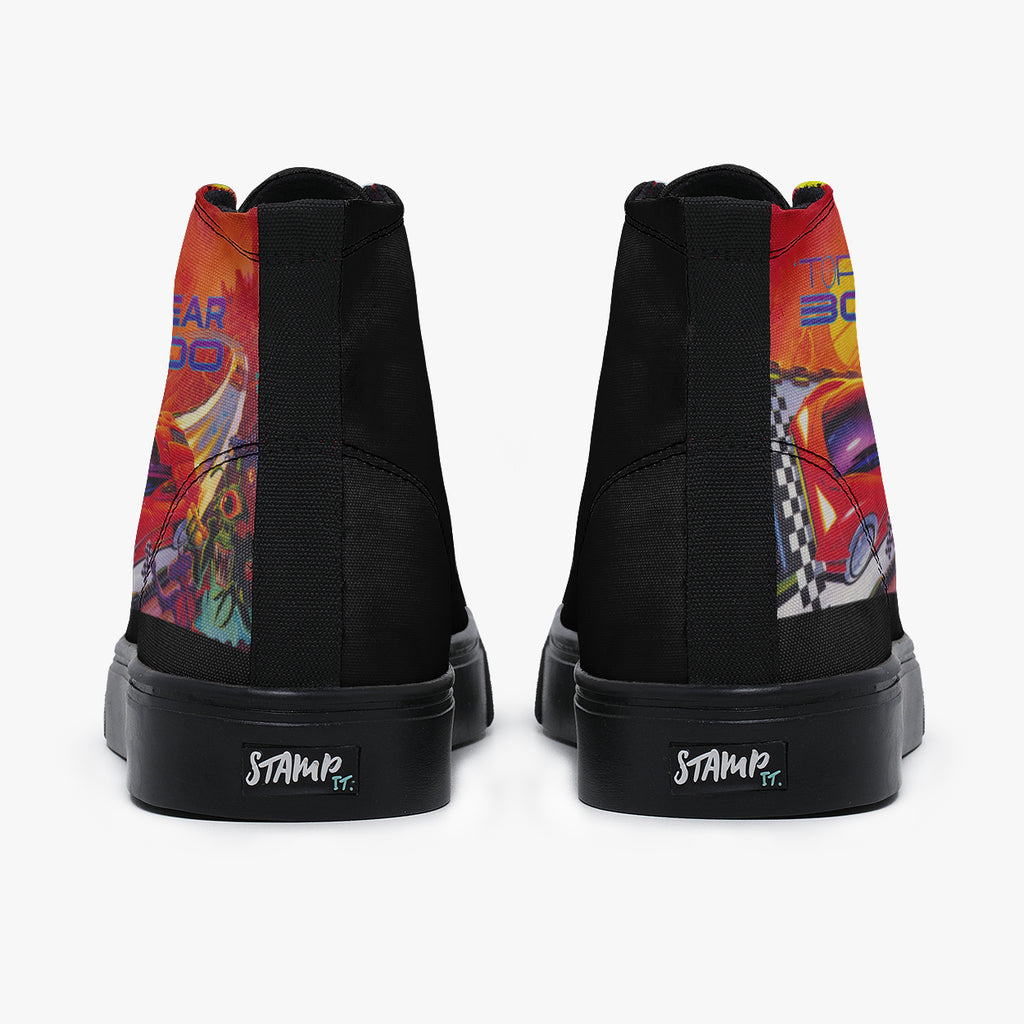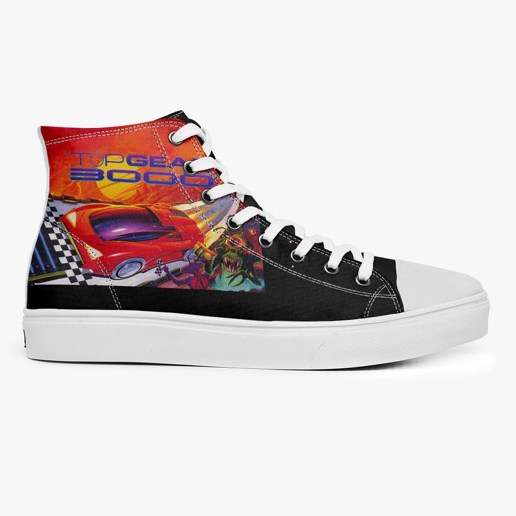 Tênis Cano Alto Preto Jogos Clássicos Top Gear 3000 Capa da Fita Games, confeccionado em lona, com cores e estampas exclusivas.