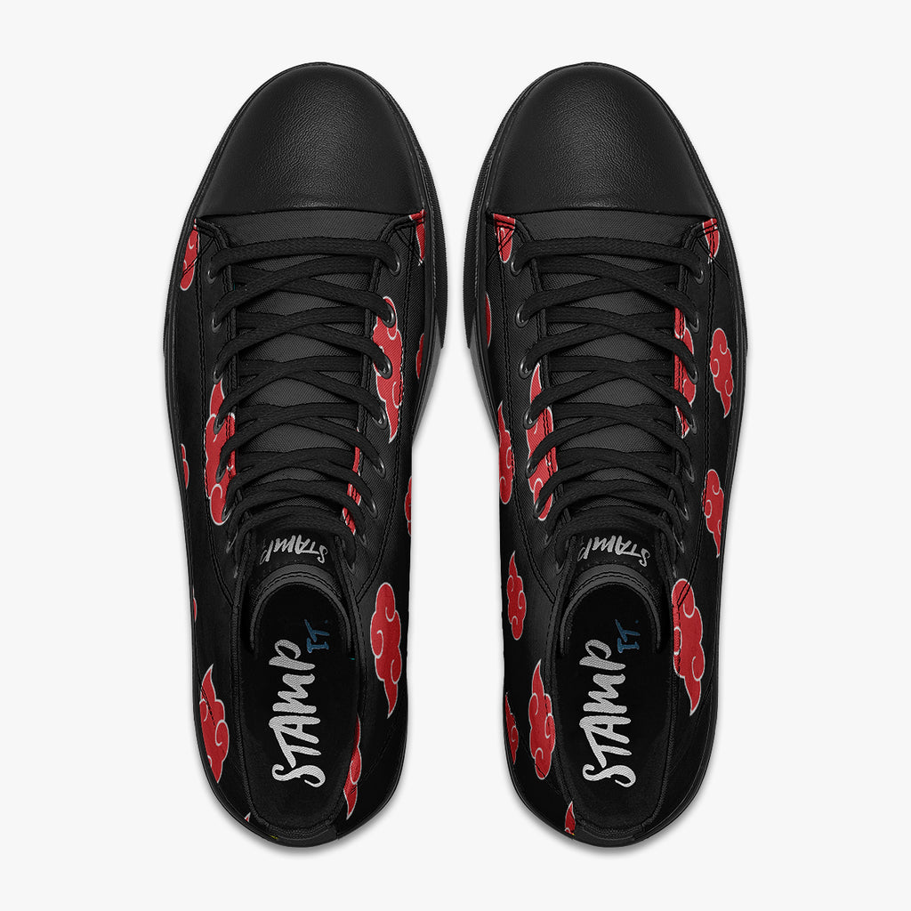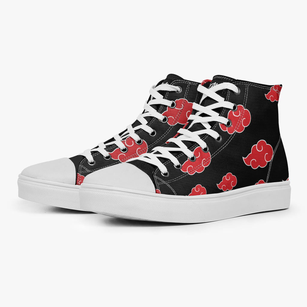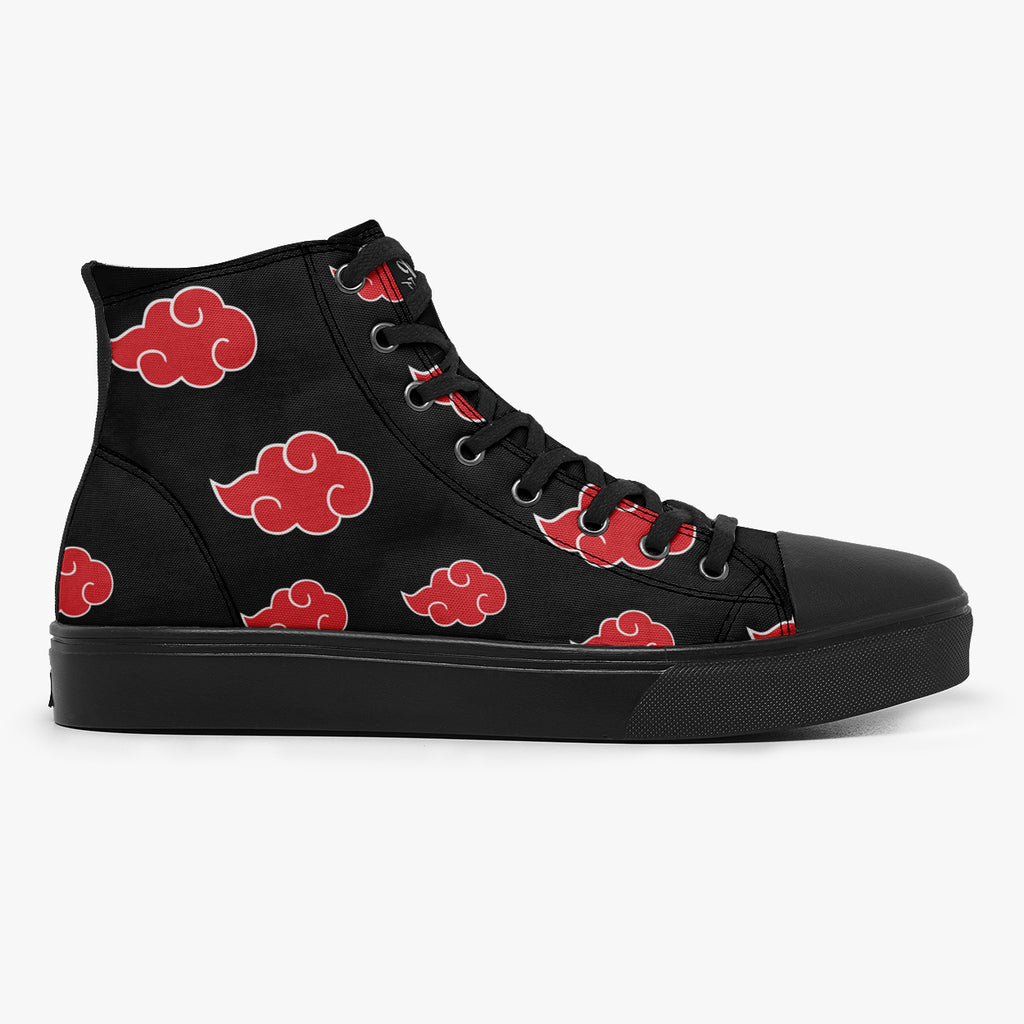 Tênis Cano Alto Preto Naruto Akatsuki Itachi Anime, confeccionado em lona, com cores e estampas exclusivas.