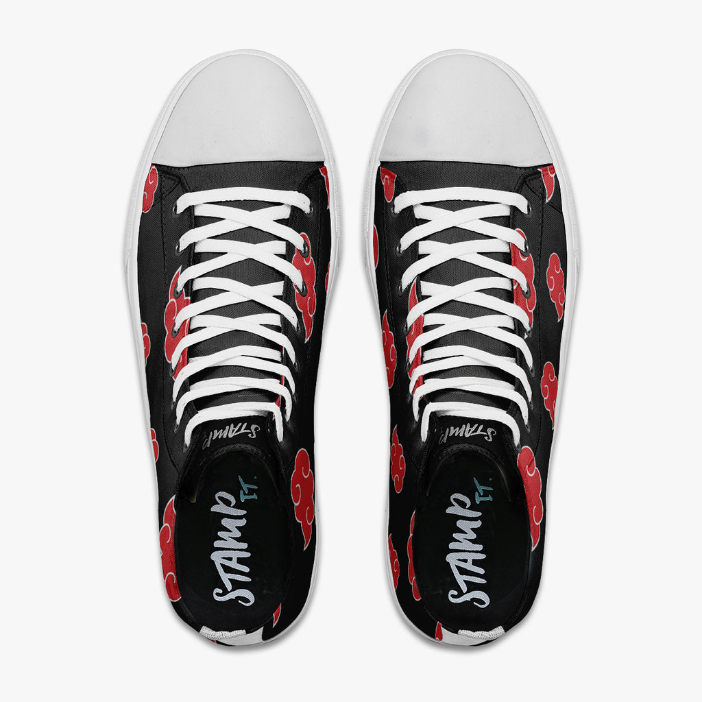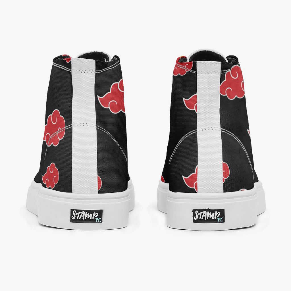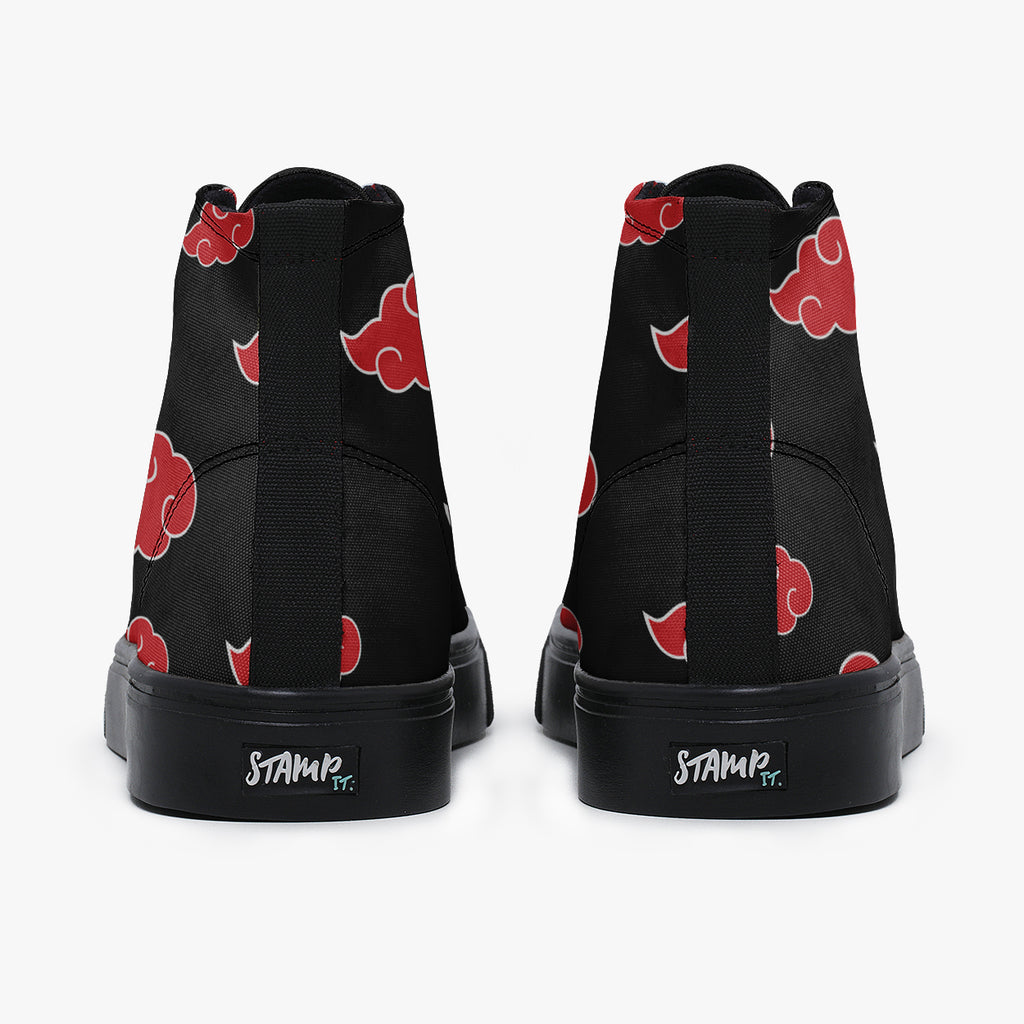 Tênis Cano Alto Preto Naruto Akatsuki Itachi Anime, confeccionado em lona, com cores e estampas exclusivas.