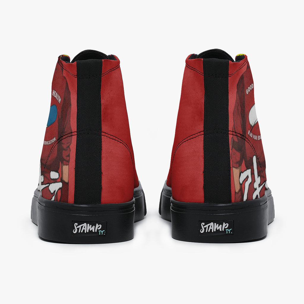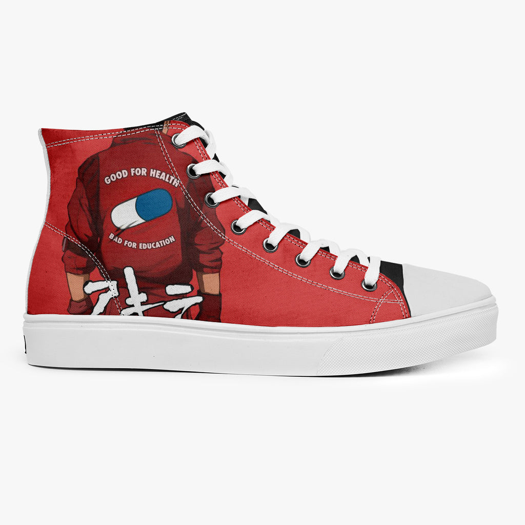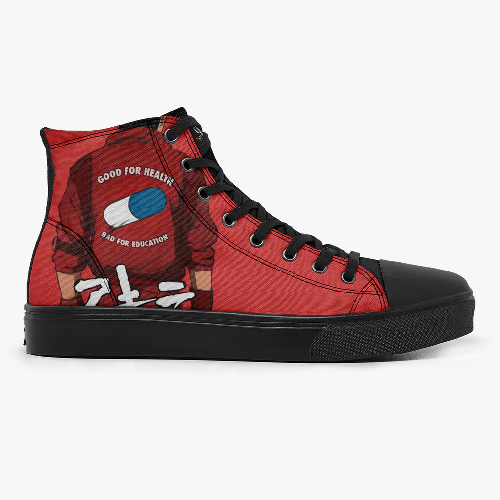 Tênis Cano Alto Vermelho Akira Neo Tokyo Good For Health Anime, confeccionado em lona, com cores e estampas exclusivas.