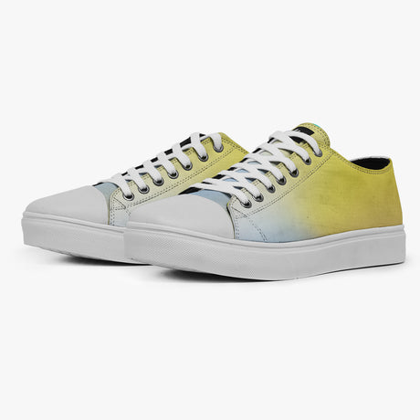 Tênis Cano Baixo Amarelo Manchado Degradê Tie Dye, confeccionado em lona, com cores e estampas exclusivas.