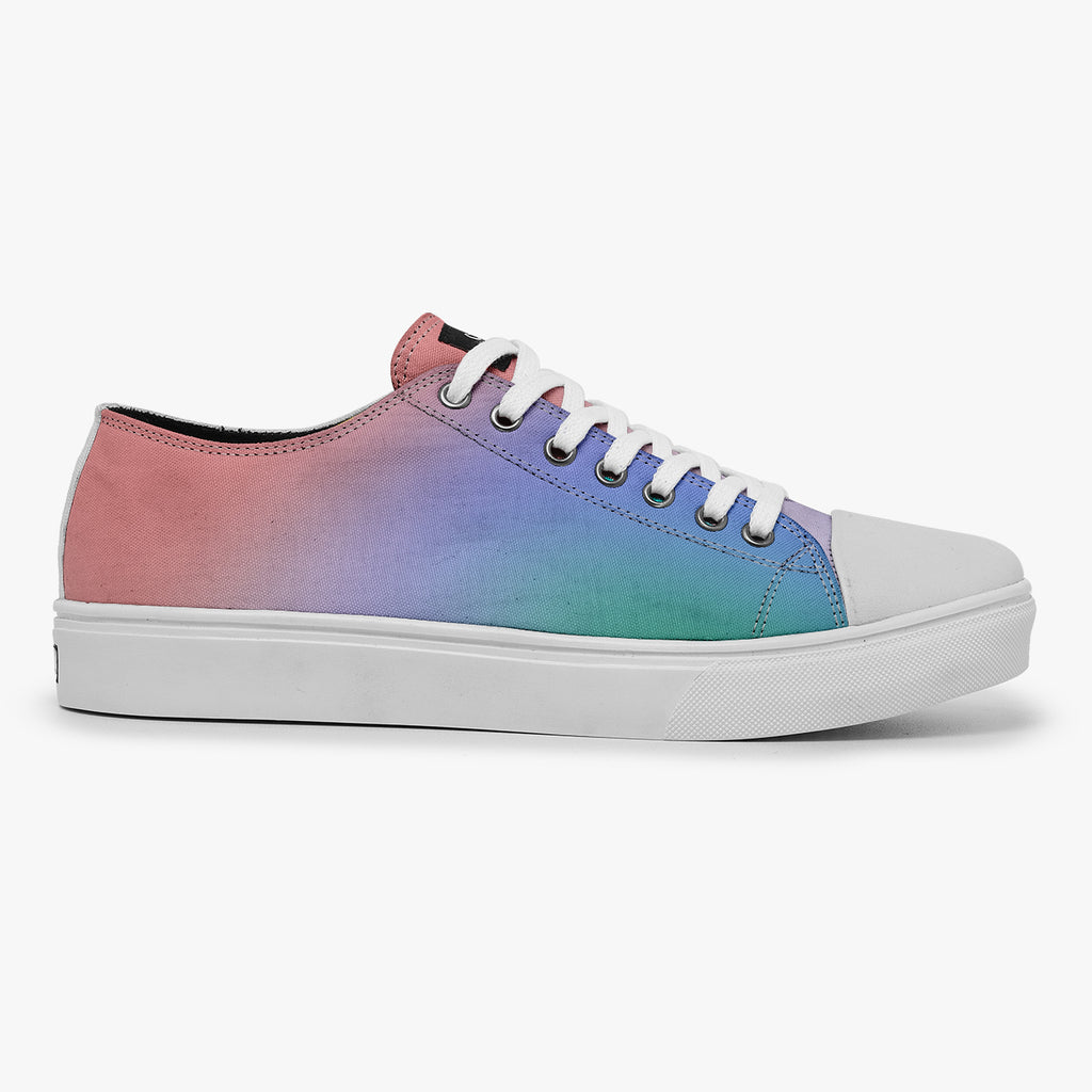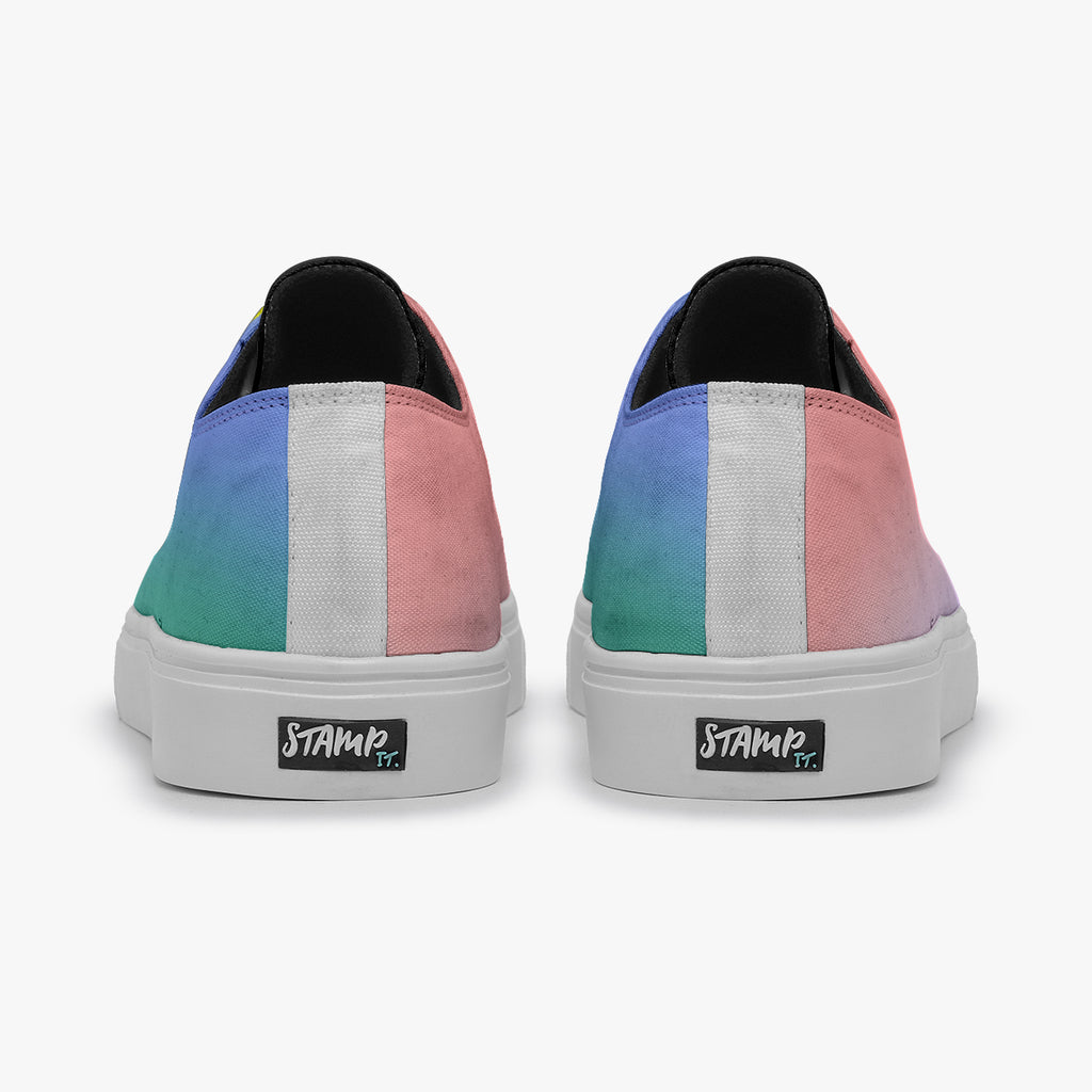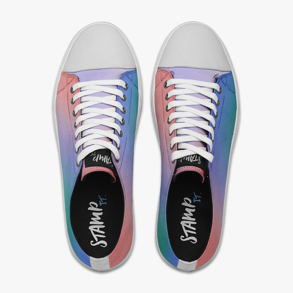 Tênis Cano Baixo Azul Degradê Manchado Tie Dye, confeccionado em lona, com cores e estampas exclusivas.