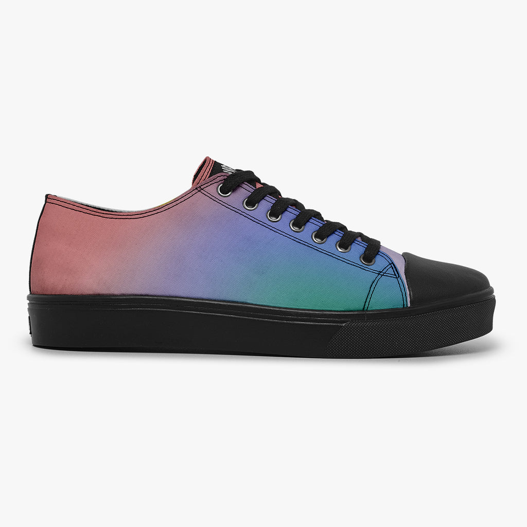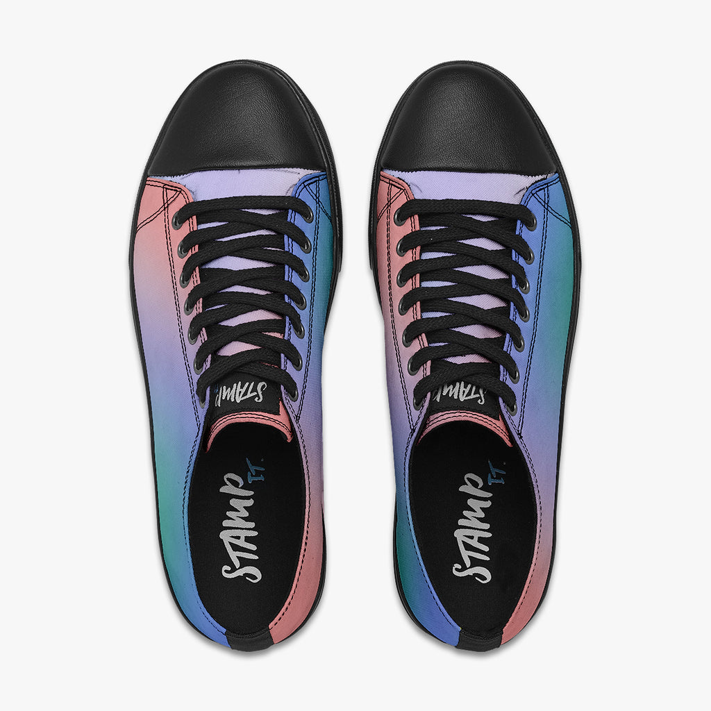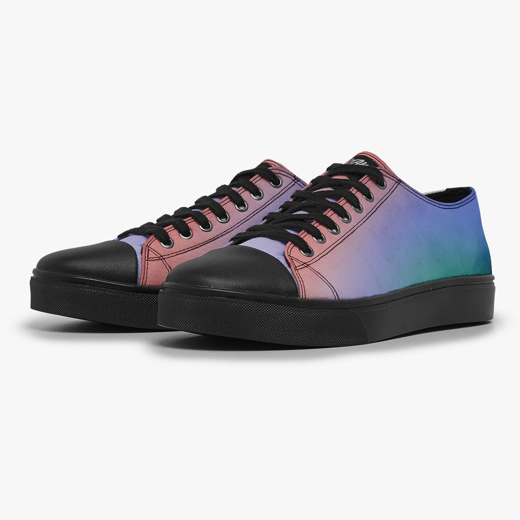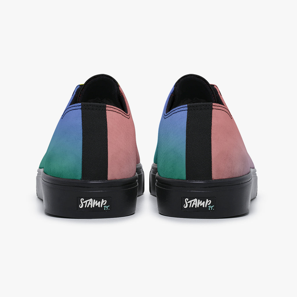Tênis Cano Baixo Azul Degradê Manchado Tie Dye, confeccionado em lona, com cores e estampas exclusivas.