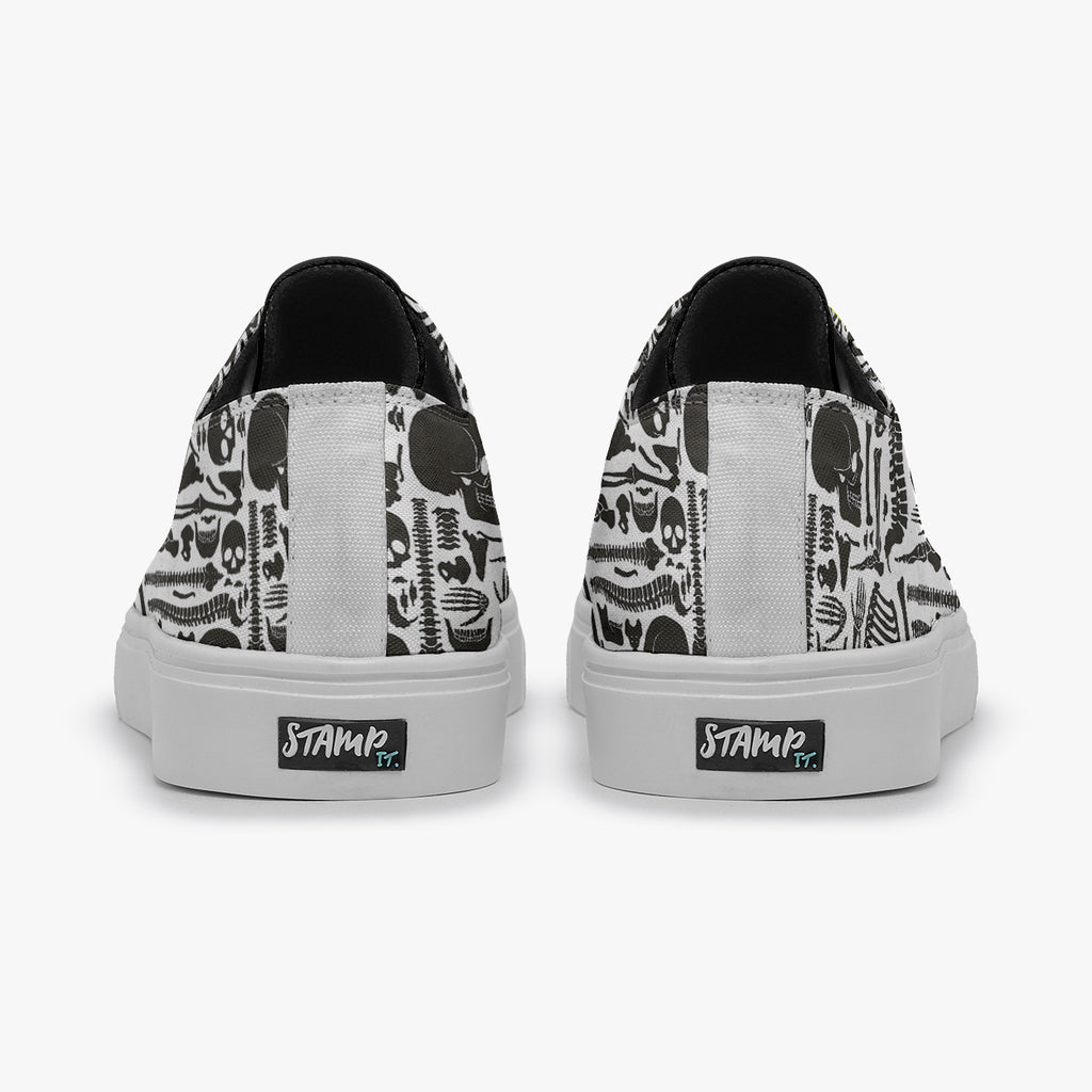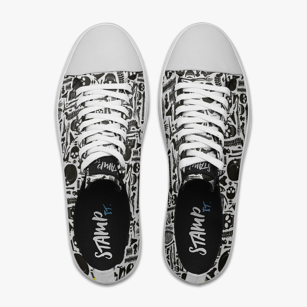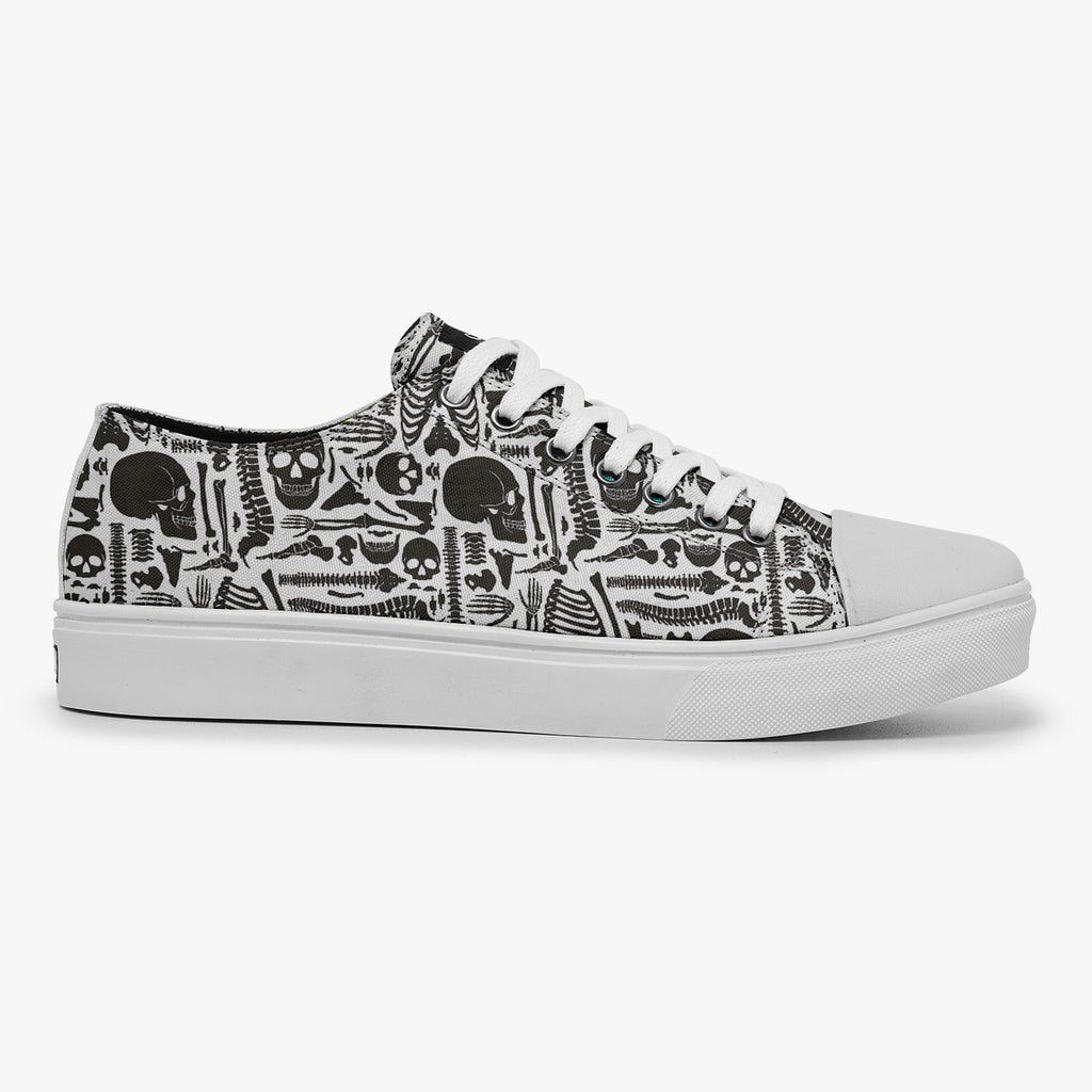 Tênis Cano Baixo Branco Caveiras Esqueleto Em Preto Caveiras, confeccionado em lona, com cores e estampas exclusivas.