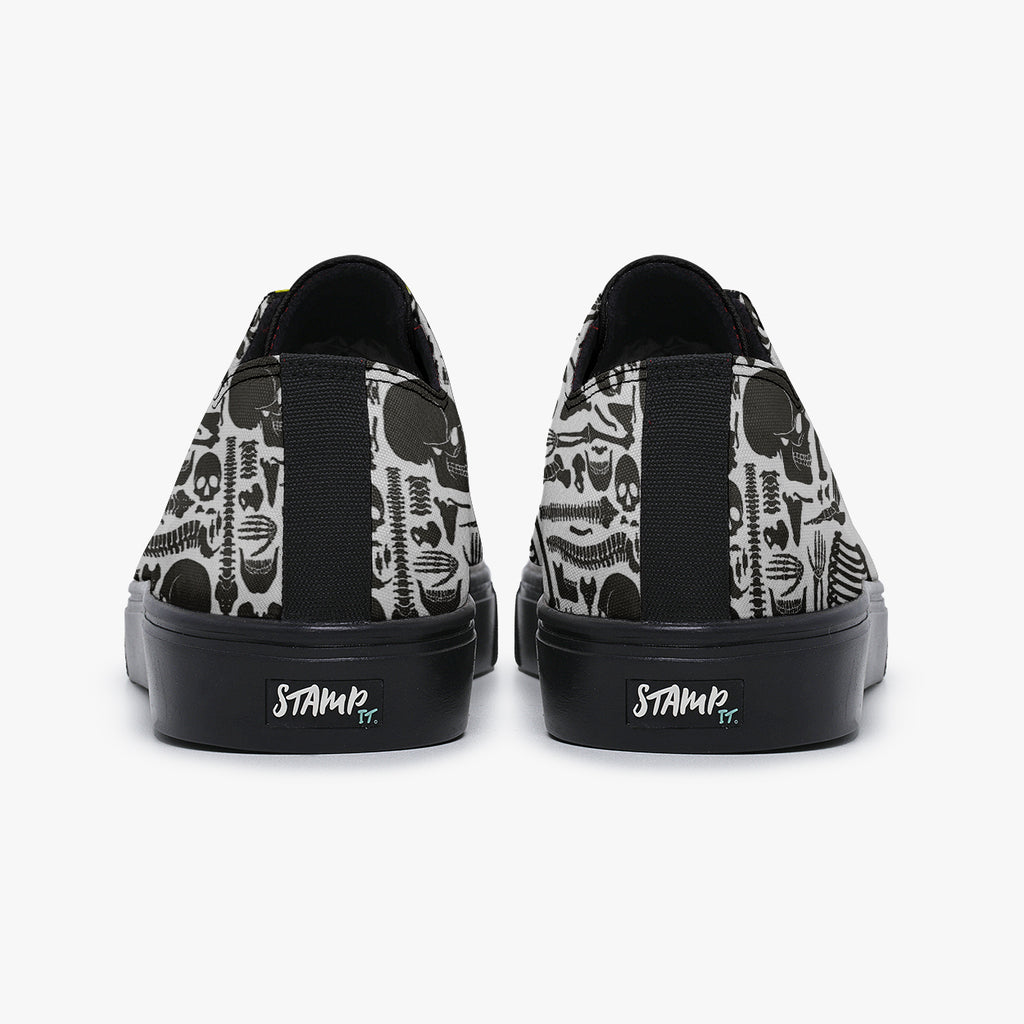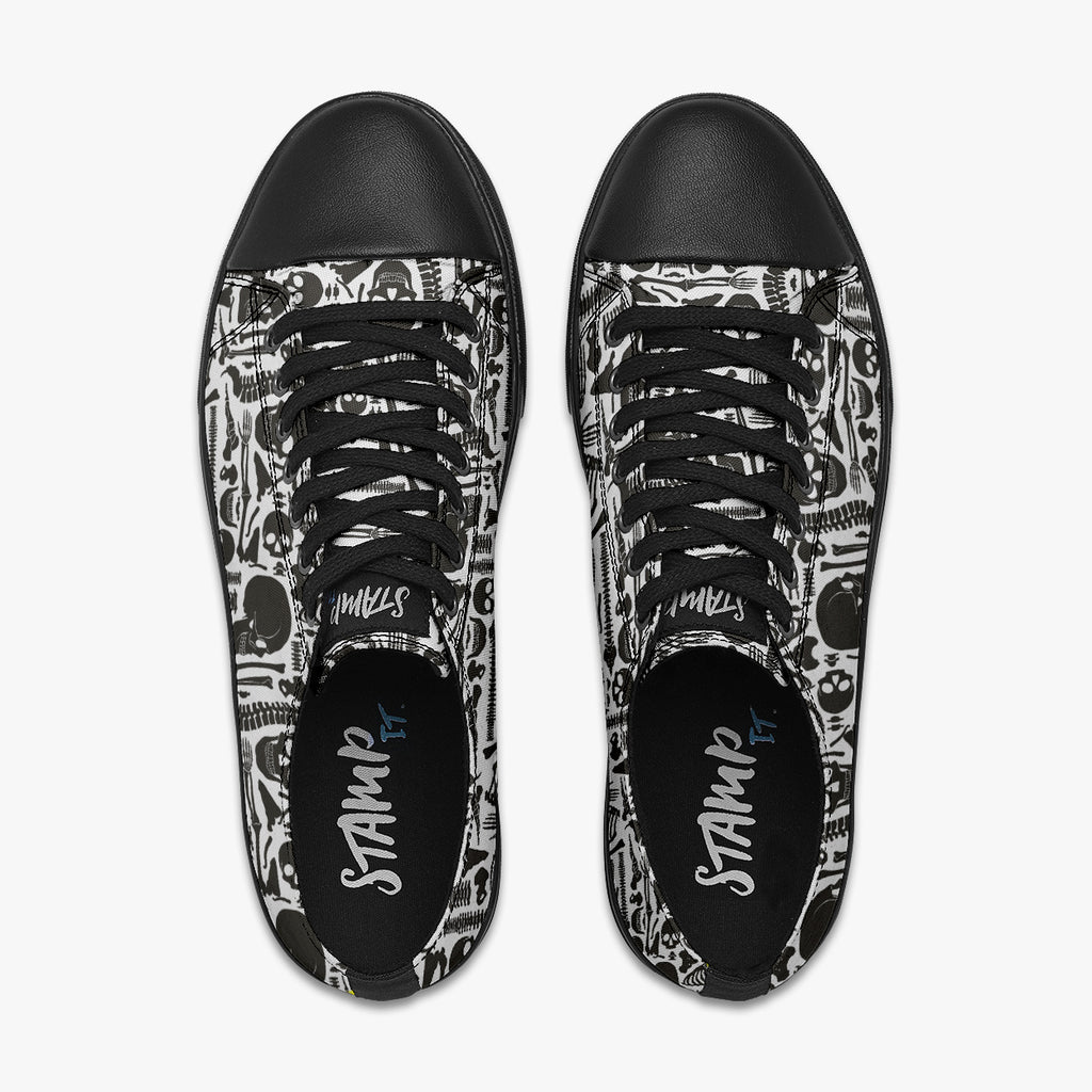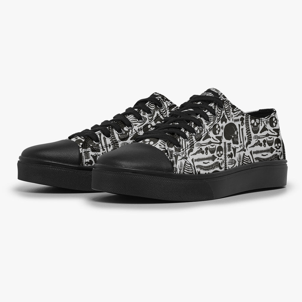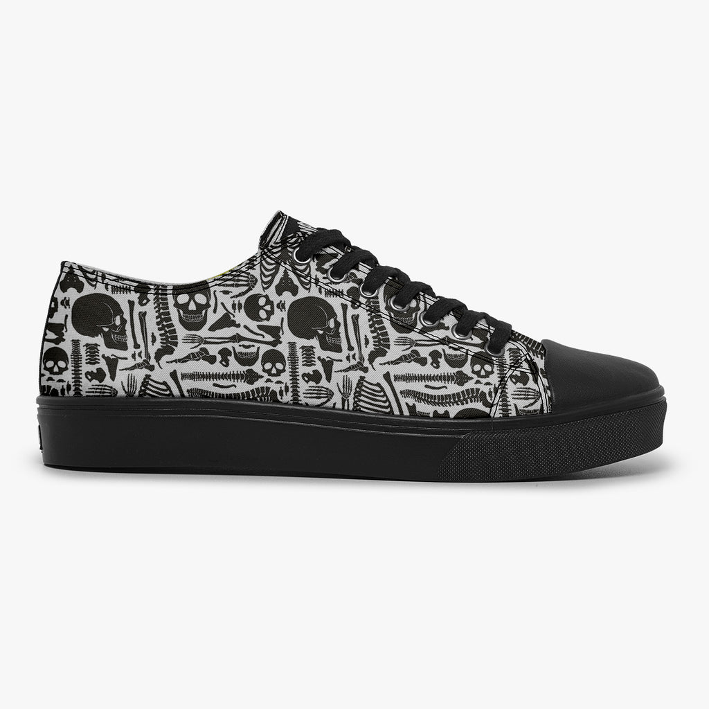 Tênis Cano Baixo Branco Caveiras Esqueleto Em Preto Caveiras, confeccionado em lona, com cores e estampas exclusivas.
