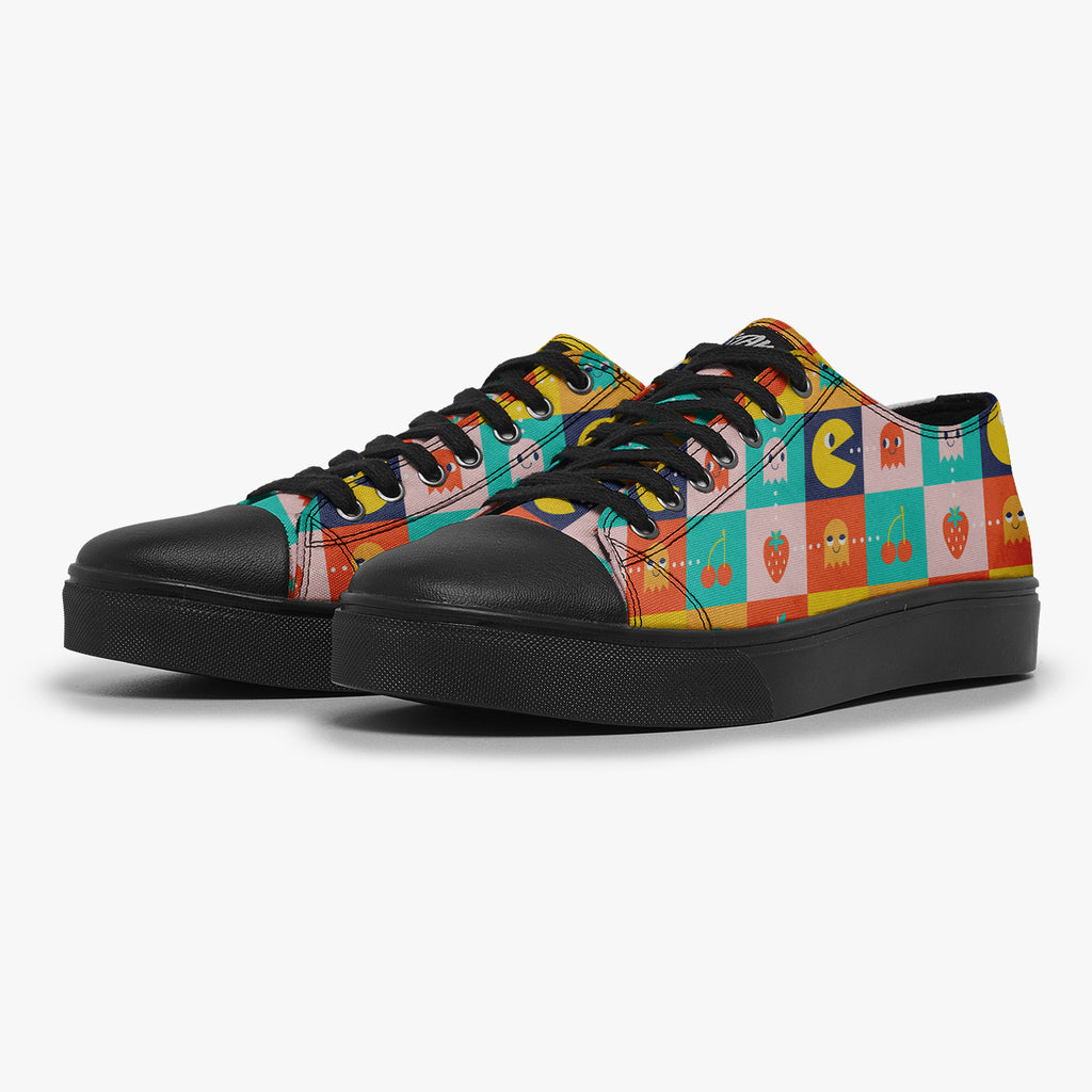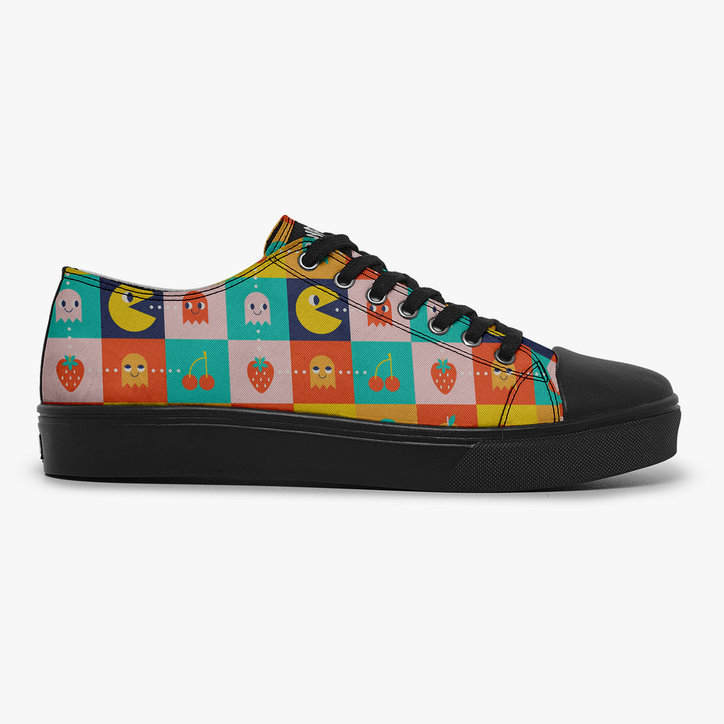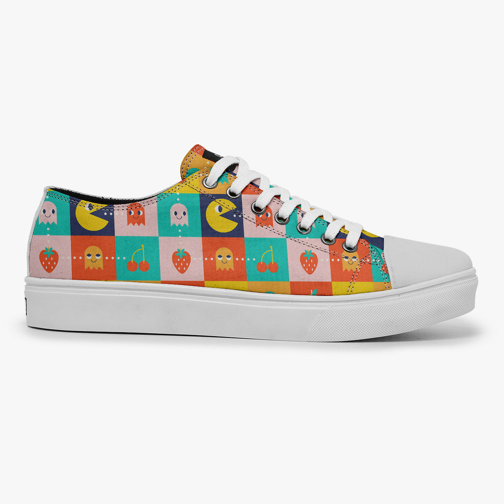 Tênis Cano Baixo Colorido Pac Man Frutas Fantasma Games, confeccionado em lona, com cores e estampas exclusivas.