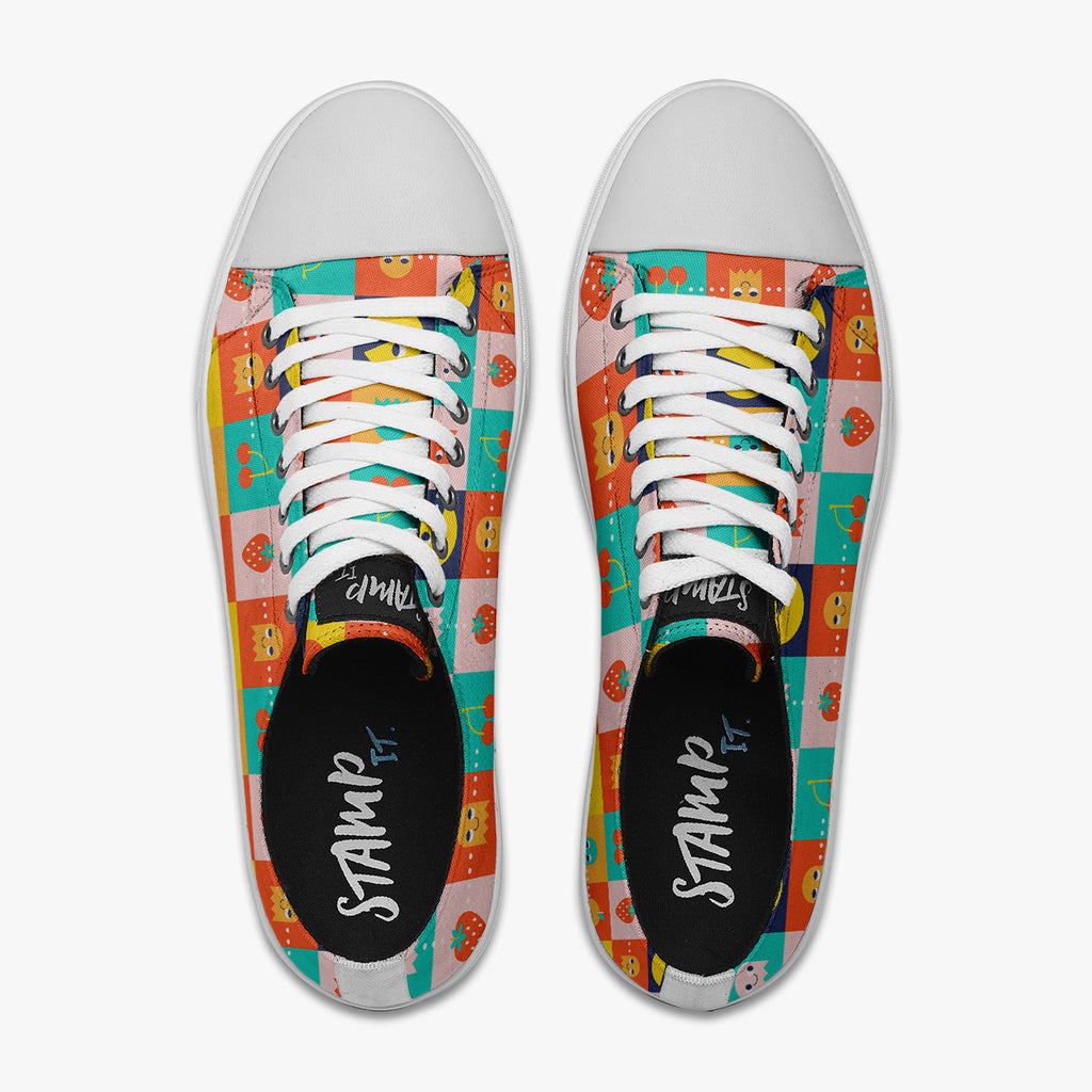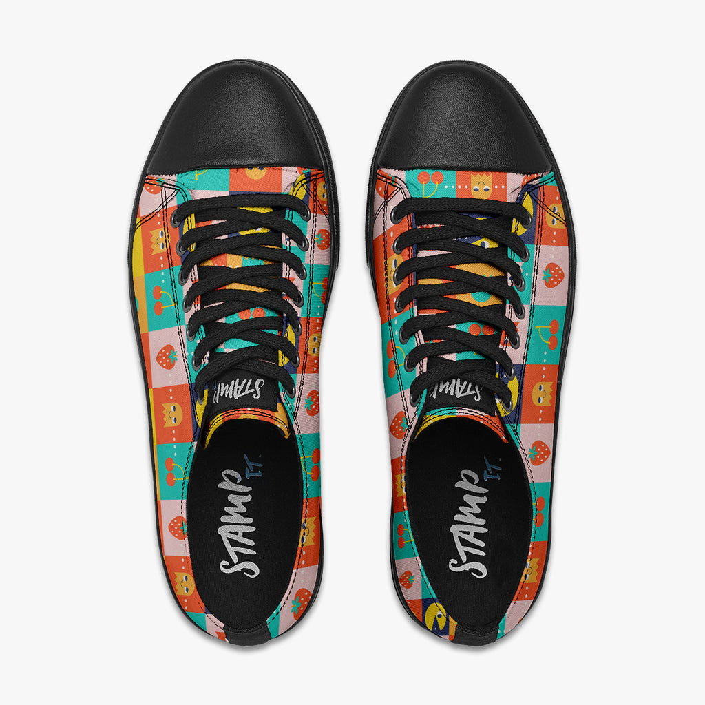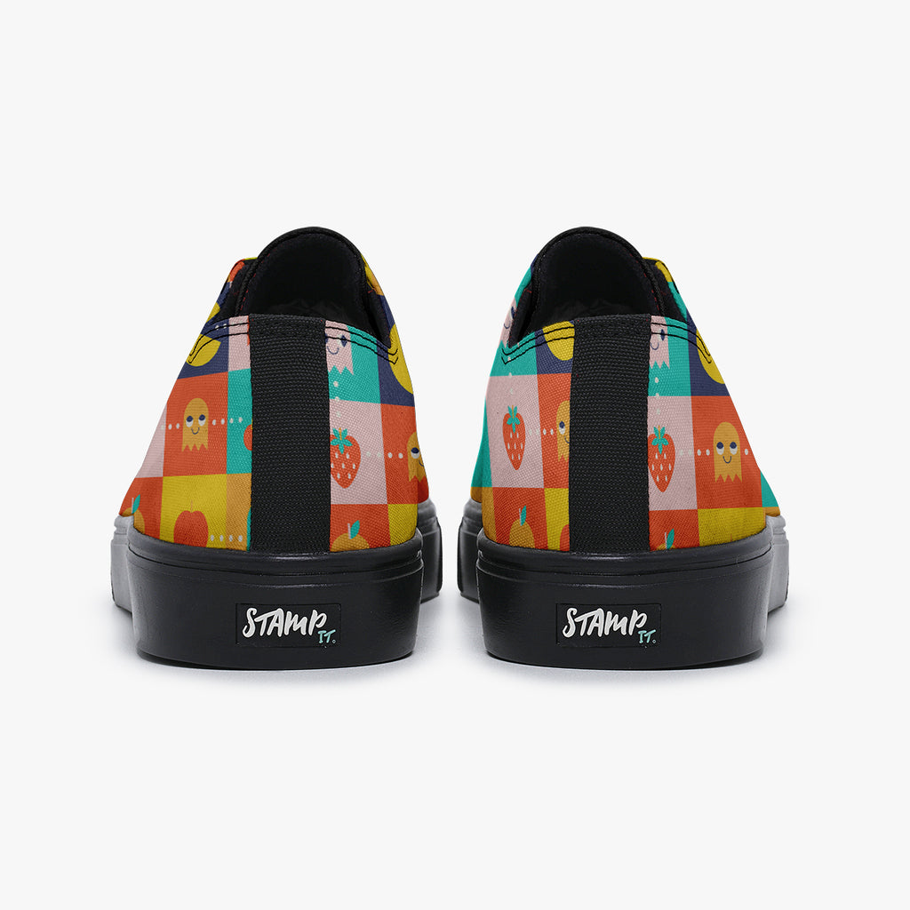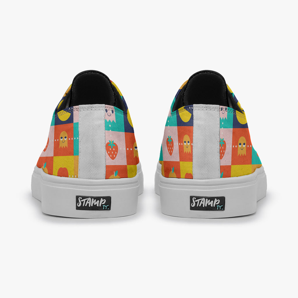 Tênis Cano Baixo Colorido Pac Man Frutas Fantasma Games, confeccionado em lona, com cores e estampas exclusivas.