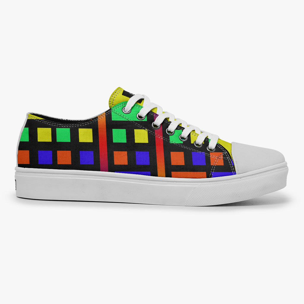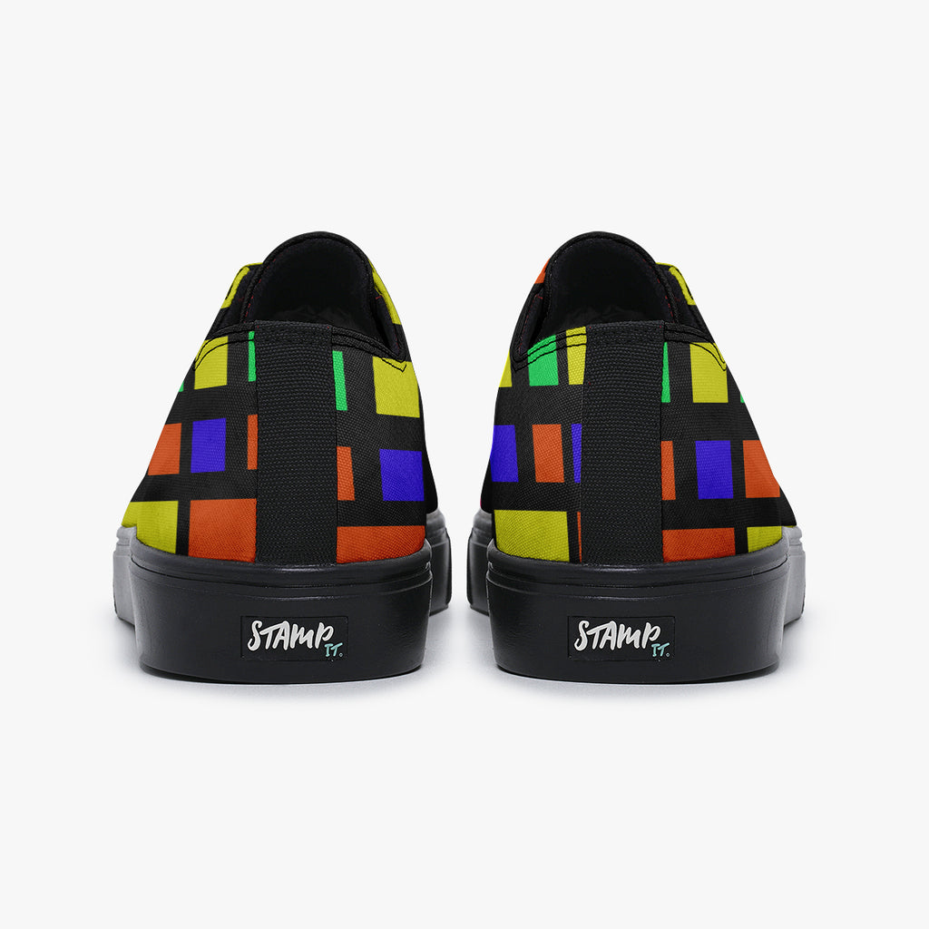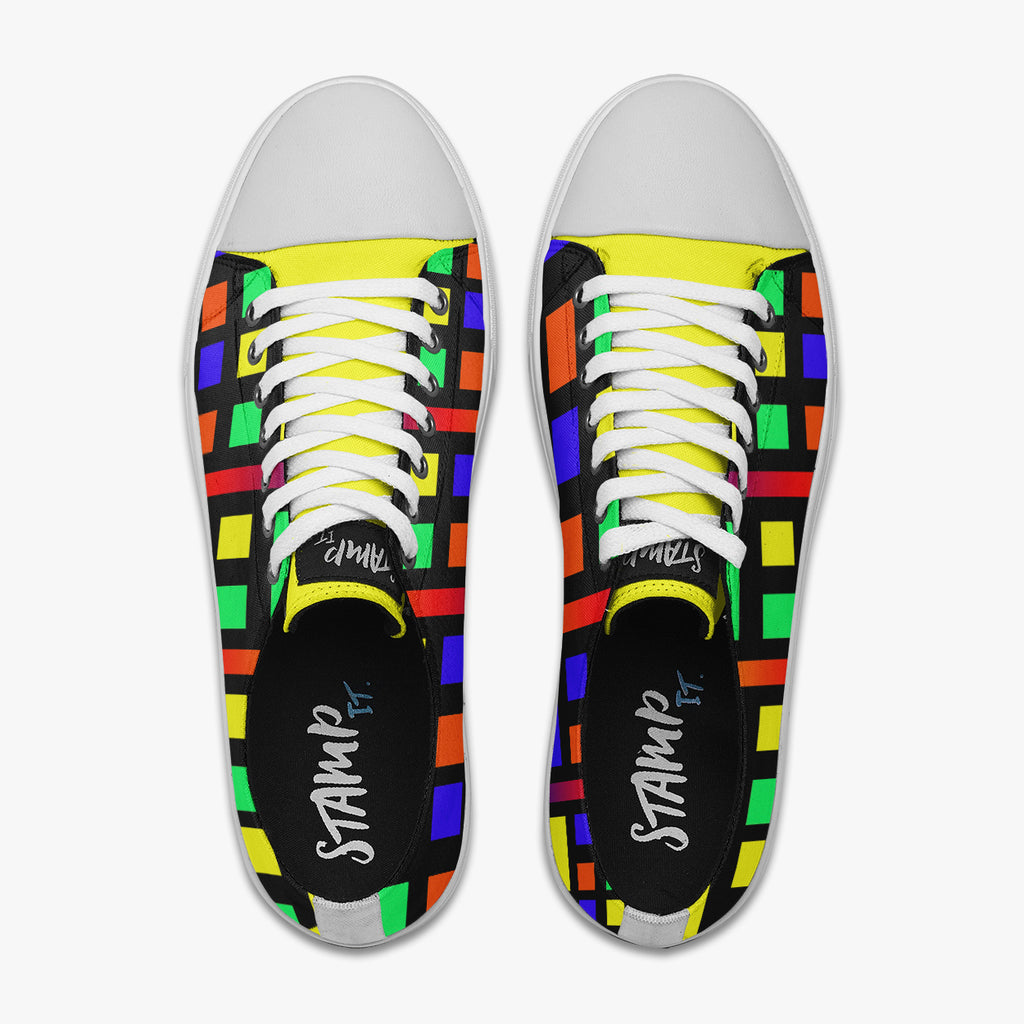 Tênis Cano Baixo Geométrico Abstrato Quadriláteros Abstrato, confeccionado em lona, com cores e estampas exclusivas.