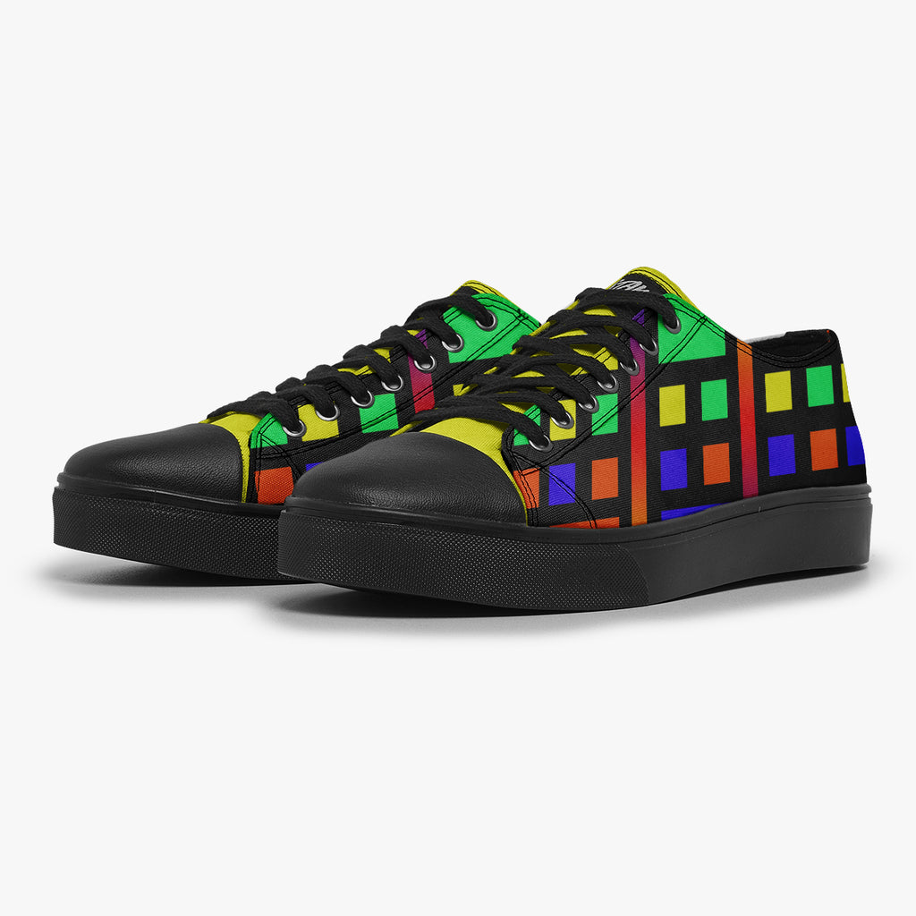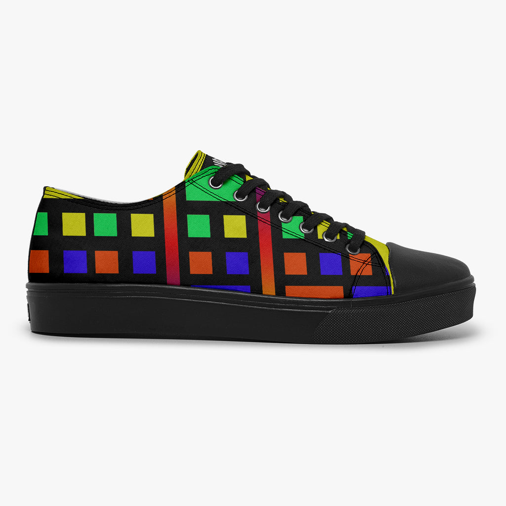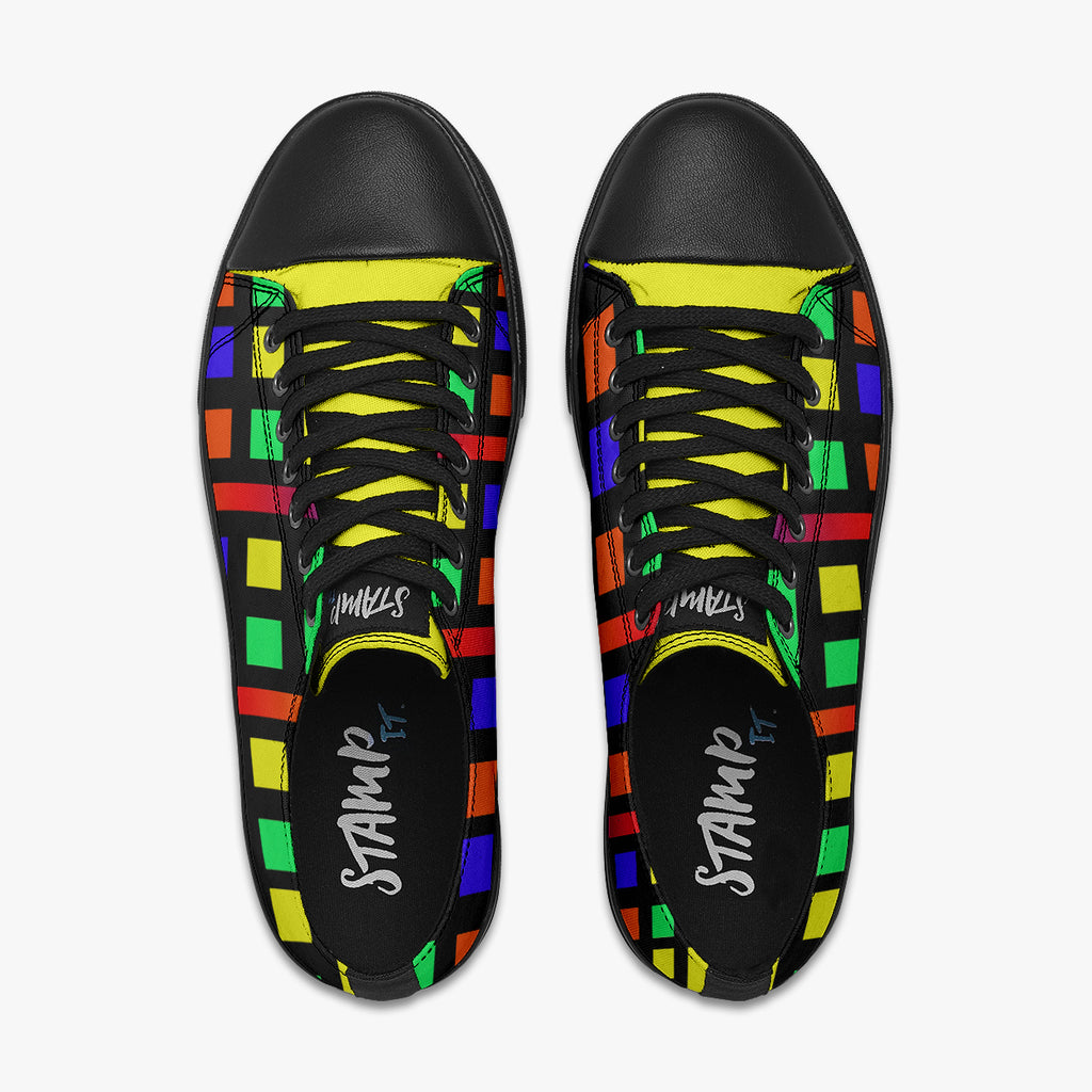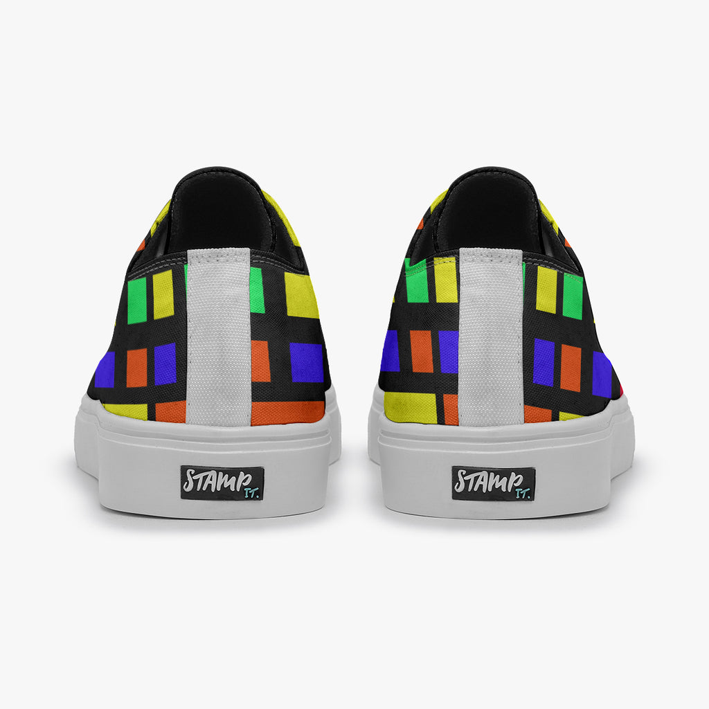 Tênis Cano Baixo Geométrico Abstrato Quadriláteros Abstrato, confeccionado em lona, com cores e estampas exclusivas.