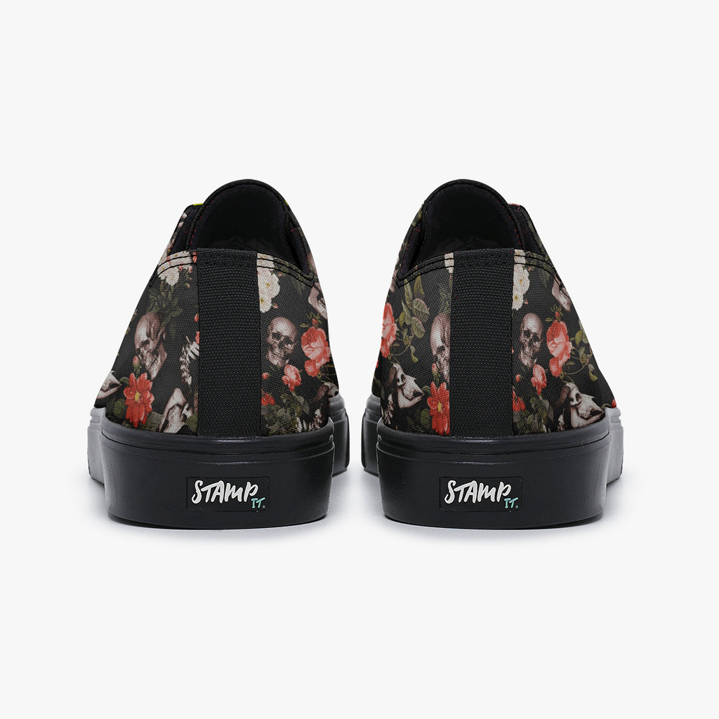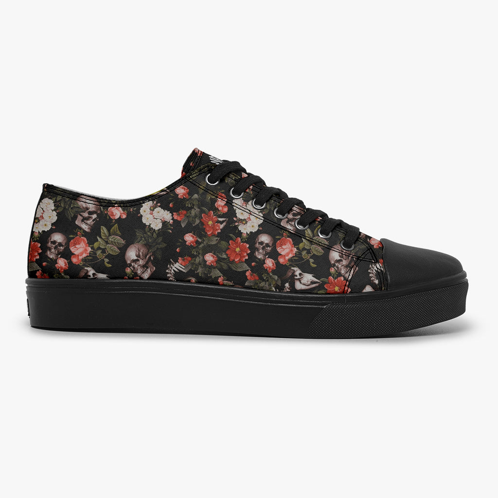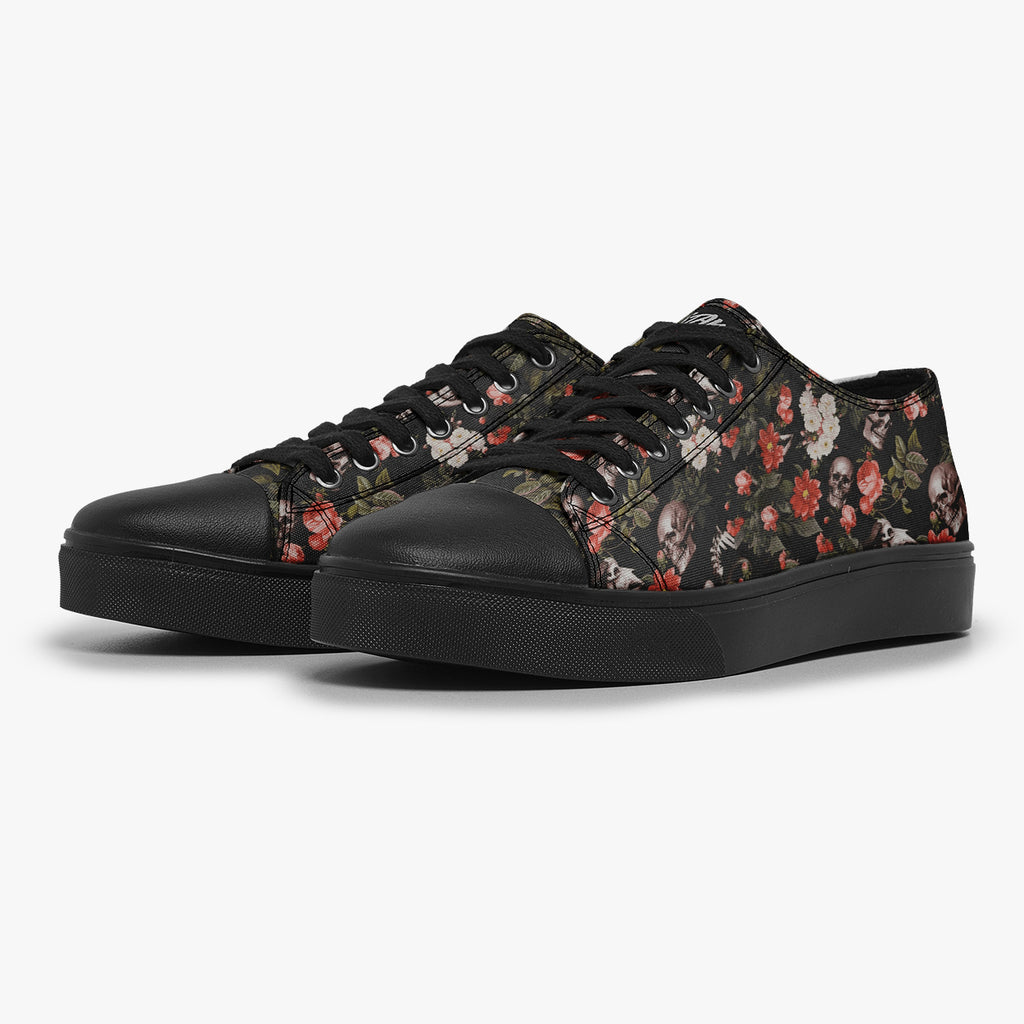 Tênis Cano Baixo Preto Caveiras Crânio Flores Caveiras, confeccionado em lona, com cores e estampas exclusivas.