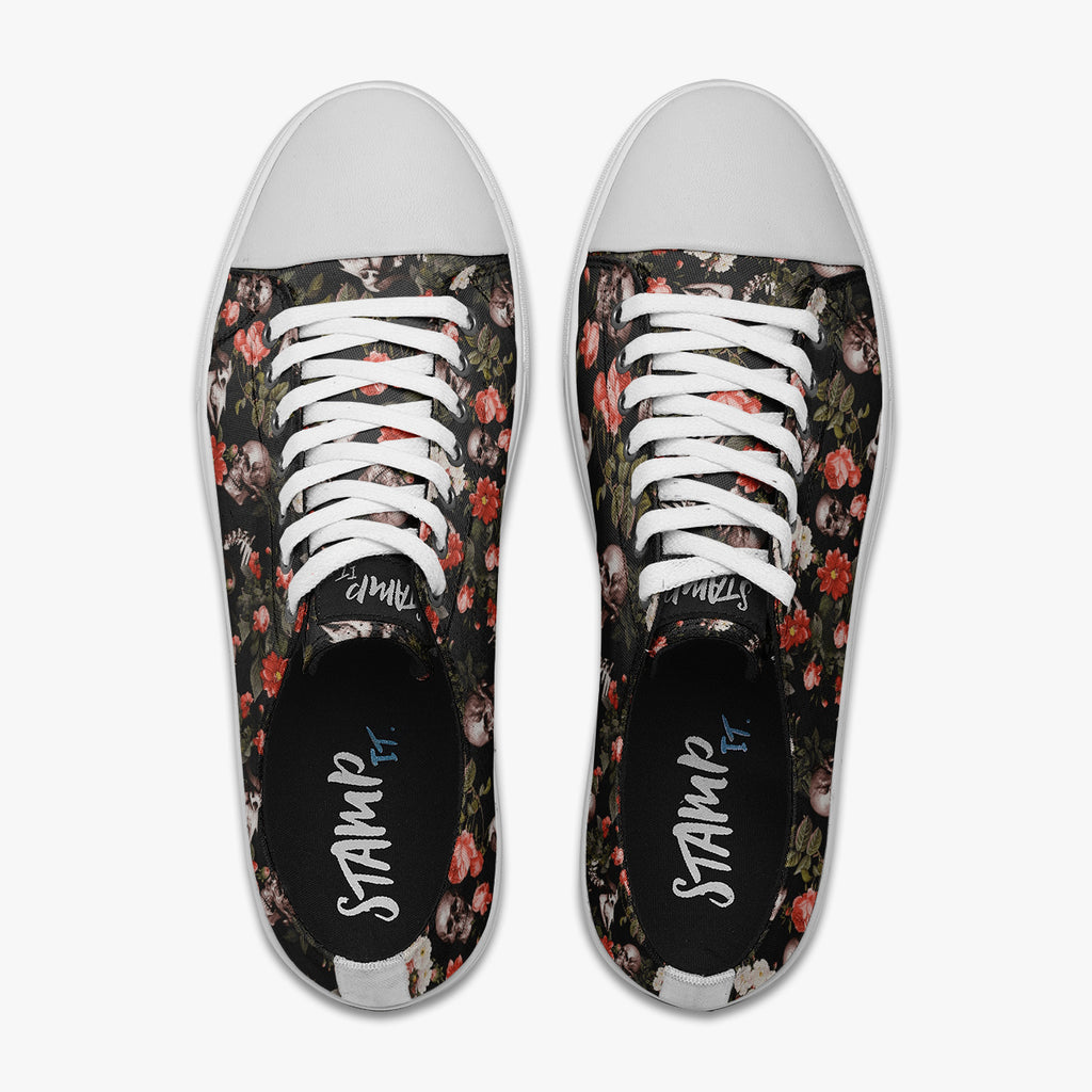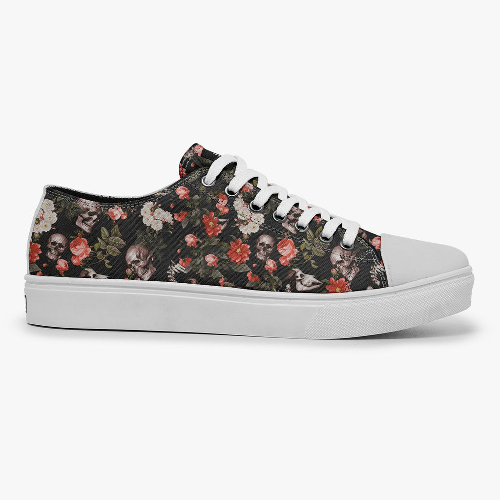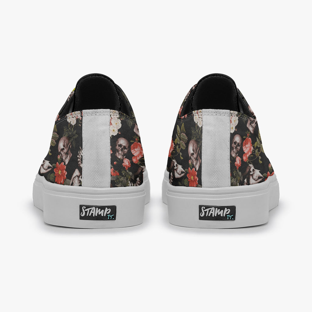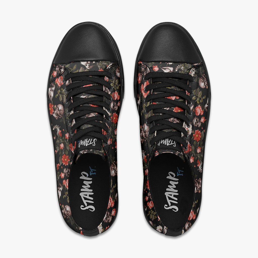 Tênis Cano Baixo Preto Caveiras Crânio Flores Caveiras, confeccionado em lona, com cores e estampas exclusivas.