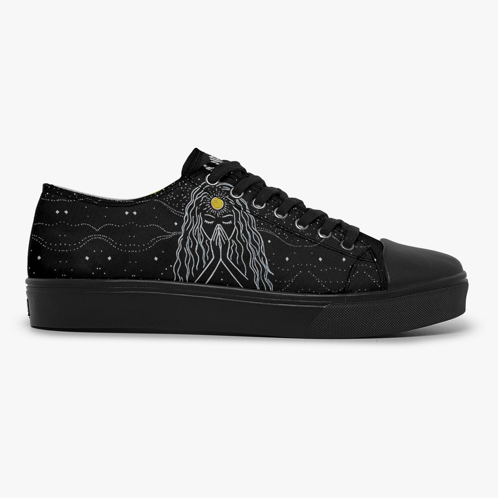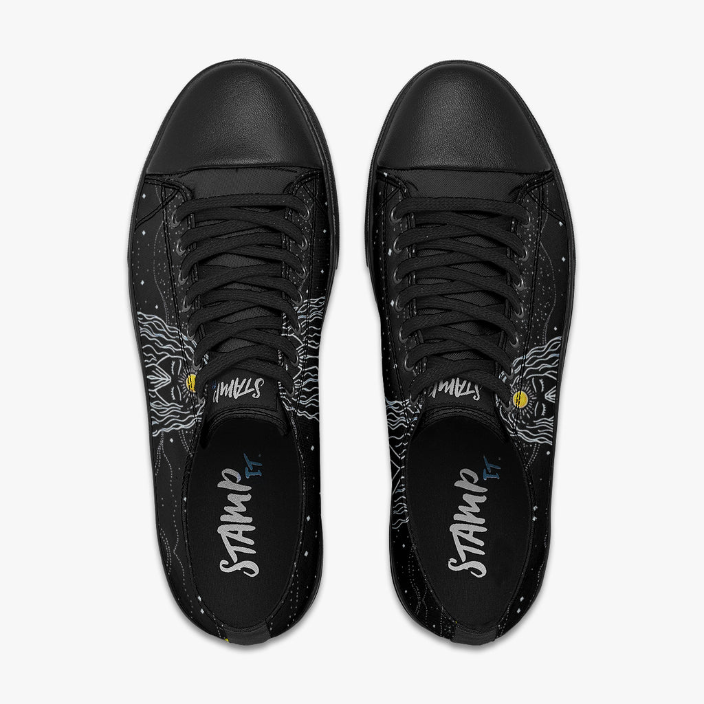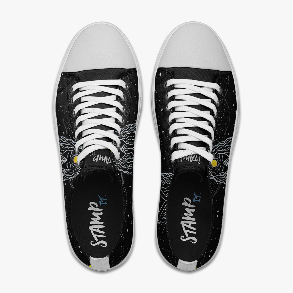 Tênis Cano Baixo Preto Mulher Oração Astral Abstrato, confeccionado em lona, com cores e estampas exclusivas.