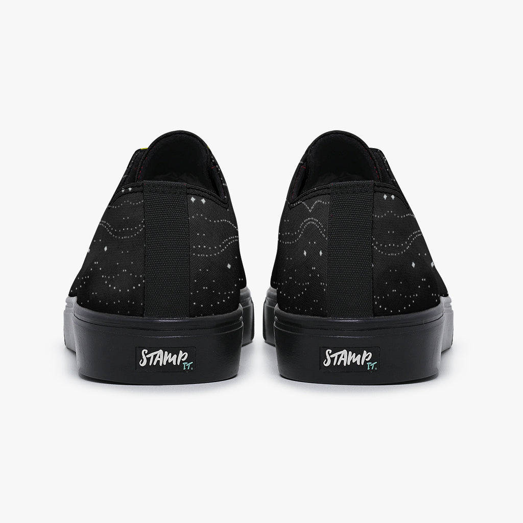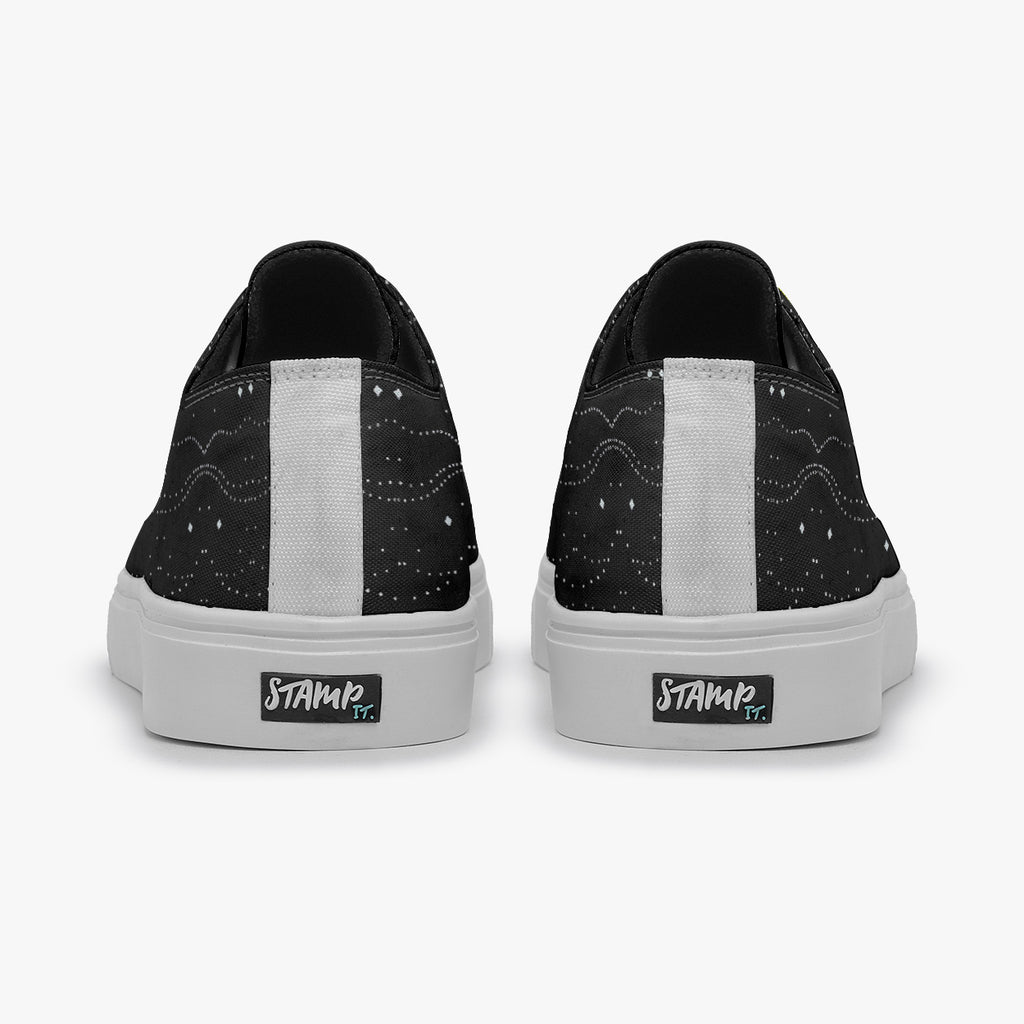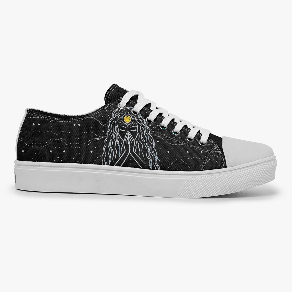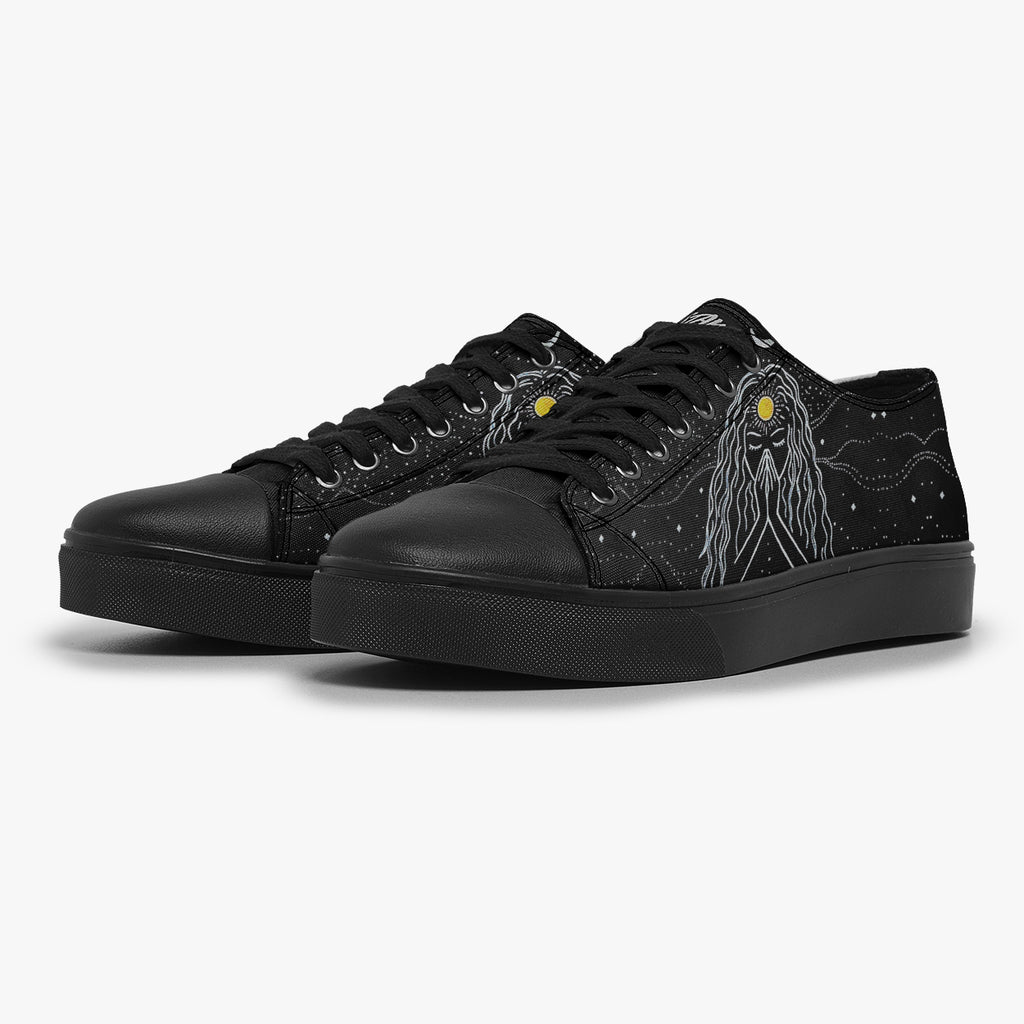 Tênis Cano Baixo Preto Mulher Oração Astral Abstrato, confeccionado em lona, com cores e estampas exclusivas.