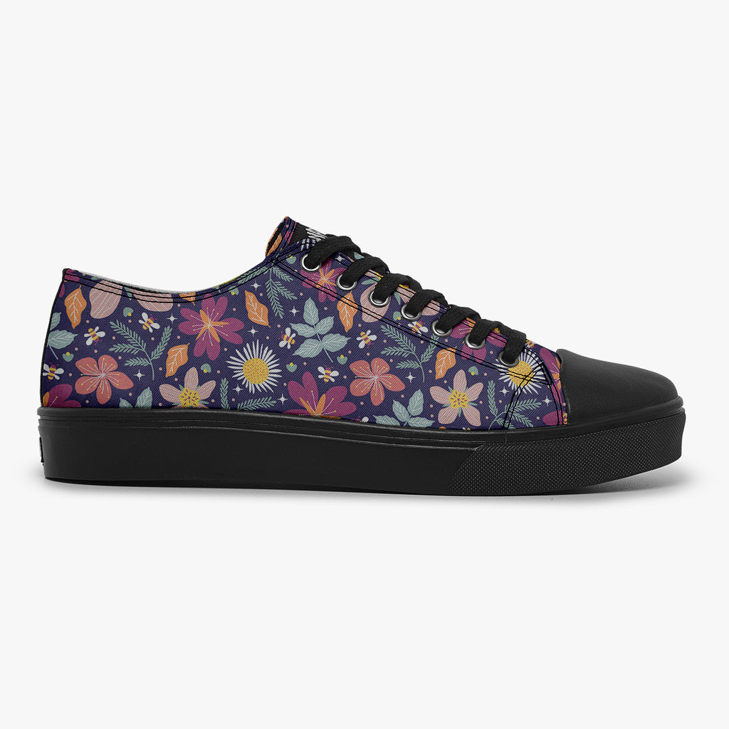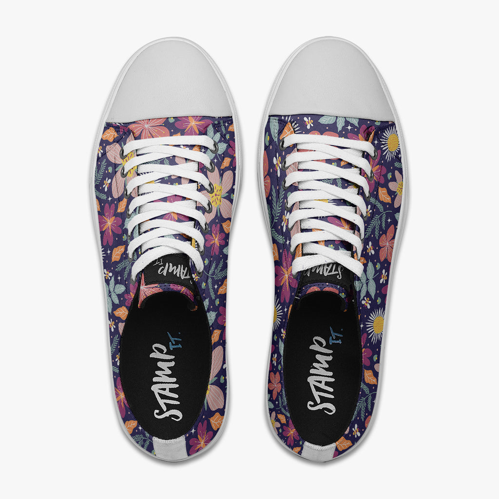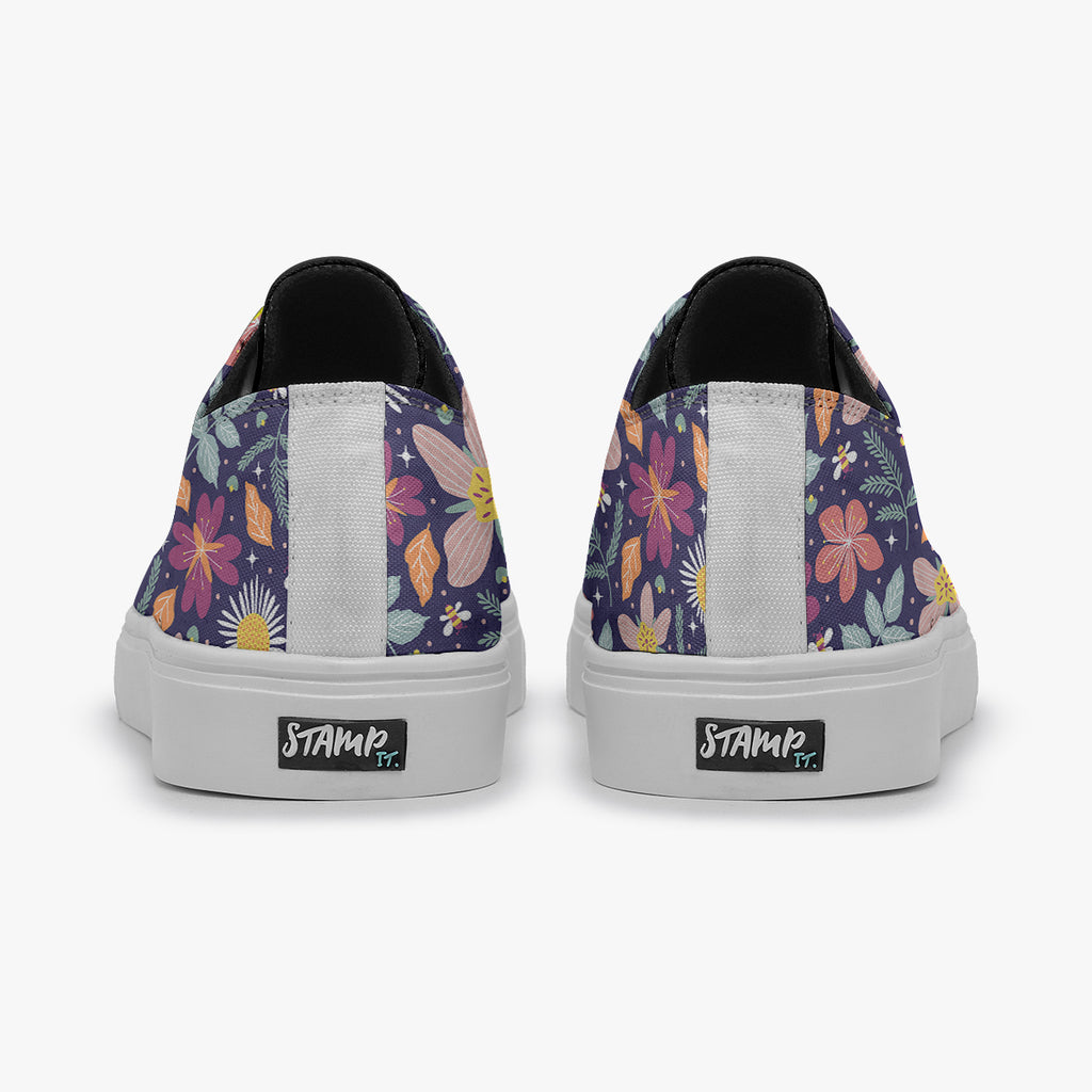 Tênis Cano Baixo Roxo Abelhas Estrelas Flores e Folhas, confeccionado em lona, com cores e estampas exclusivas.