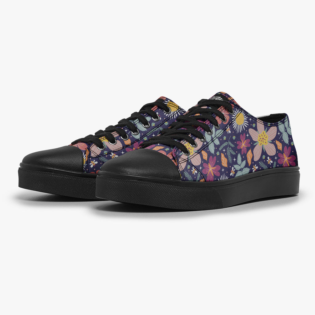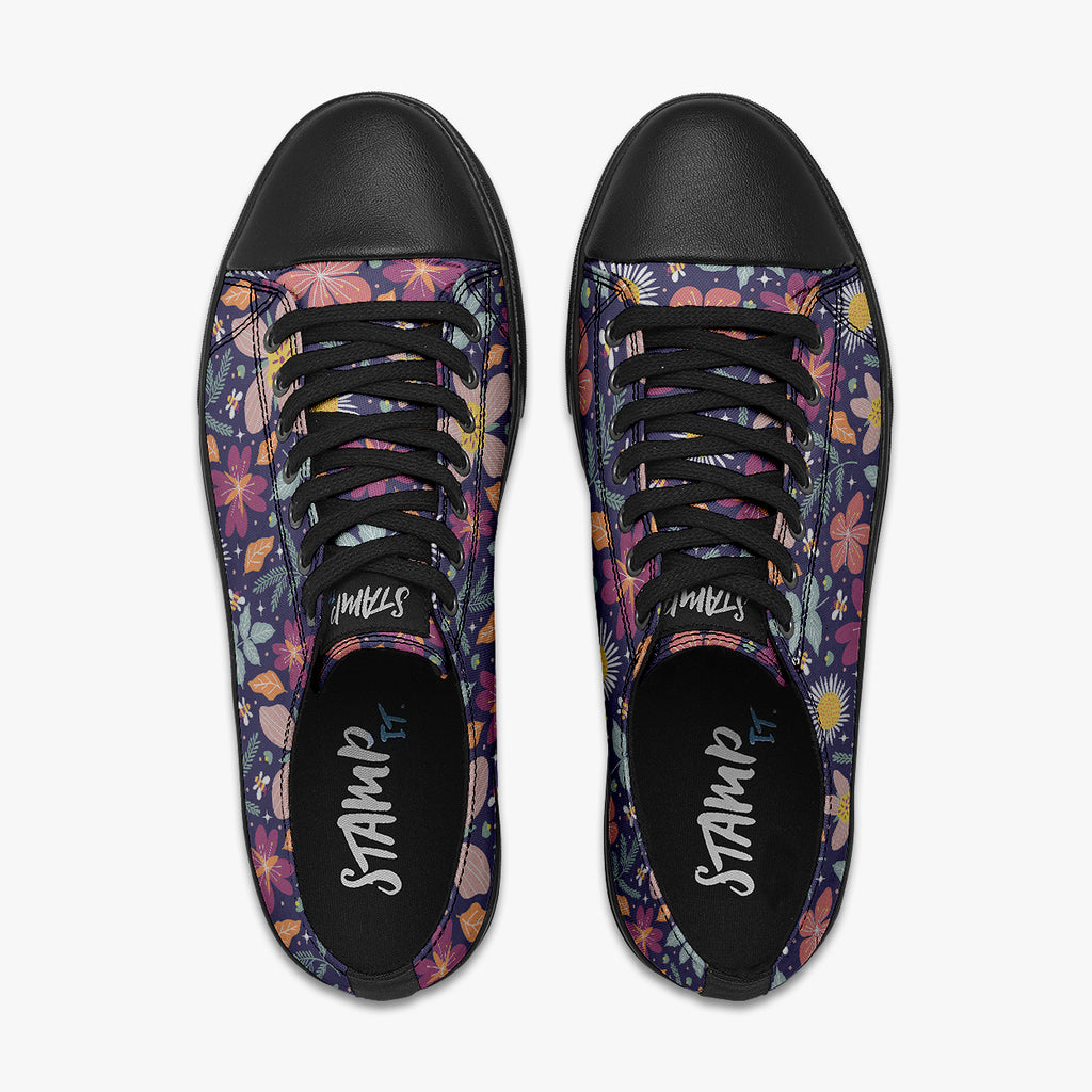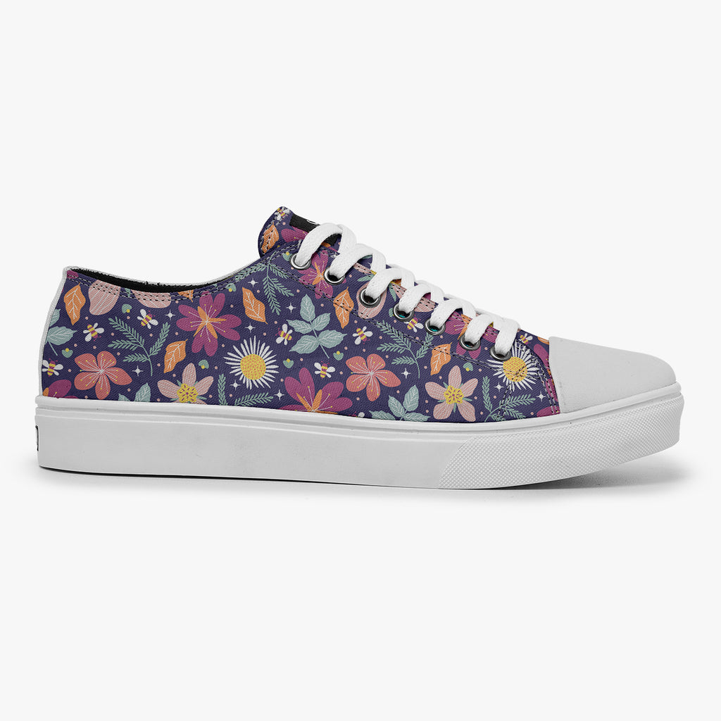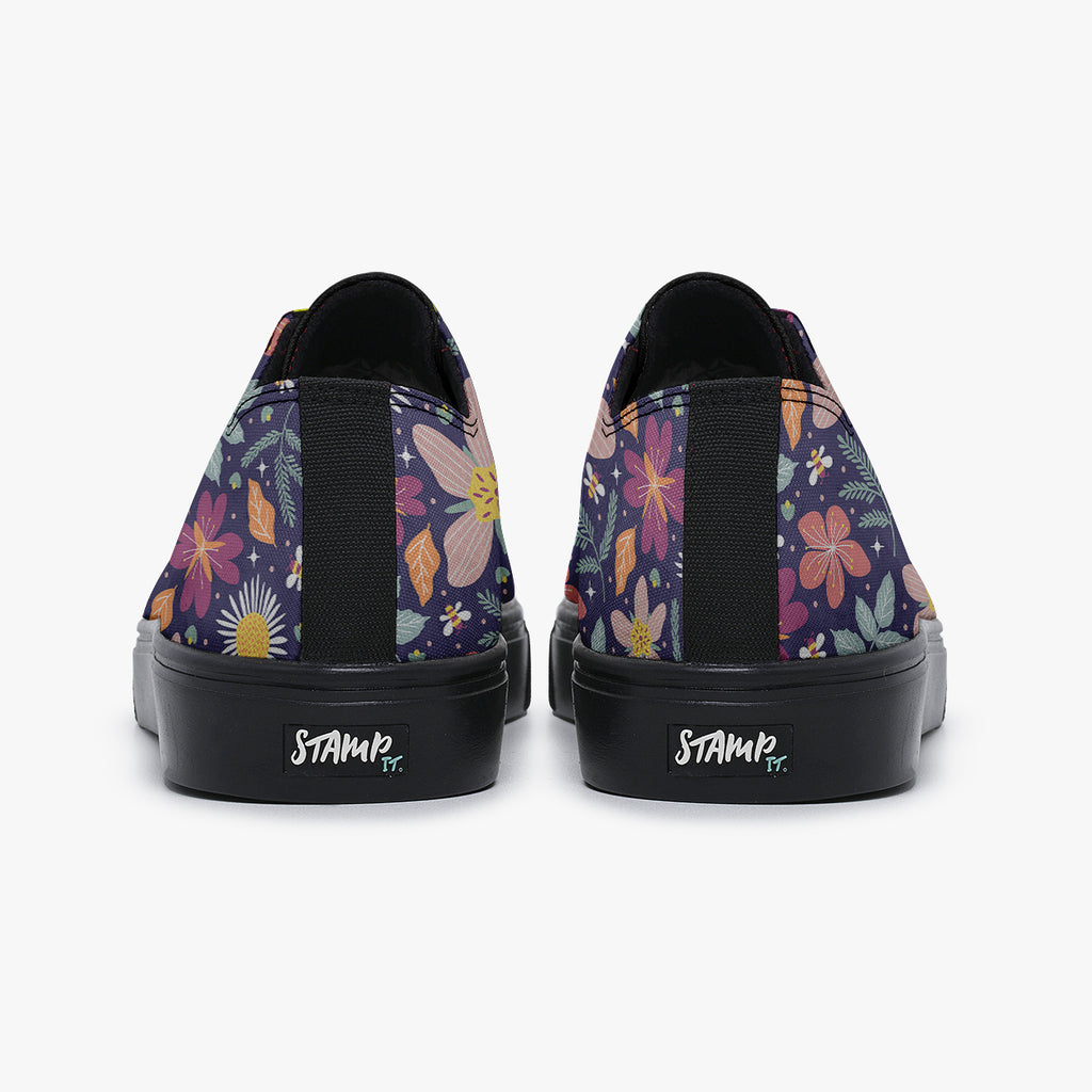 Tênis Cano Baixo Roxo Abelhas Estrelas Flores e Folhas, confeccionado em lona, com cores e estampas exclusivas.