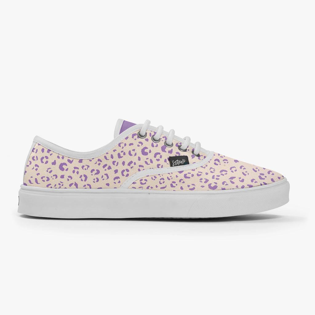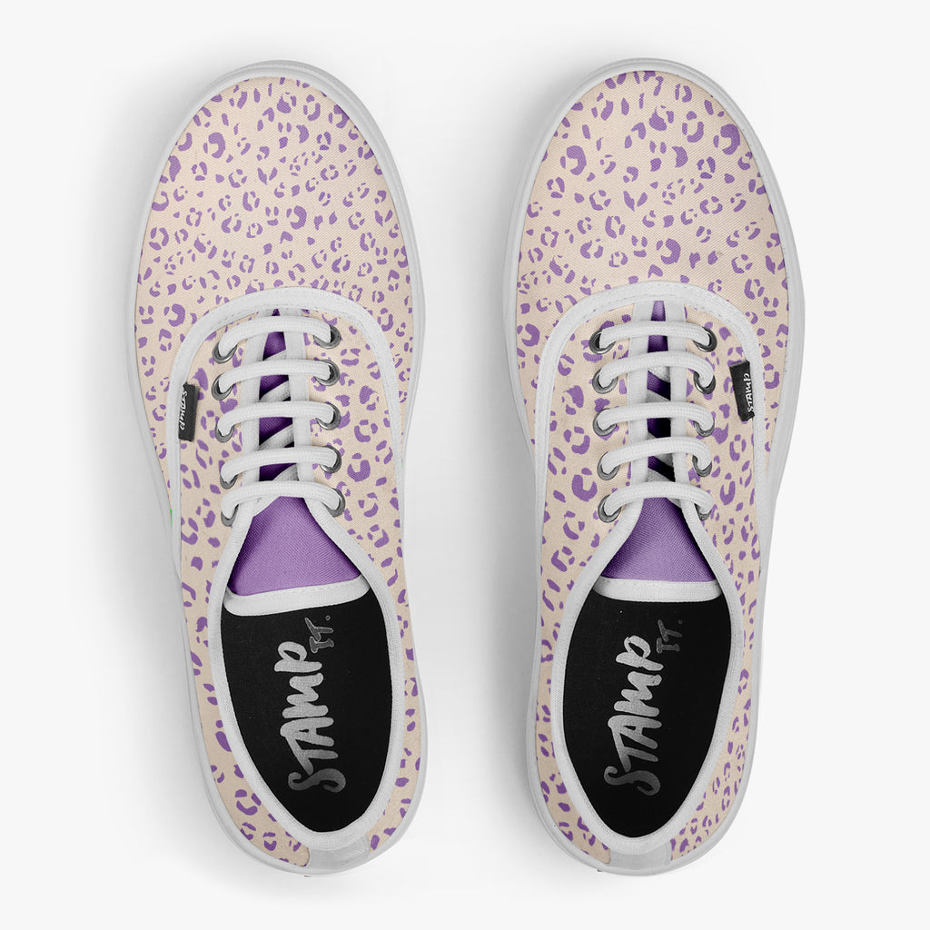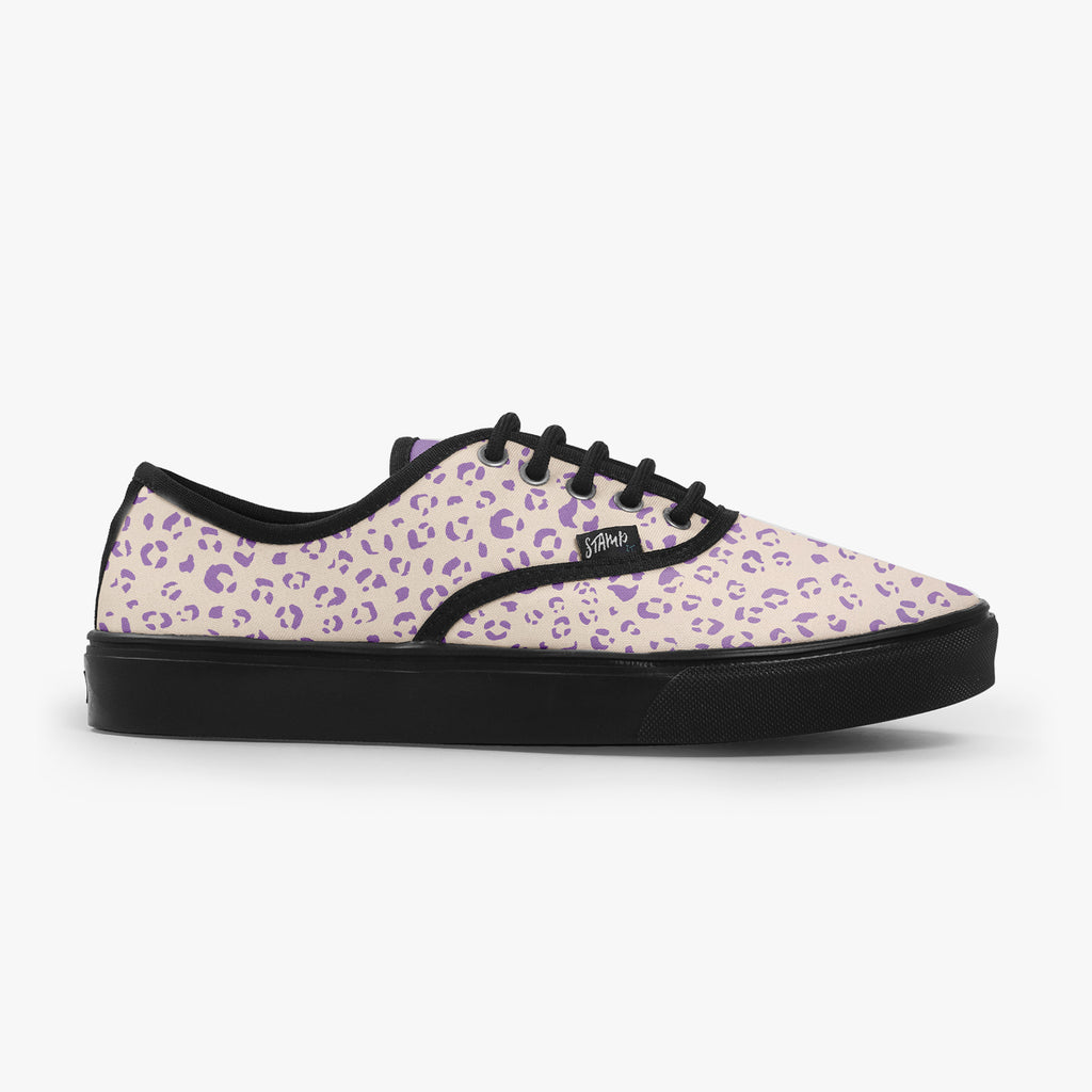 Tênis Casual Unissex Onça Roxinha Animais, confeccionado em lona, com cores e estampas exclusivas.