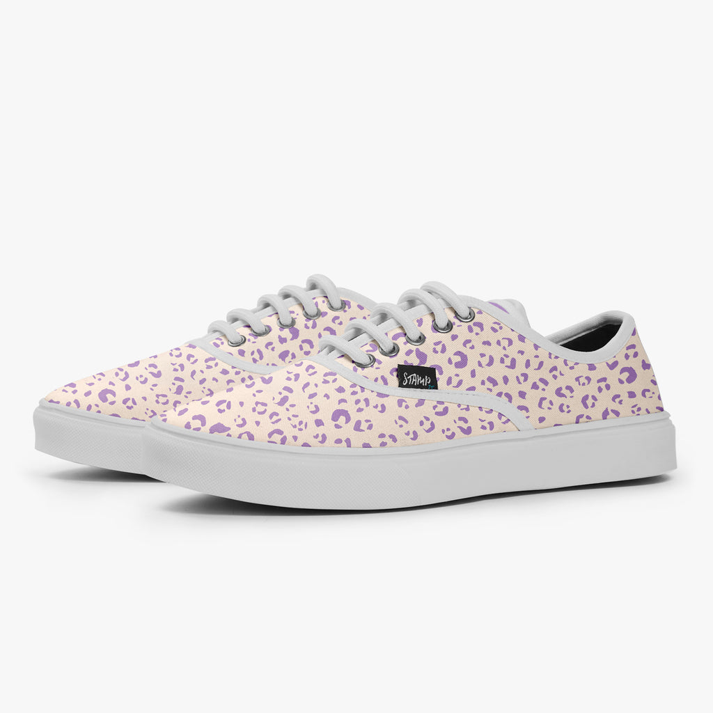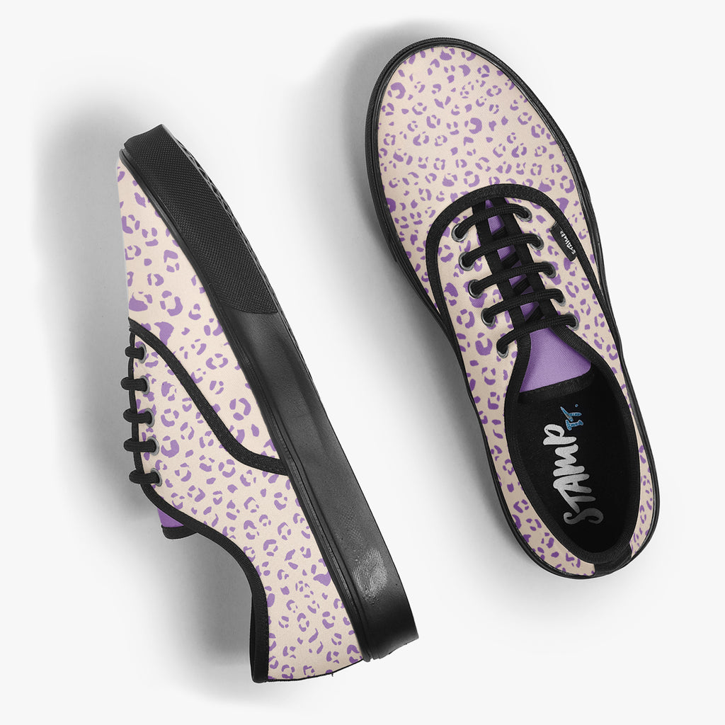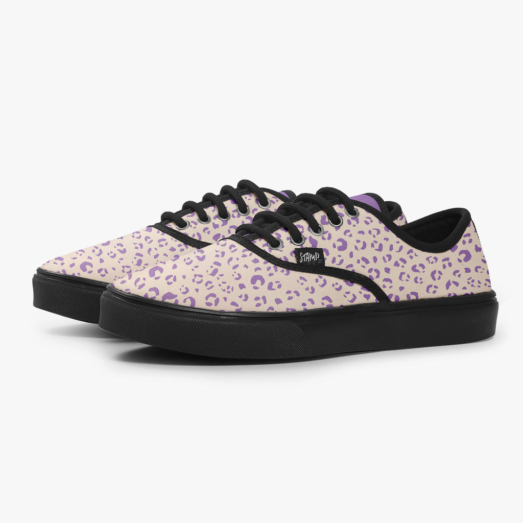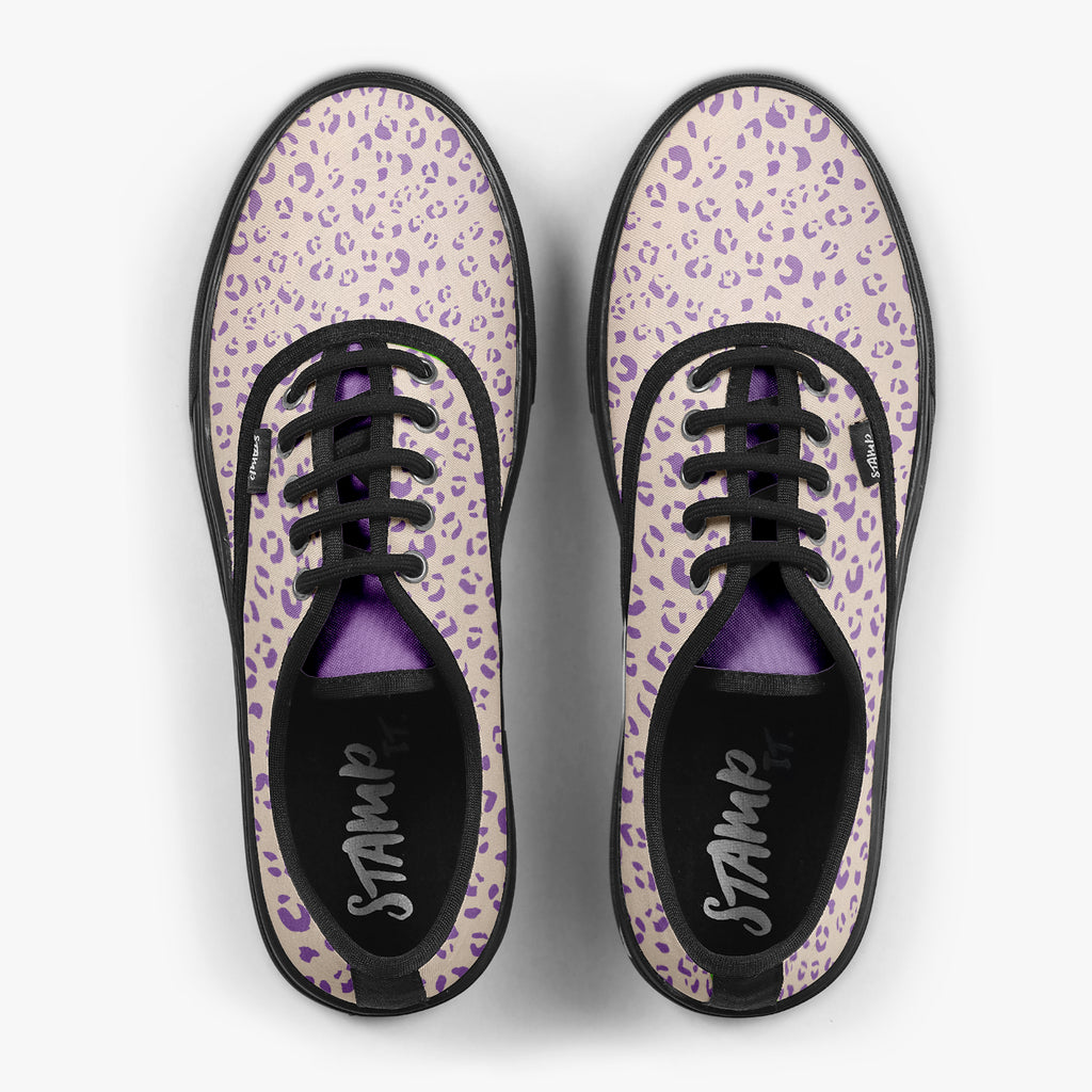 Tênis Casual Unissex Onça Roxinha Animais, confeccionado em lona, com cores e estampas exclusivas.