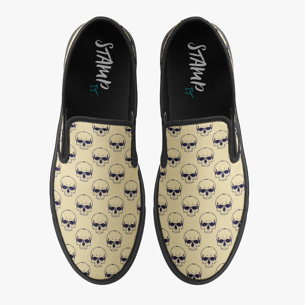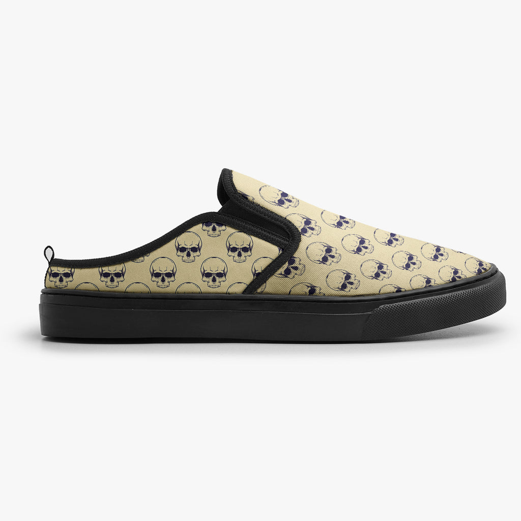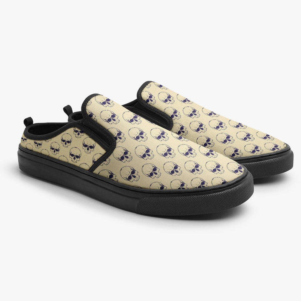 Tênis Mule Bege Caveiras Azuis Caveiras, confeccionado em lona, com cores e estampas exclusivas.