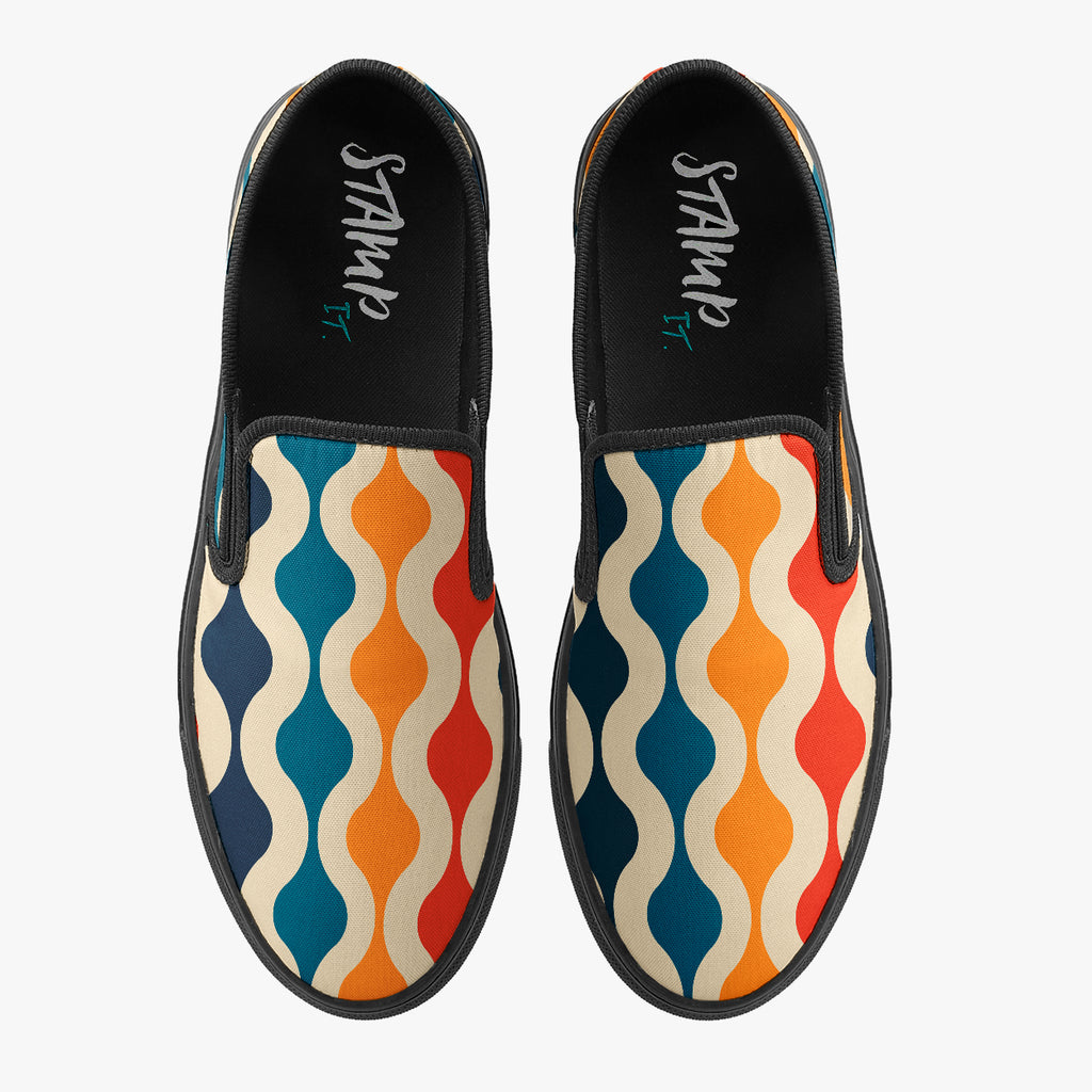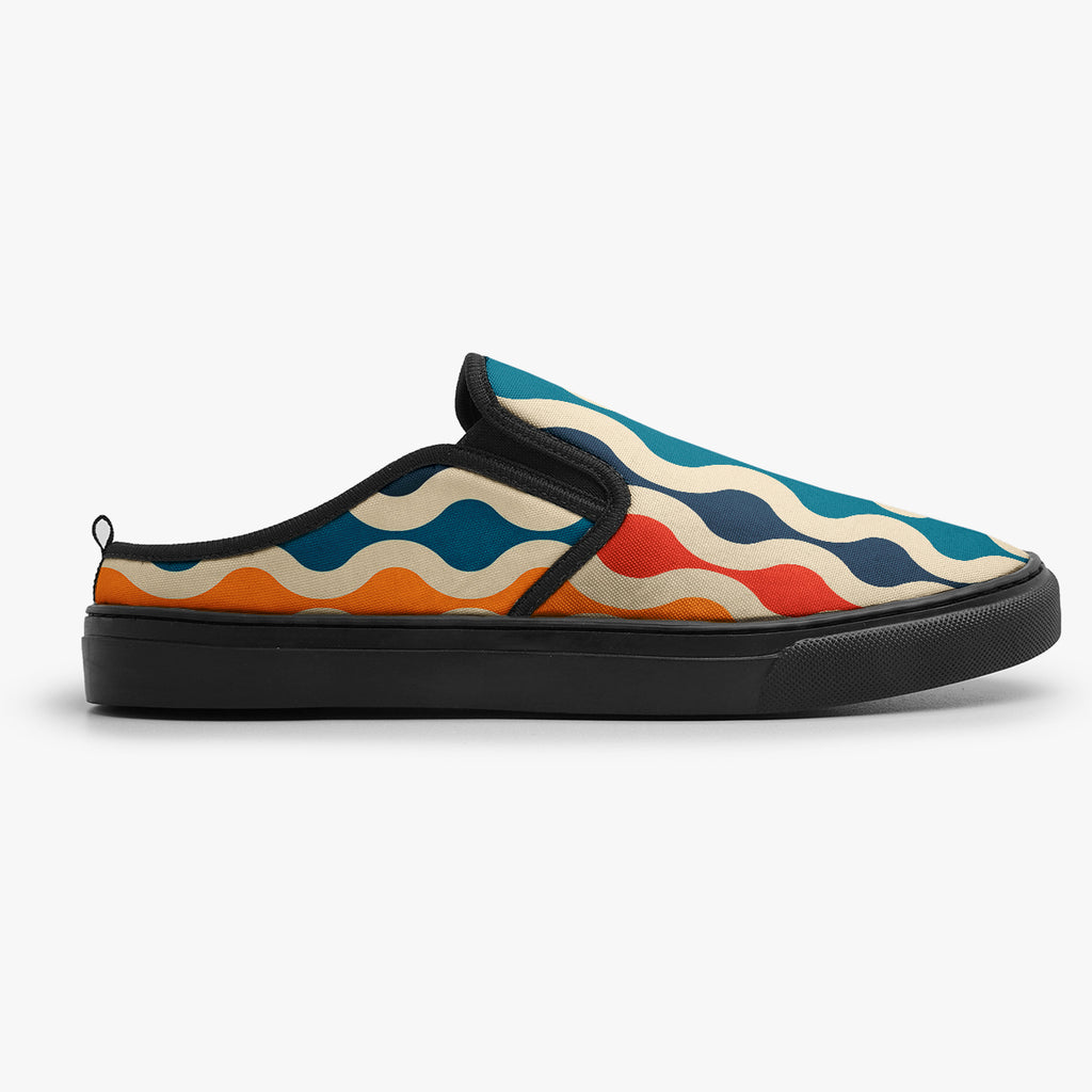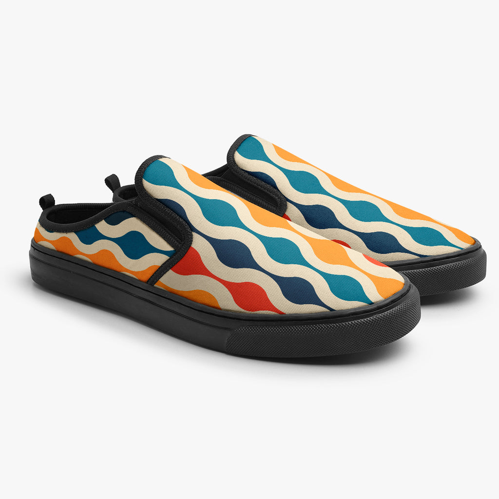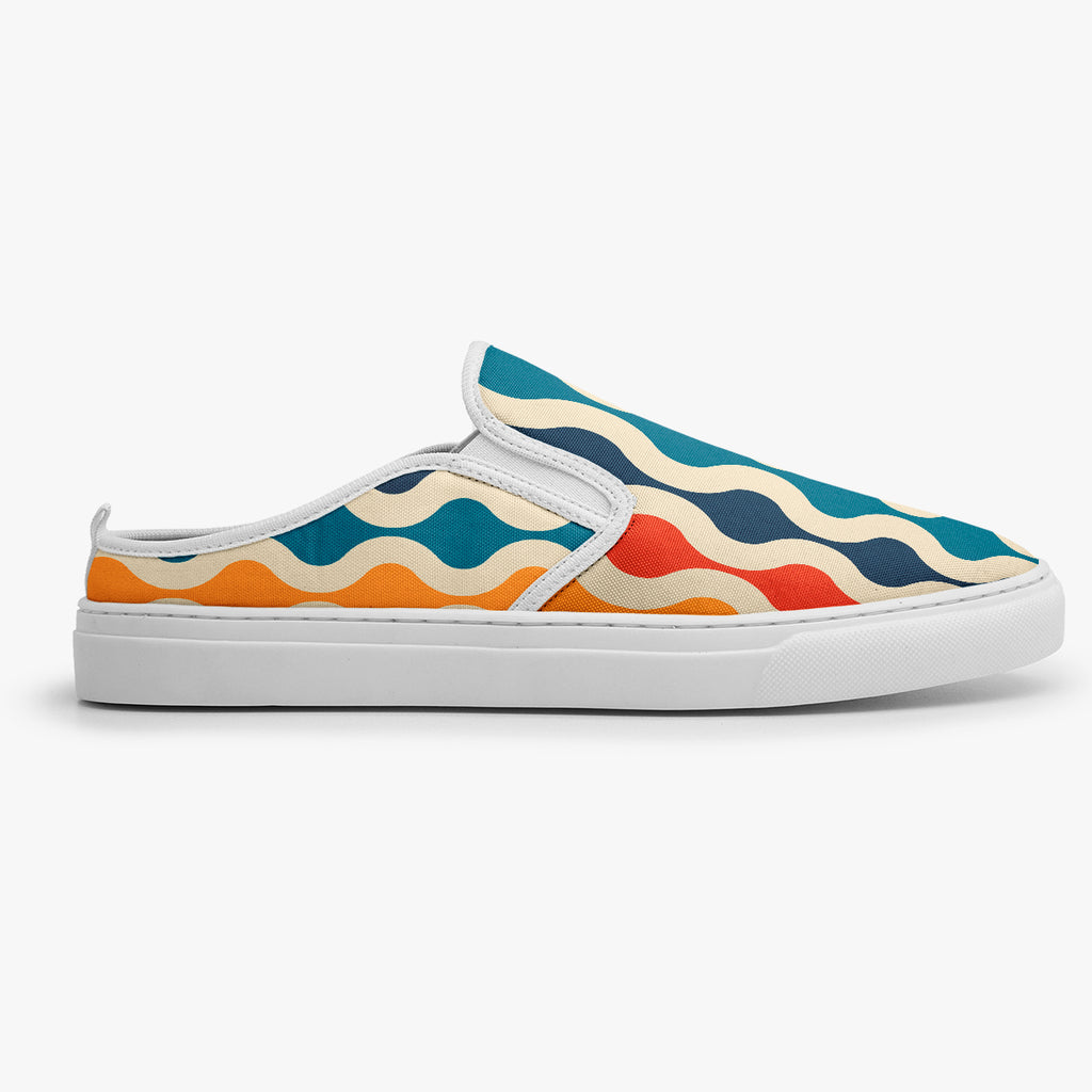 Tênis Mule Bege Ondulados Coloridos Abstrato, confeccionado em lona, com cores e estampas exclusivas.