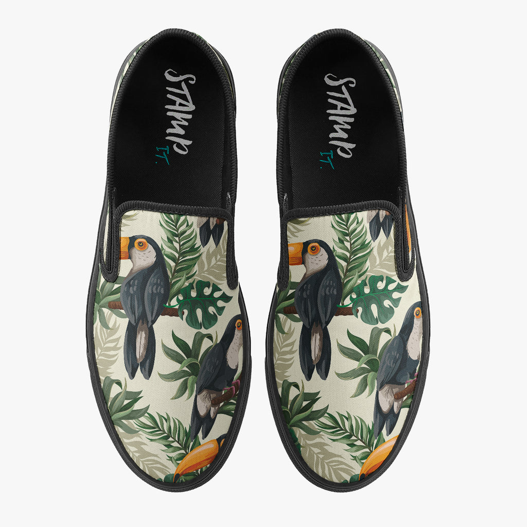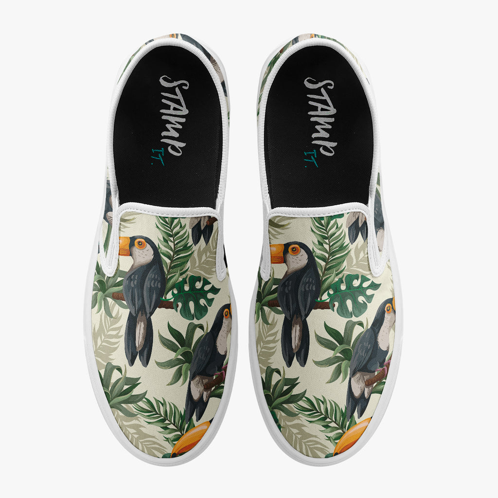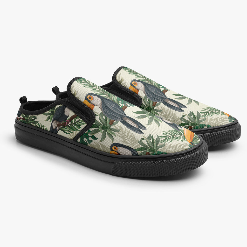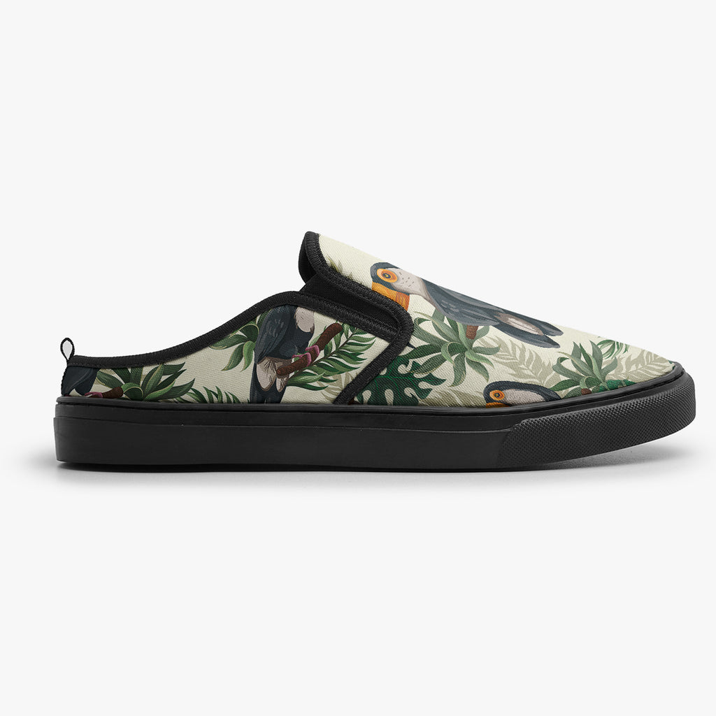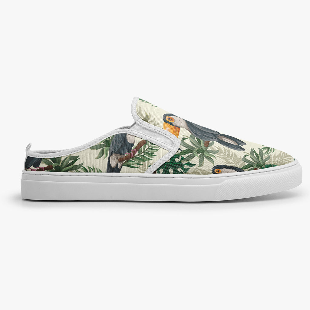 Tênis Mule Bege Tucano Folhas Animais, confeccionado em lona, com cores e estampas exclusivas.