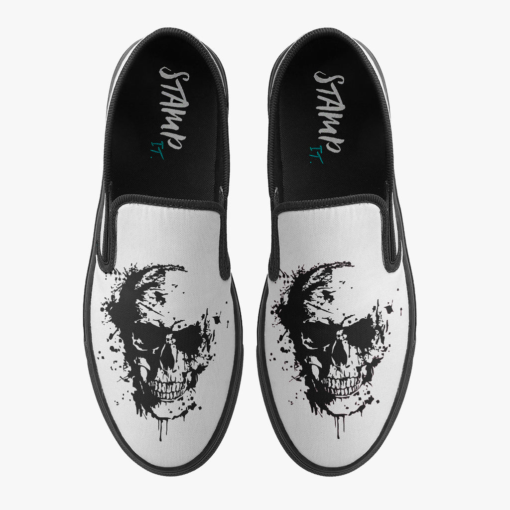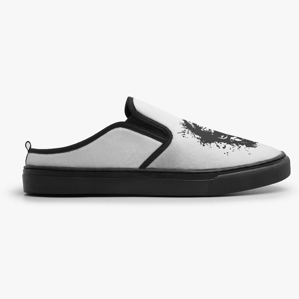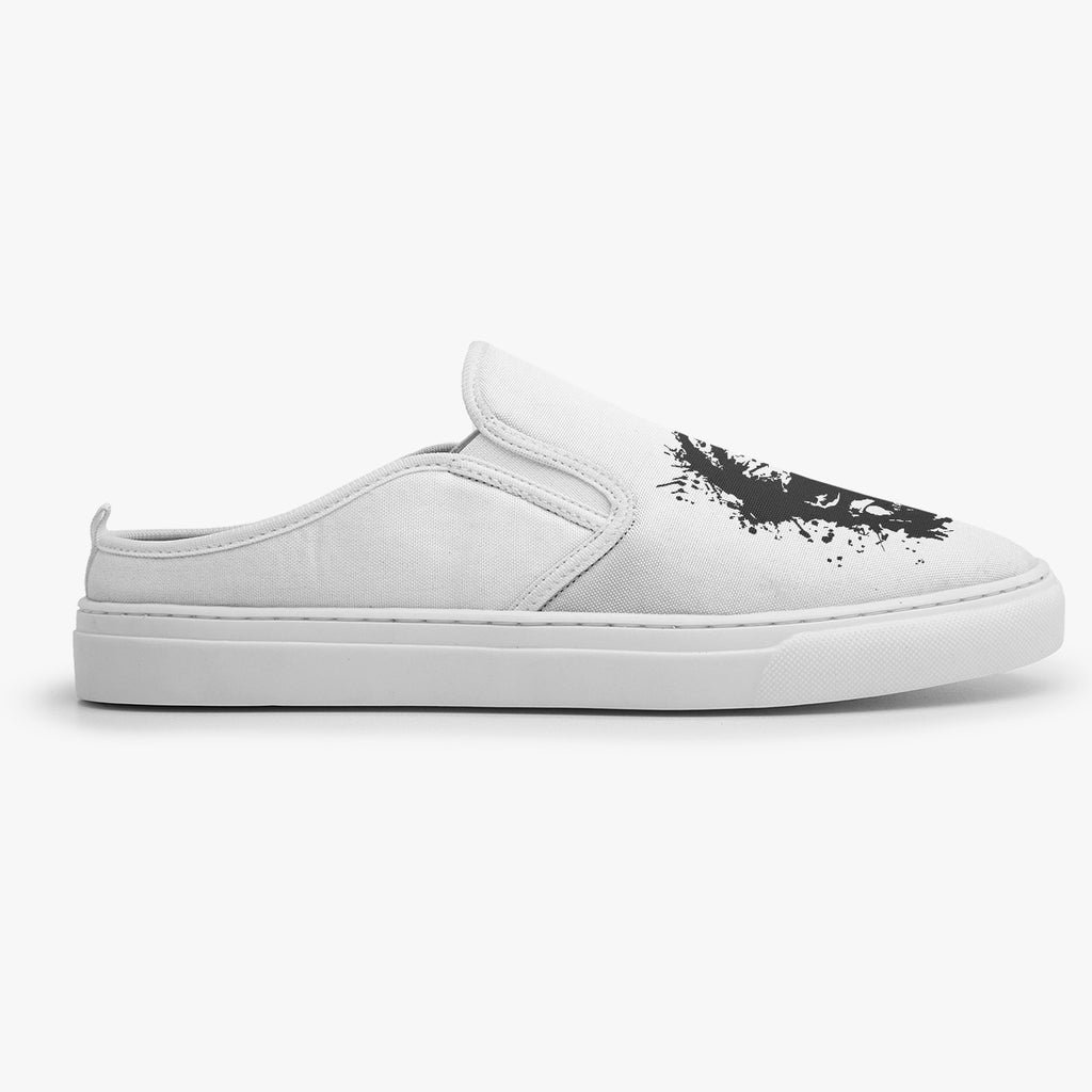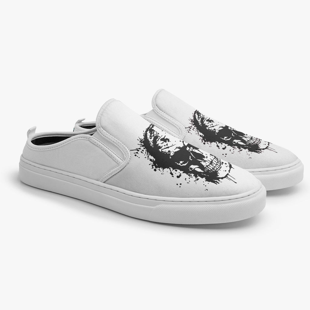 Tênis Mule Branco Crânio Desenhado em Tinta Caveiras, confeccionado em lona, com cores e estampas exclusivas.