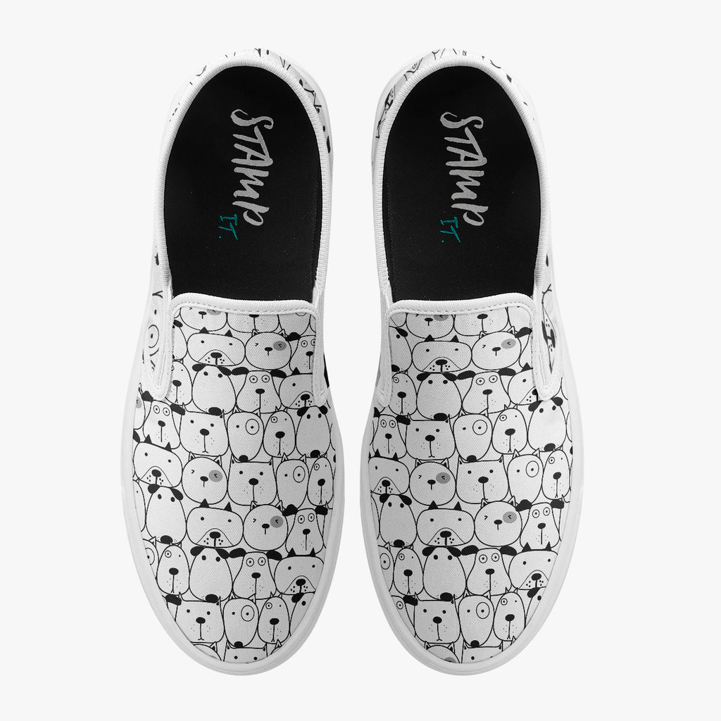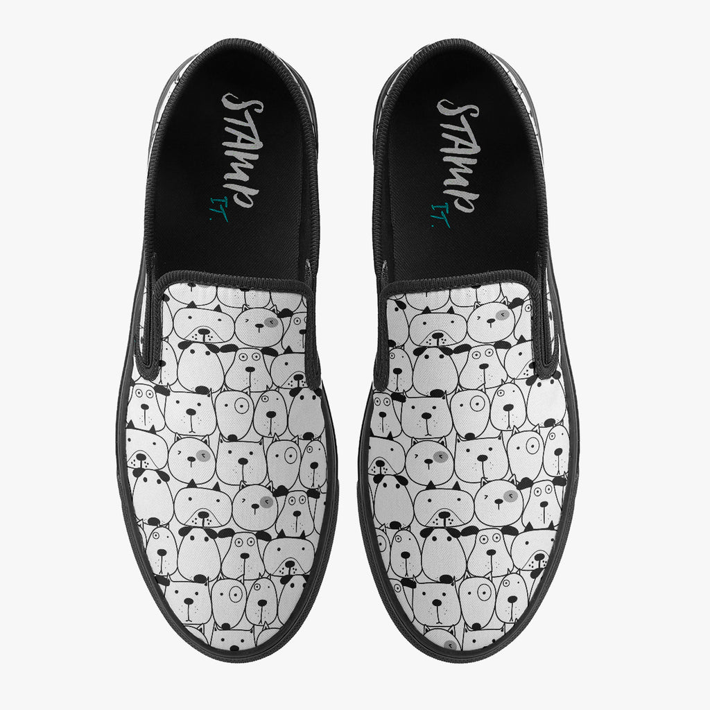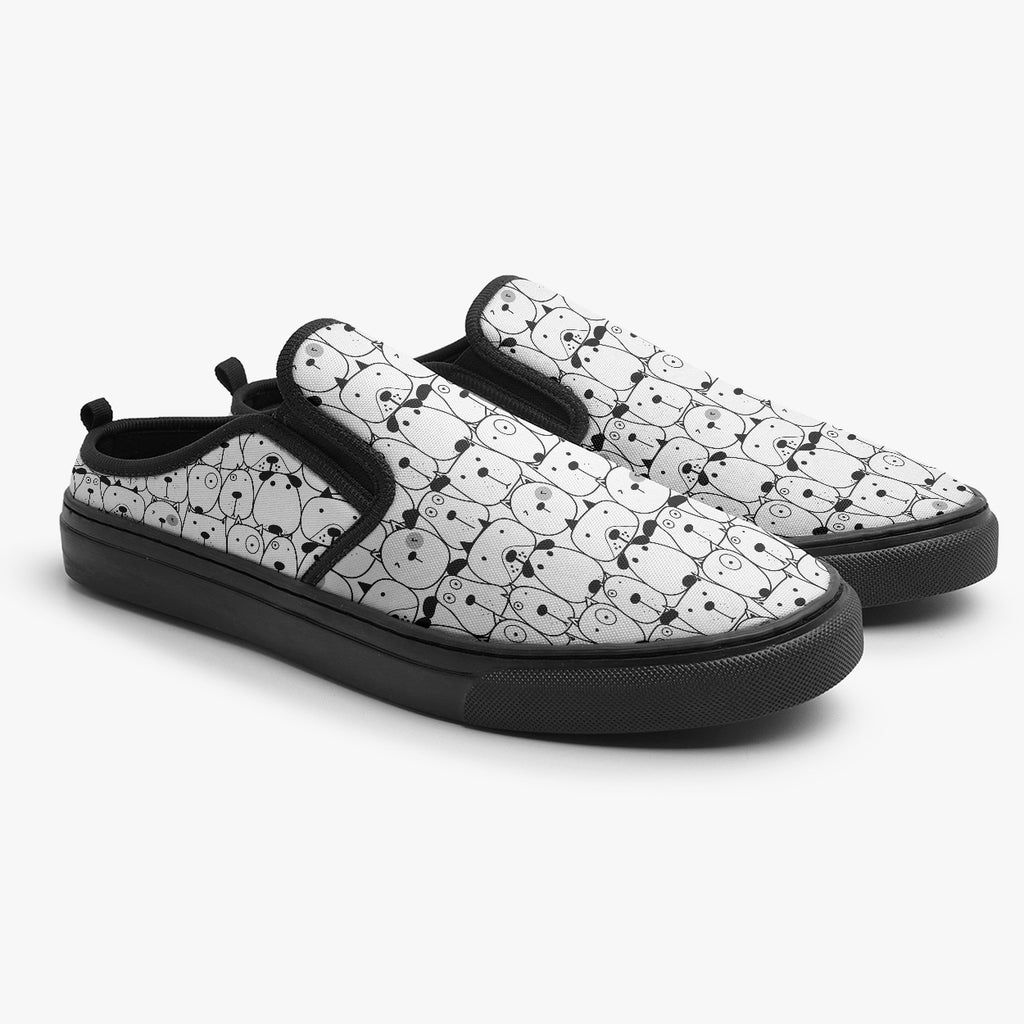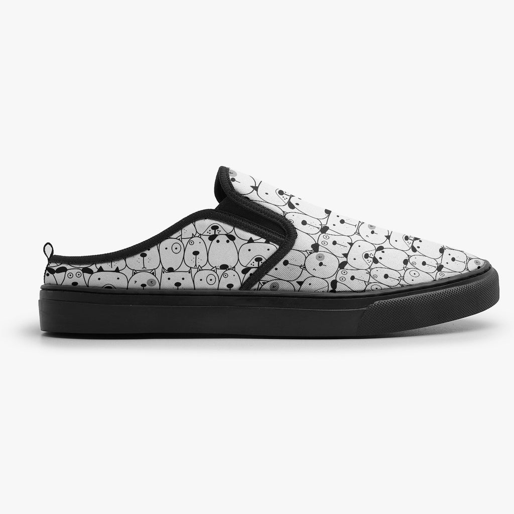 Tênis Mule Branco e Preto Raças Cachorros Animais, confeccionado em lona, com cores e estampas exclusivas.