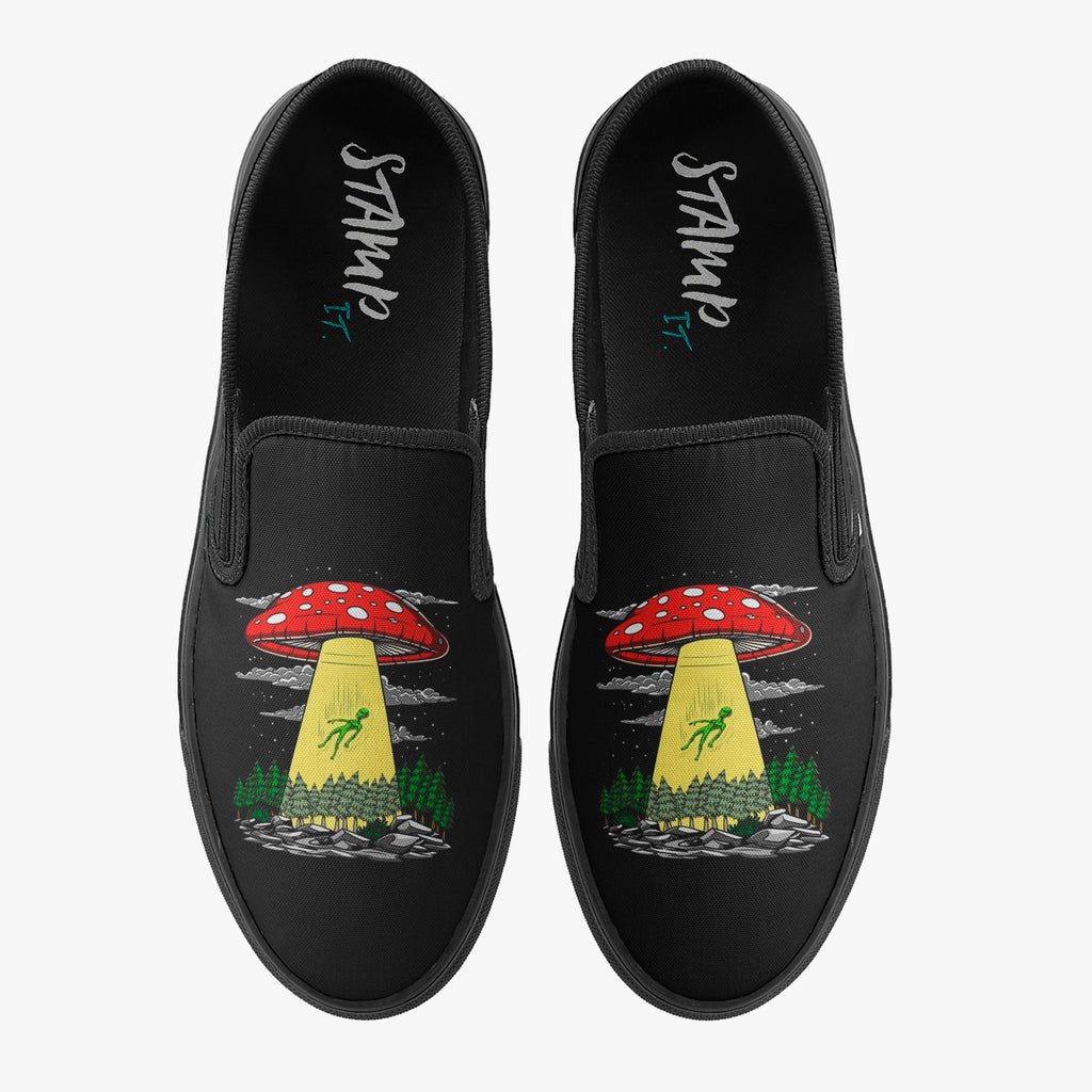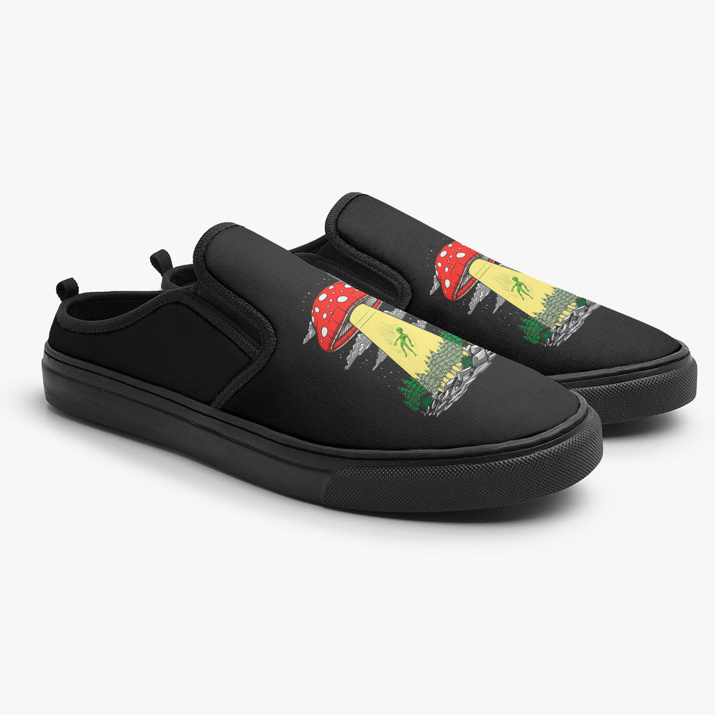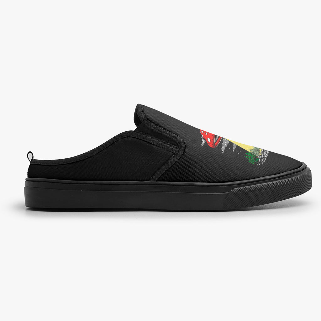 Tênis Mule Preto Cogumelo Abduzindo ET Abstrato, confeccionado em lona, com cores e estampas exclusivas.
