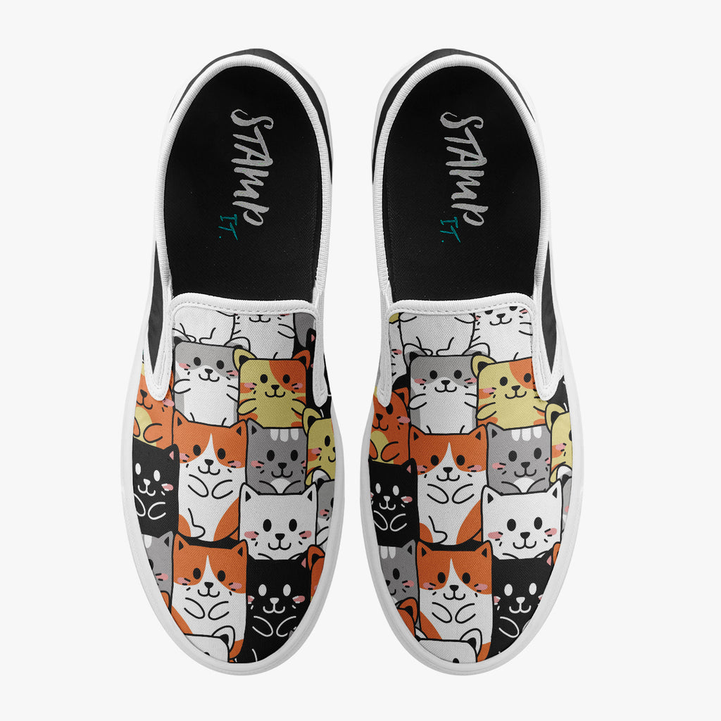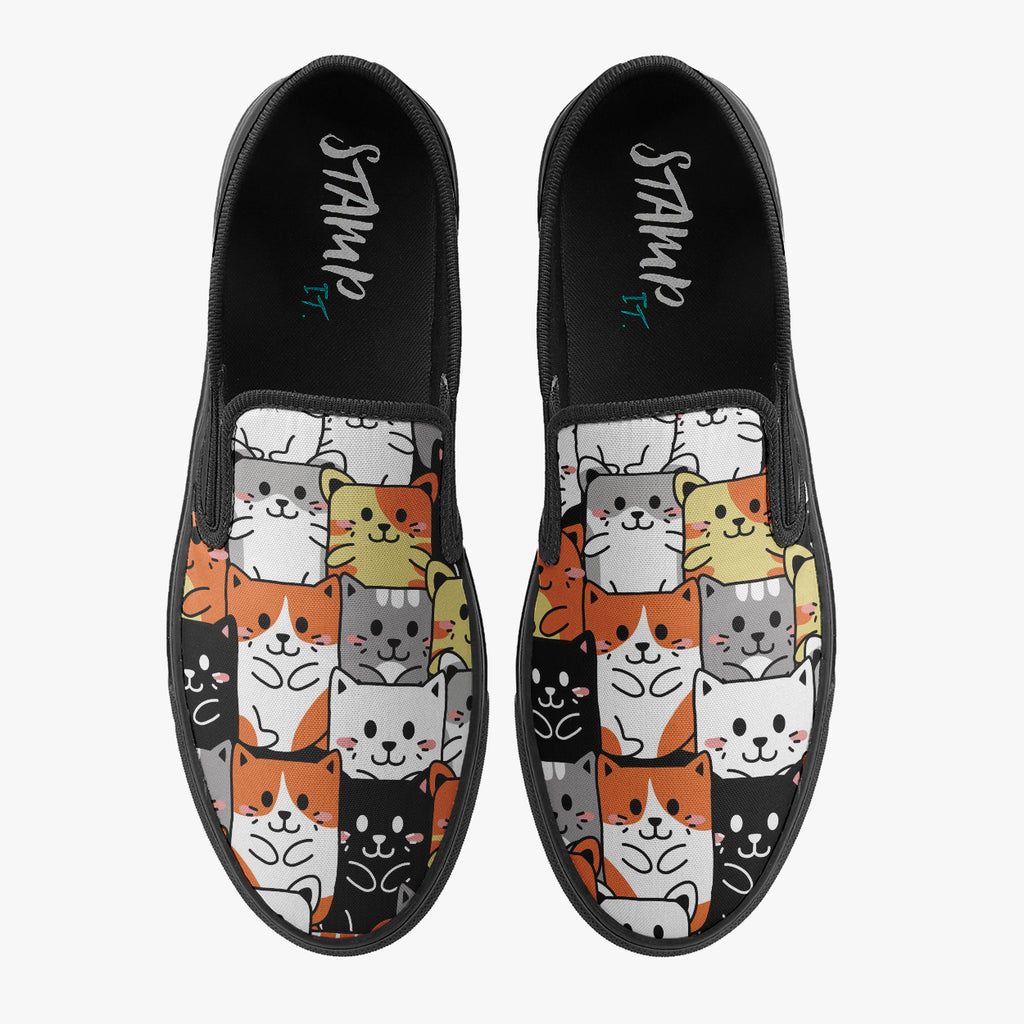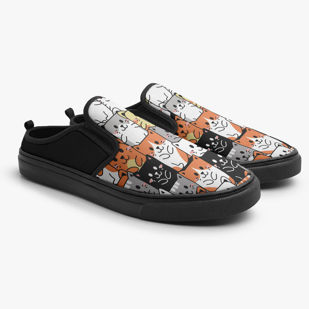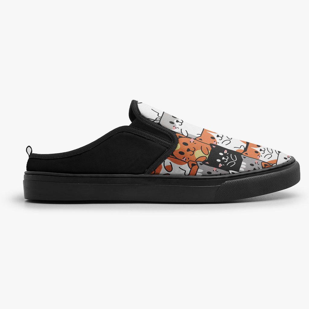 Tênis Mule Preto Gatinhos Cores Animais, confeccionado em lona, com cores e estampas exclusivas.