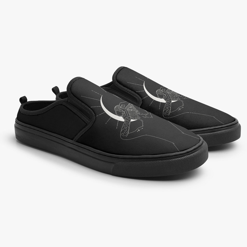 Tênis Mule Preto Mulher Coque Lua Minguante Abstrato, confeccionado em lona, com cores e estampas exclusivas.