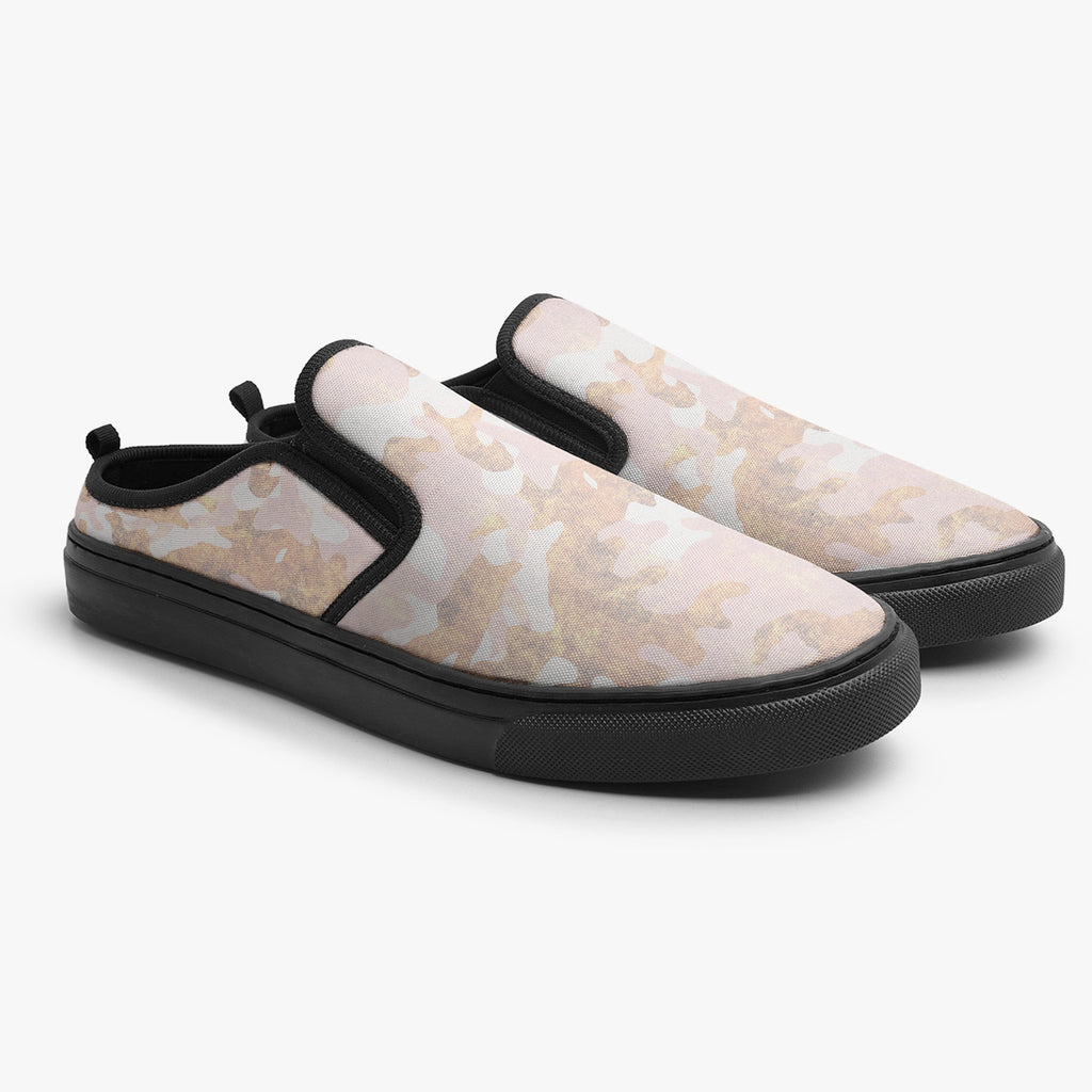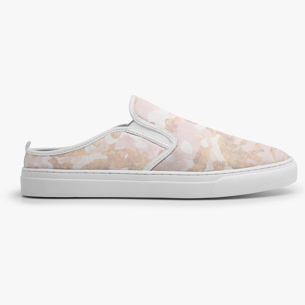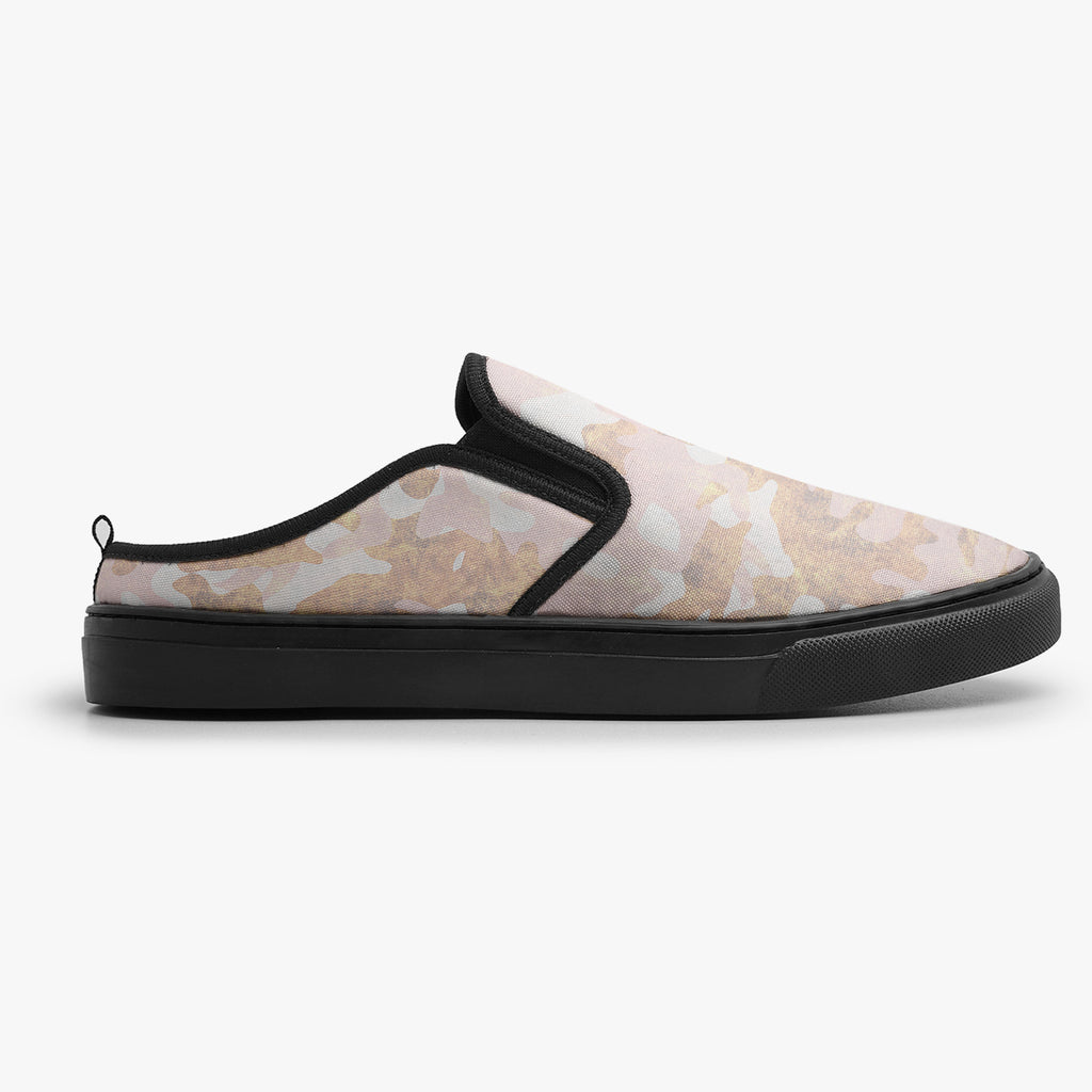 Tênis Mule Rosa Camuflado Militar Abstrato, confeccionado em lona, com cores e estampas exclusivas.