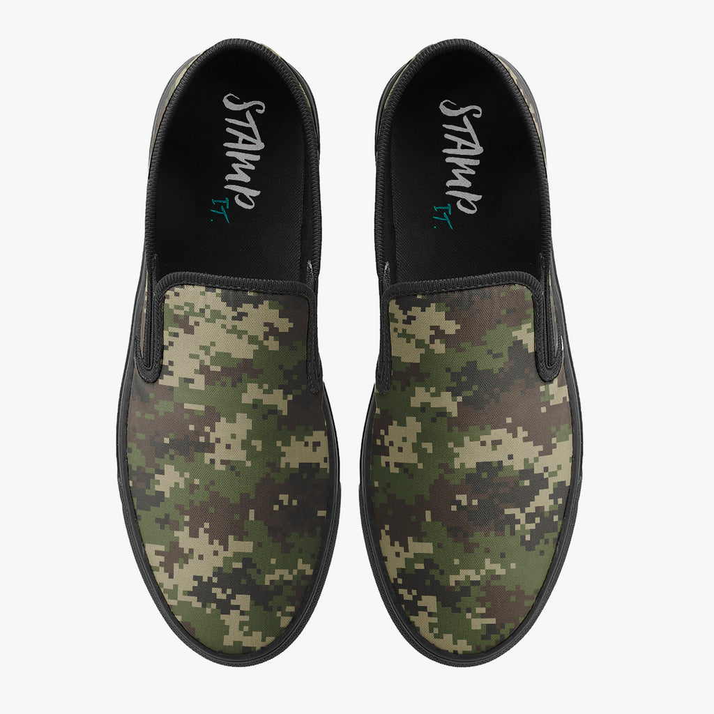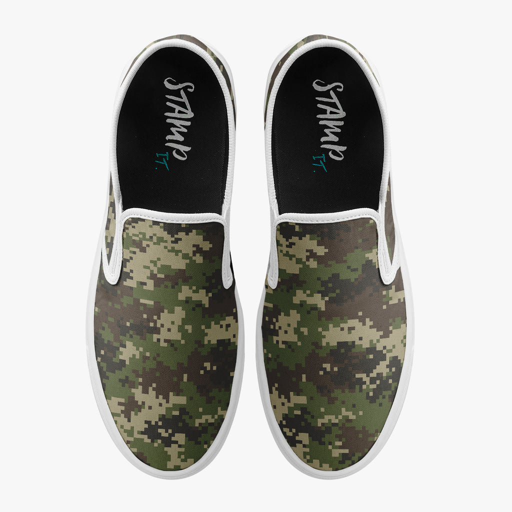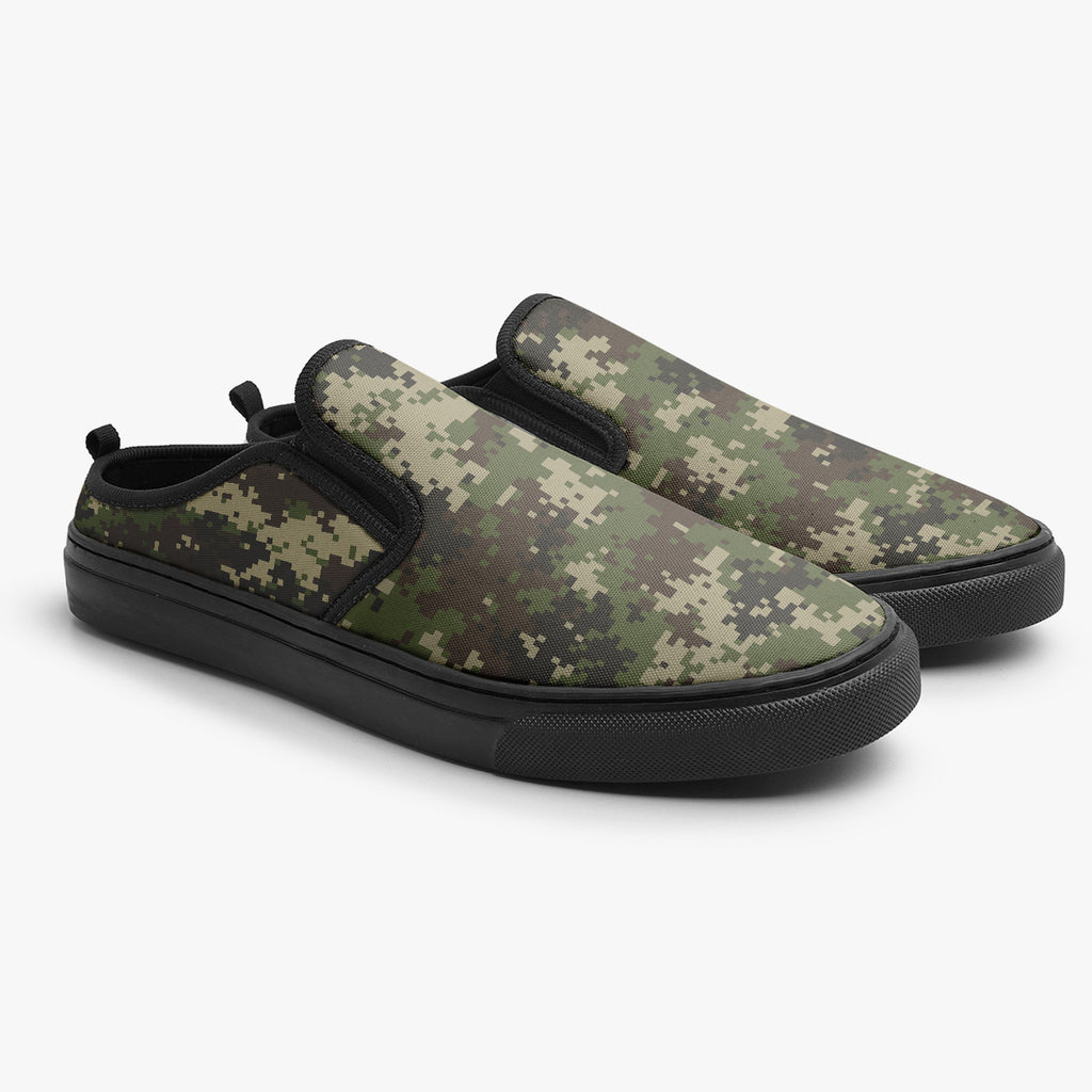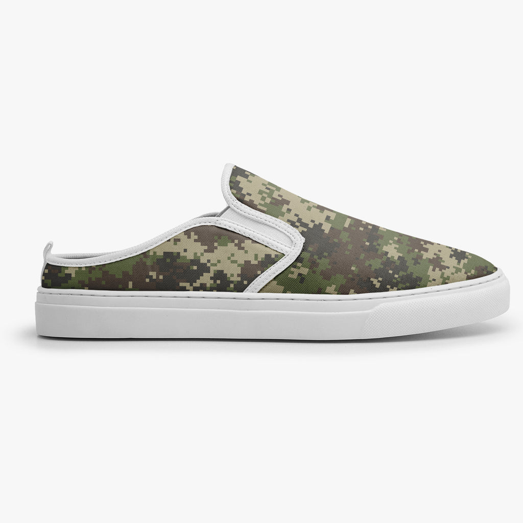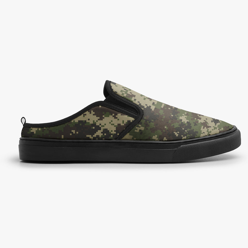 Tênis Mule Verde Camuflado Militar 8 Bits Abstrato, confeccionado em lona, com cores e estampas exclusivas.