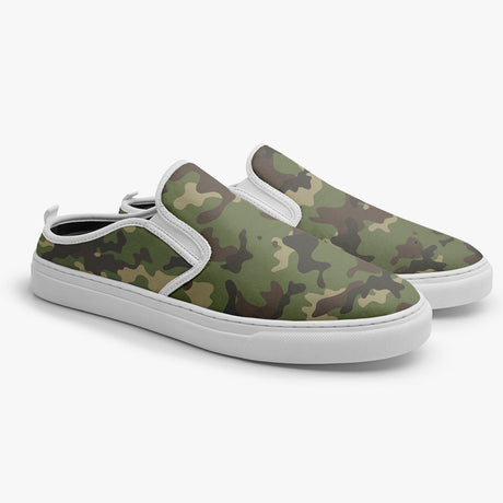 Tênis Mule Verde Camuflado Militar Abstrato, confeccionado em lona, com cores e estampas exclusivas.