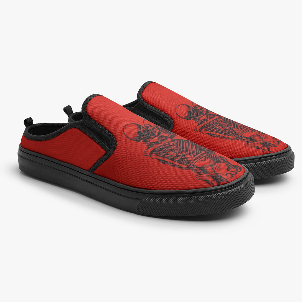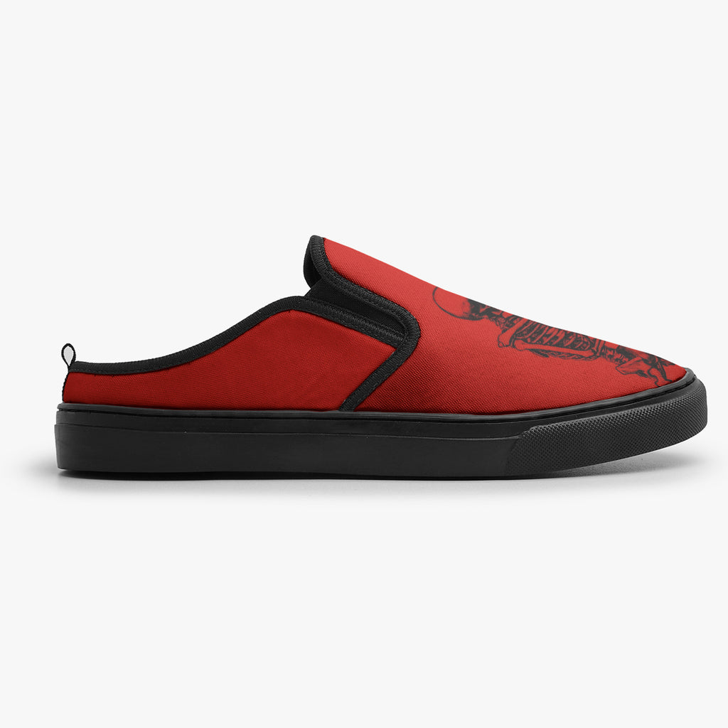 Tênis Mule Vermelho Beijo Esquelético Caveiras, confeccionado em lona, com cores e estampas exclusivas.