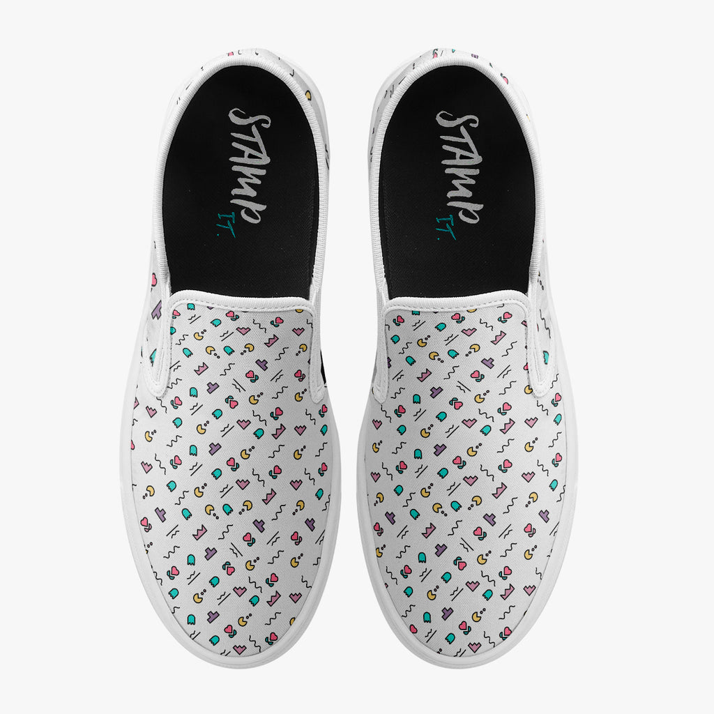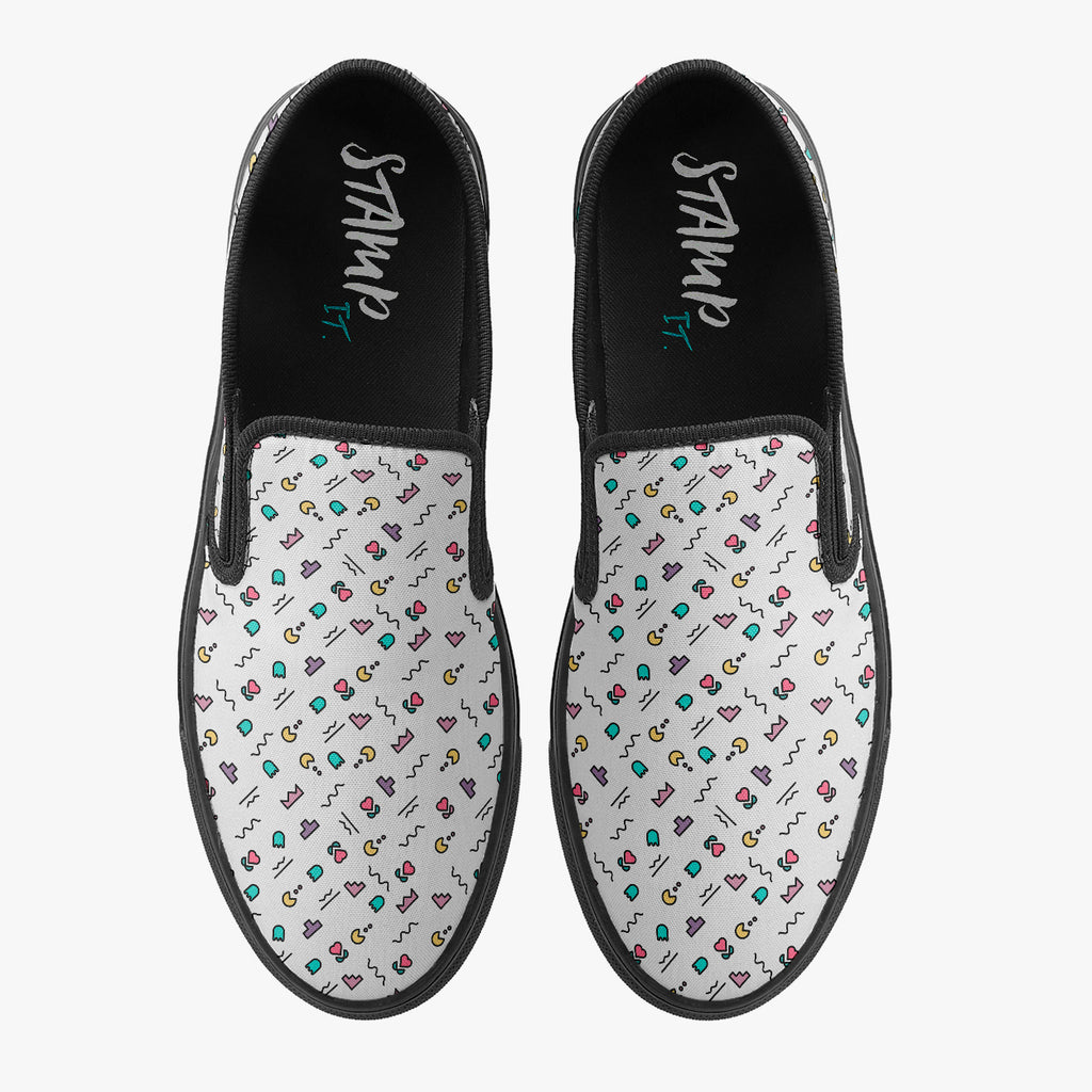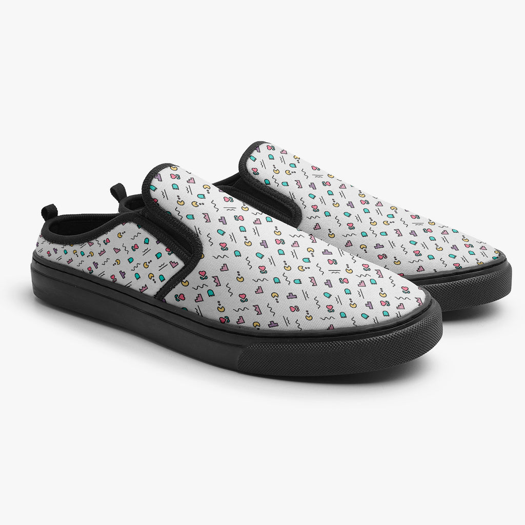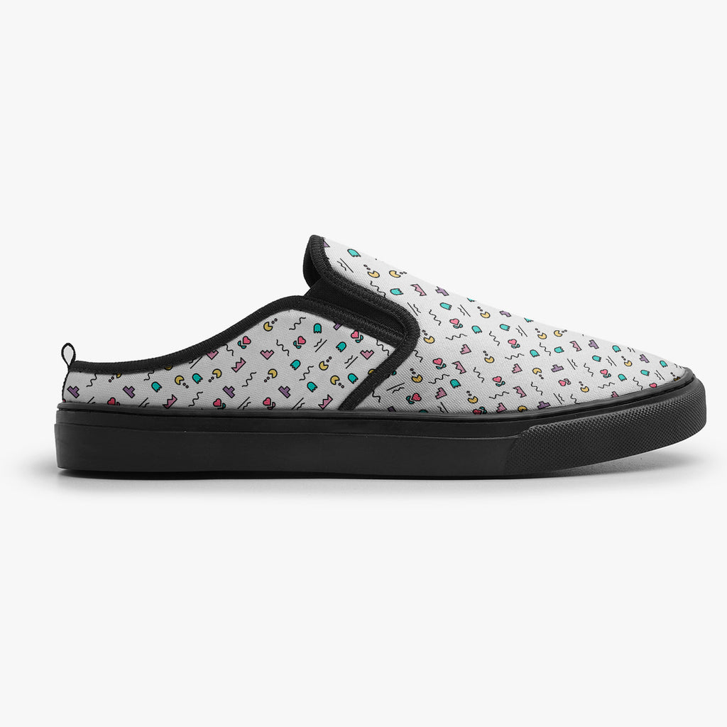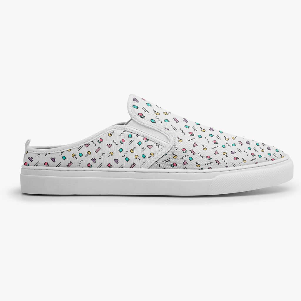 Calçado Mule Branco Pattern Pacman Games, confeccionado em lona, com cores e estampas exclusivas.