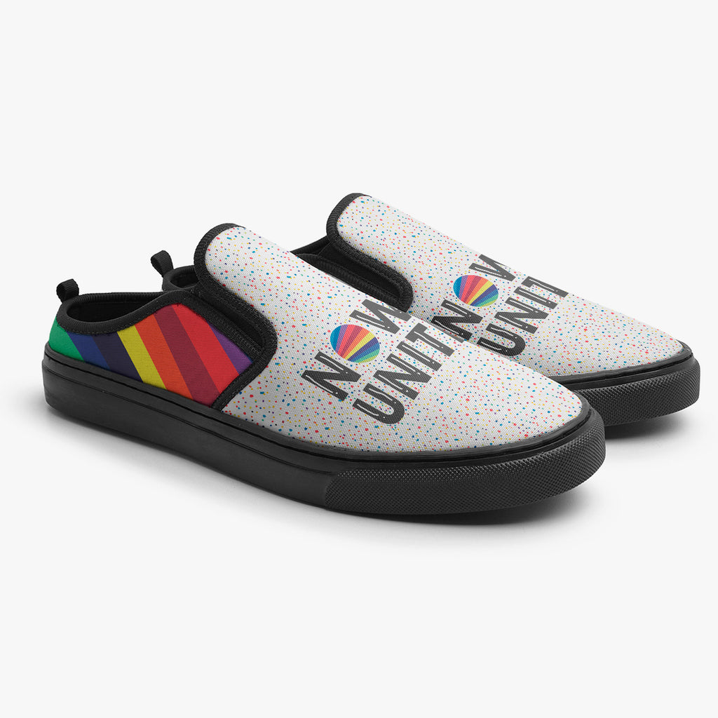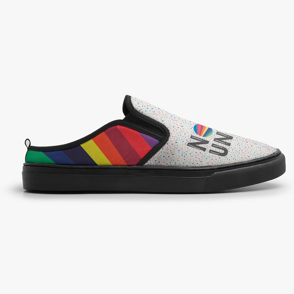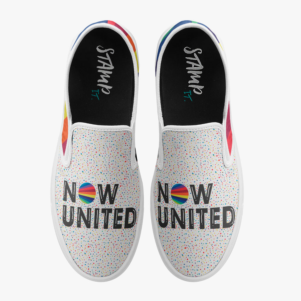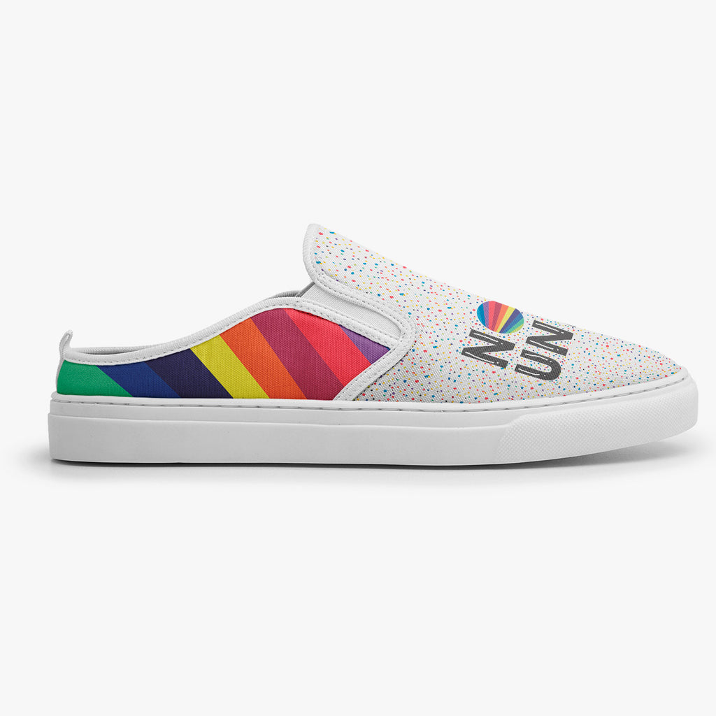 Calçado Mule Branco Now United Cores White Pop Music, confeccionado em lona, com cores e estampas exclusivas.