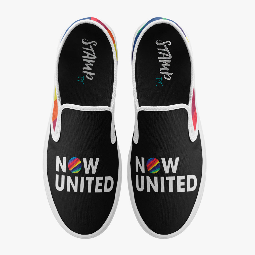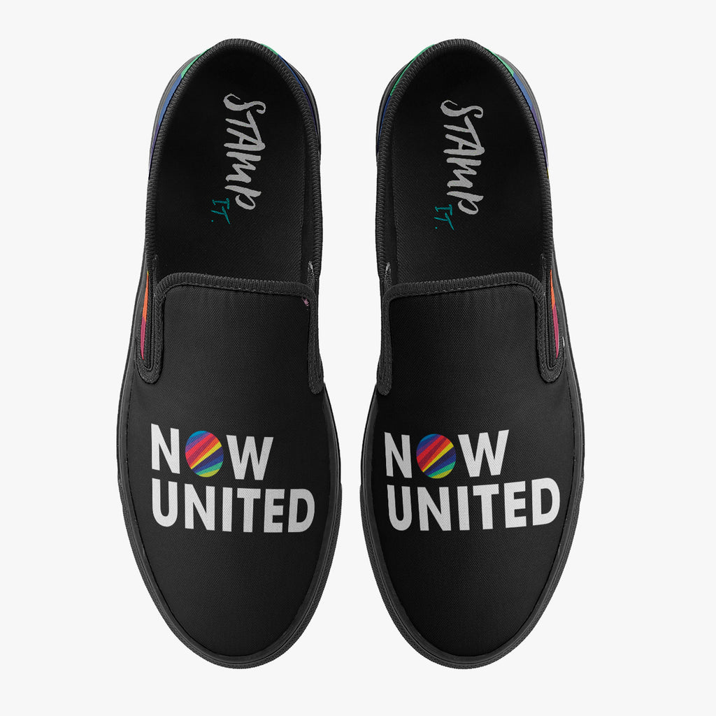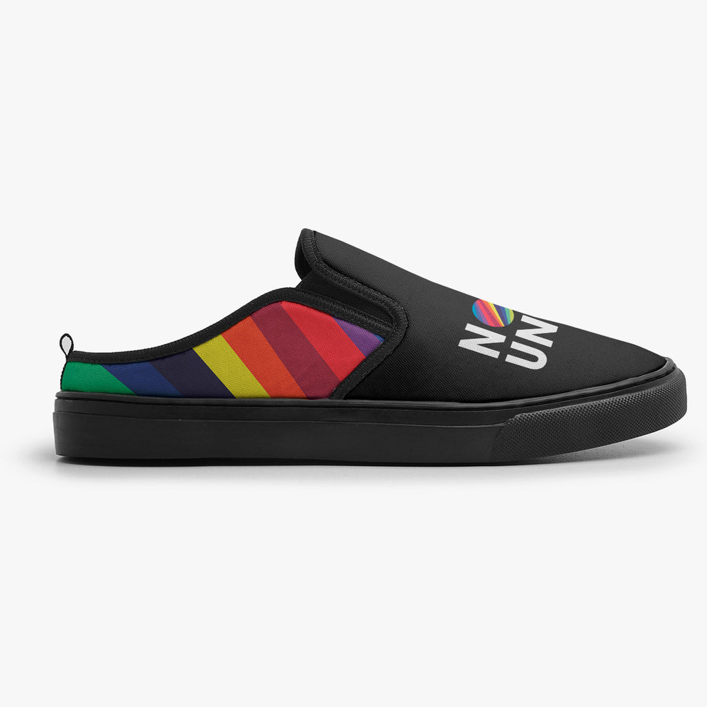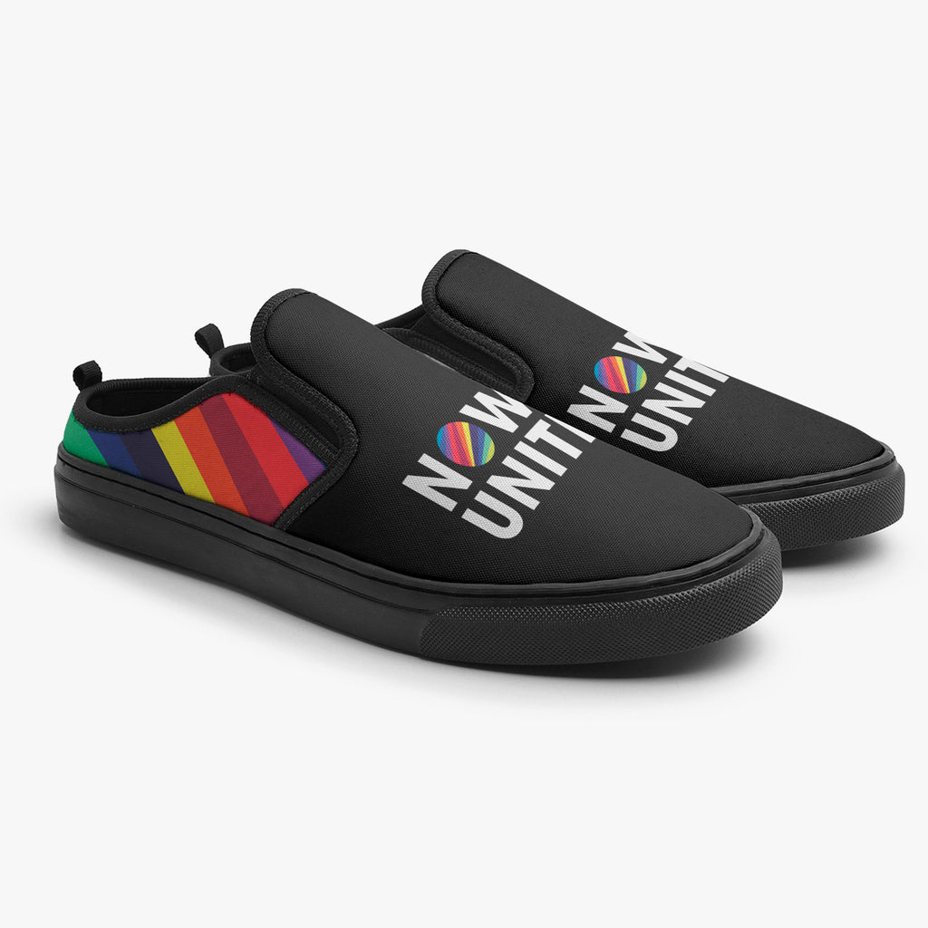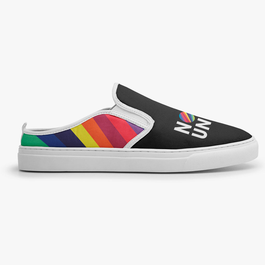 Calçado Mule Now United Preto Colorido Pop Music, confeccionado em lona, com cores e estampas exclusivas.