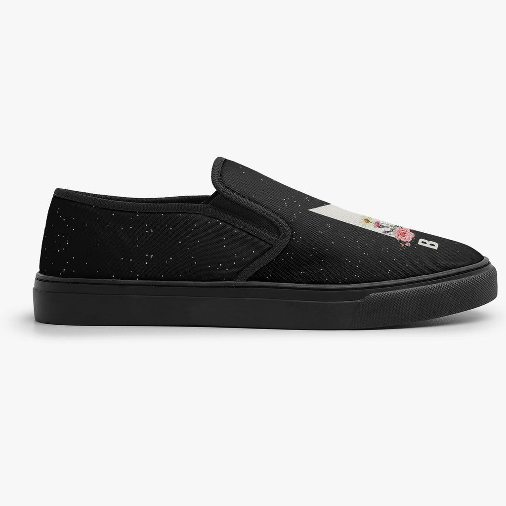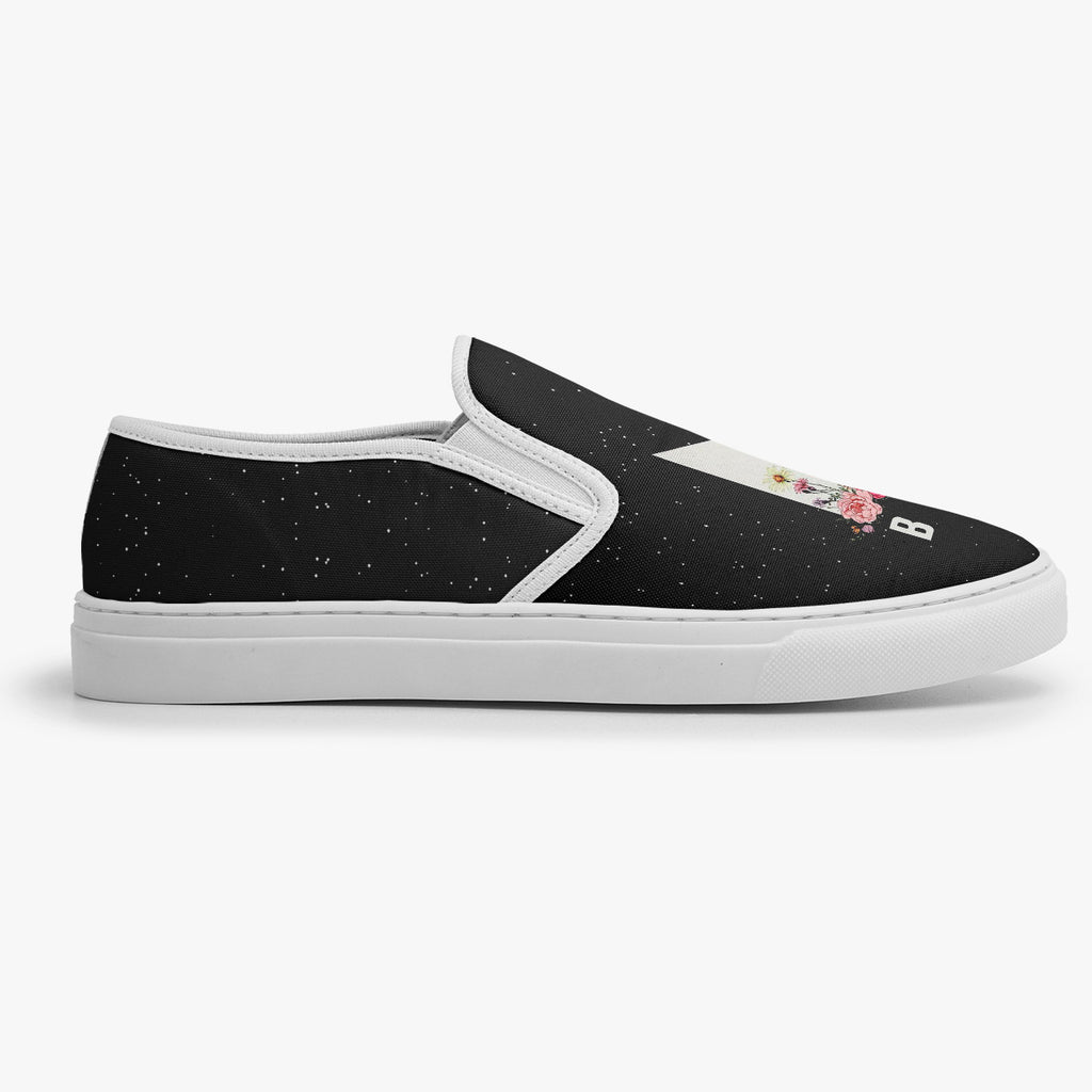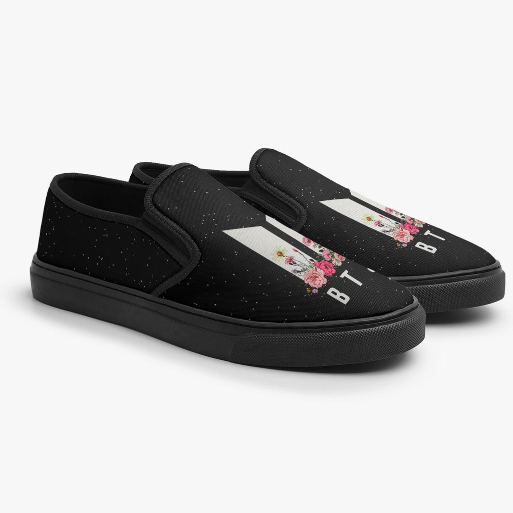 Calçado Slip On Bts Kpop Flores Flowers Preto Pop Music, confeccionado em lona, com cores e estampas exclusivas.