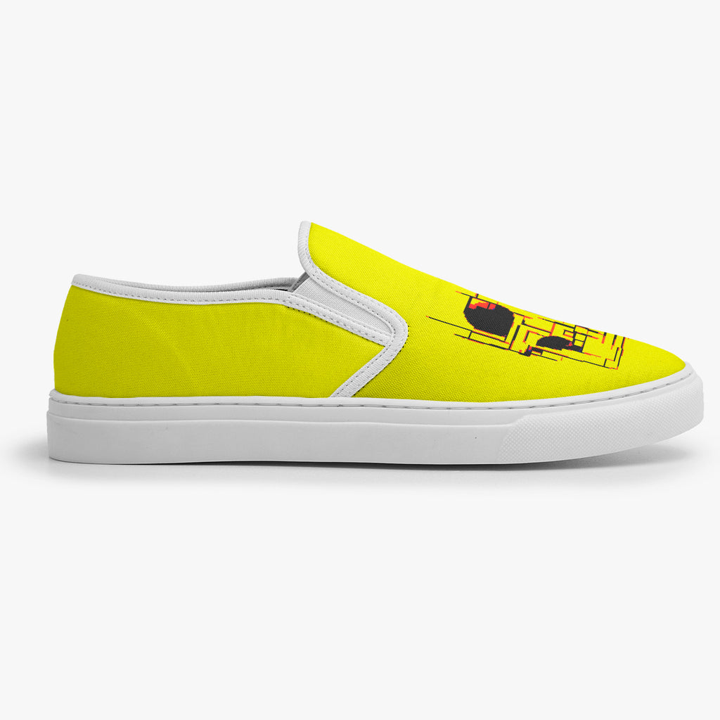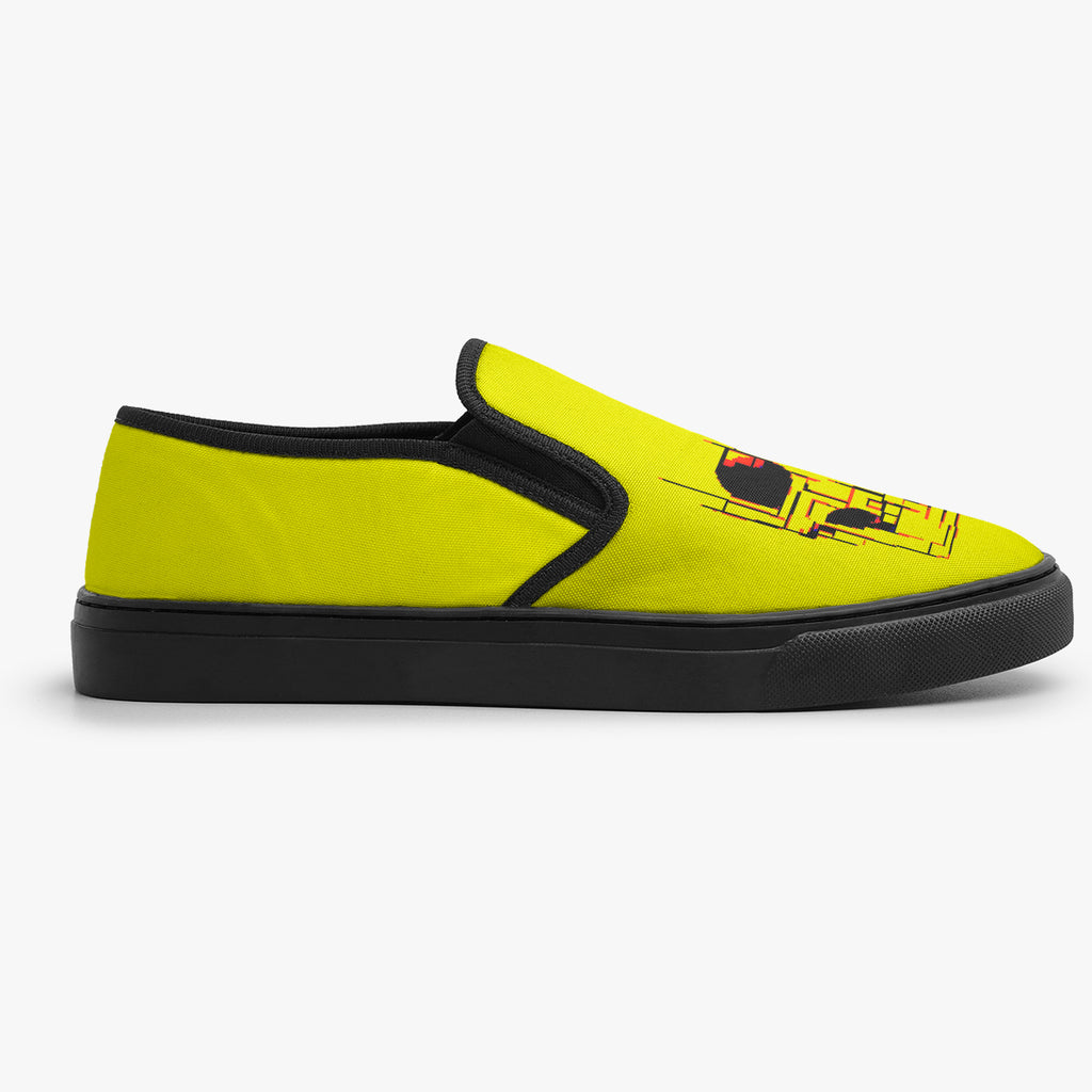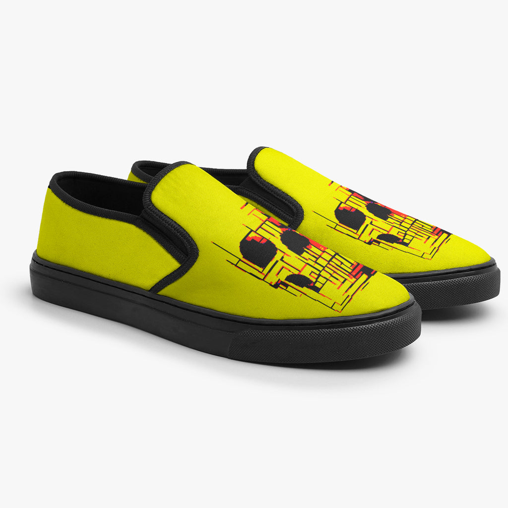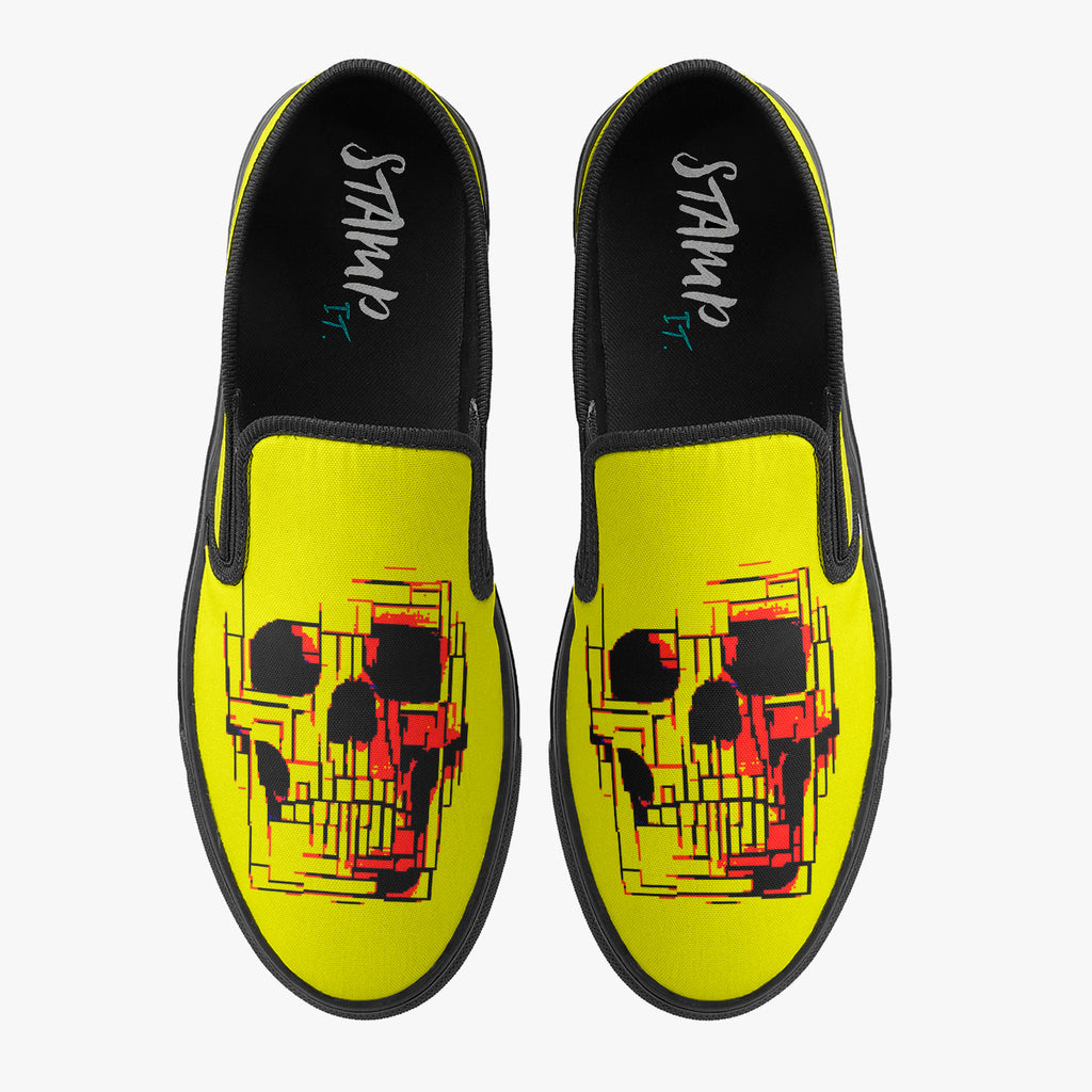 Tênis Slip On Amarelo Caveira Holograma Abstrato, confeccionado em lona, com cores e estampas exclusivas.
