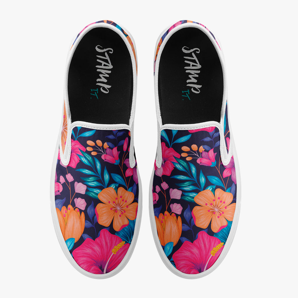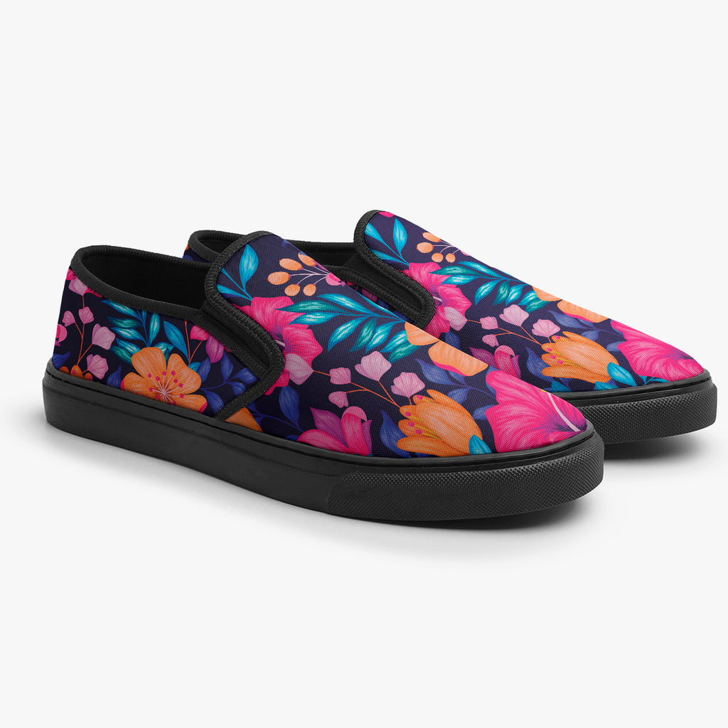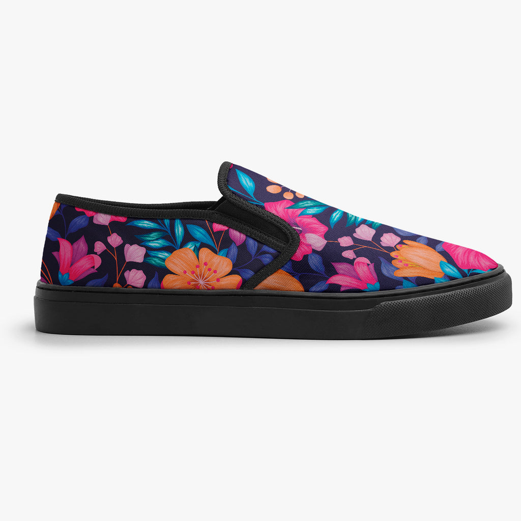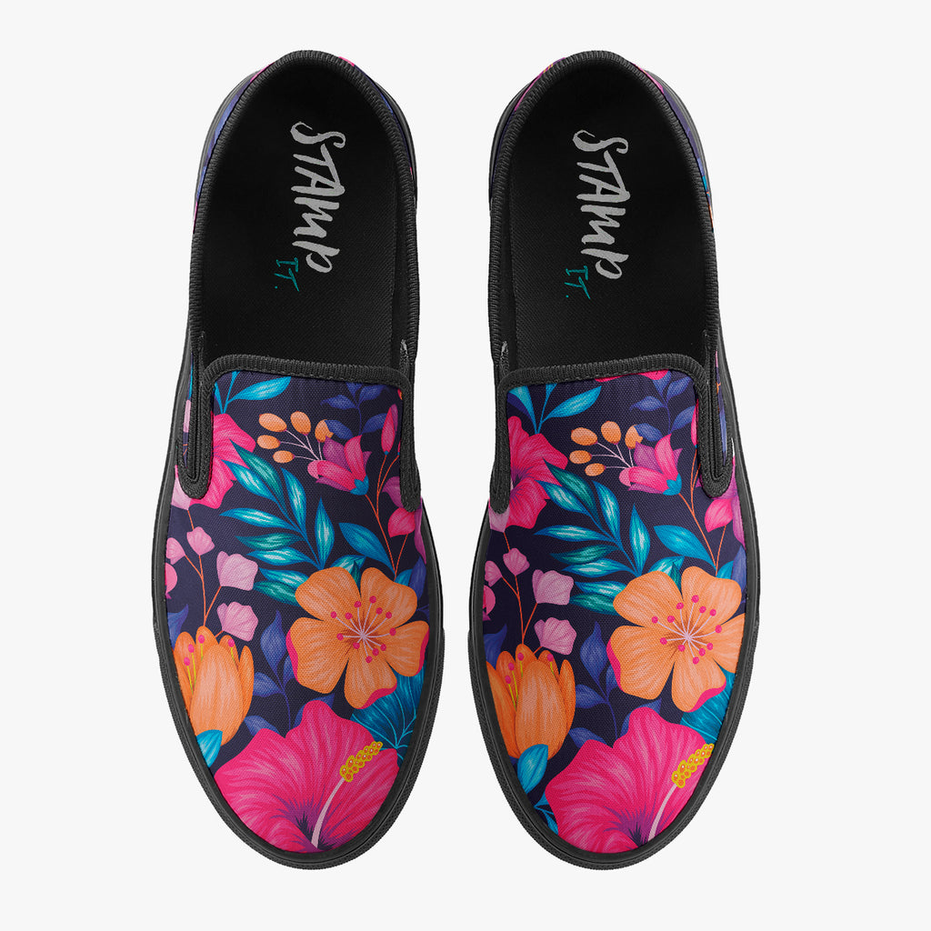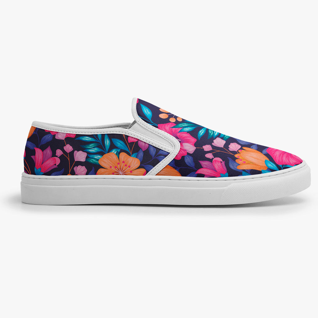 Calçado Slip On Azul Floral Primavera Summer Pattern Flores e Folhas, confeccionado em lona, com cores e estampas exclusivas.