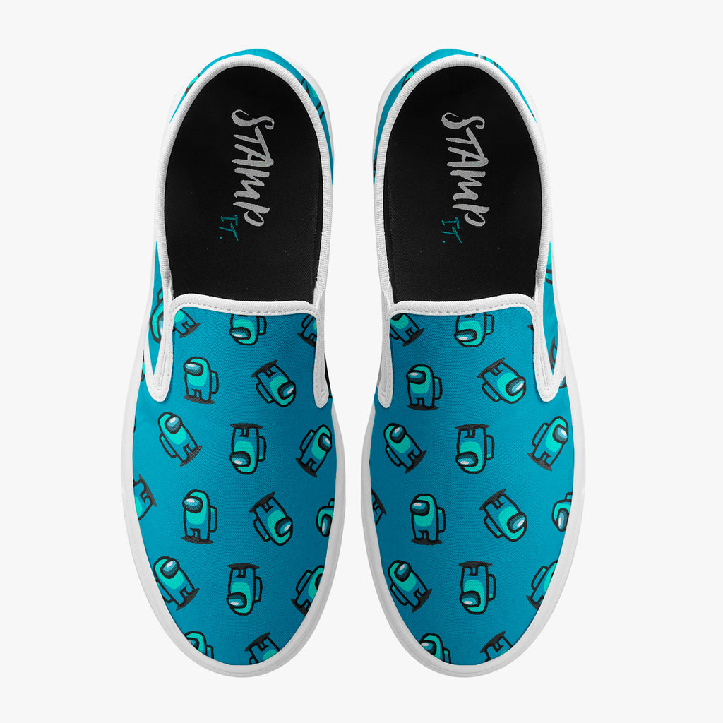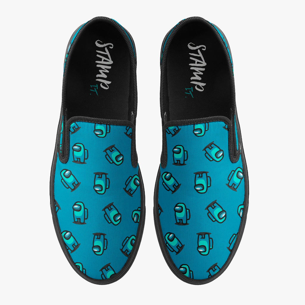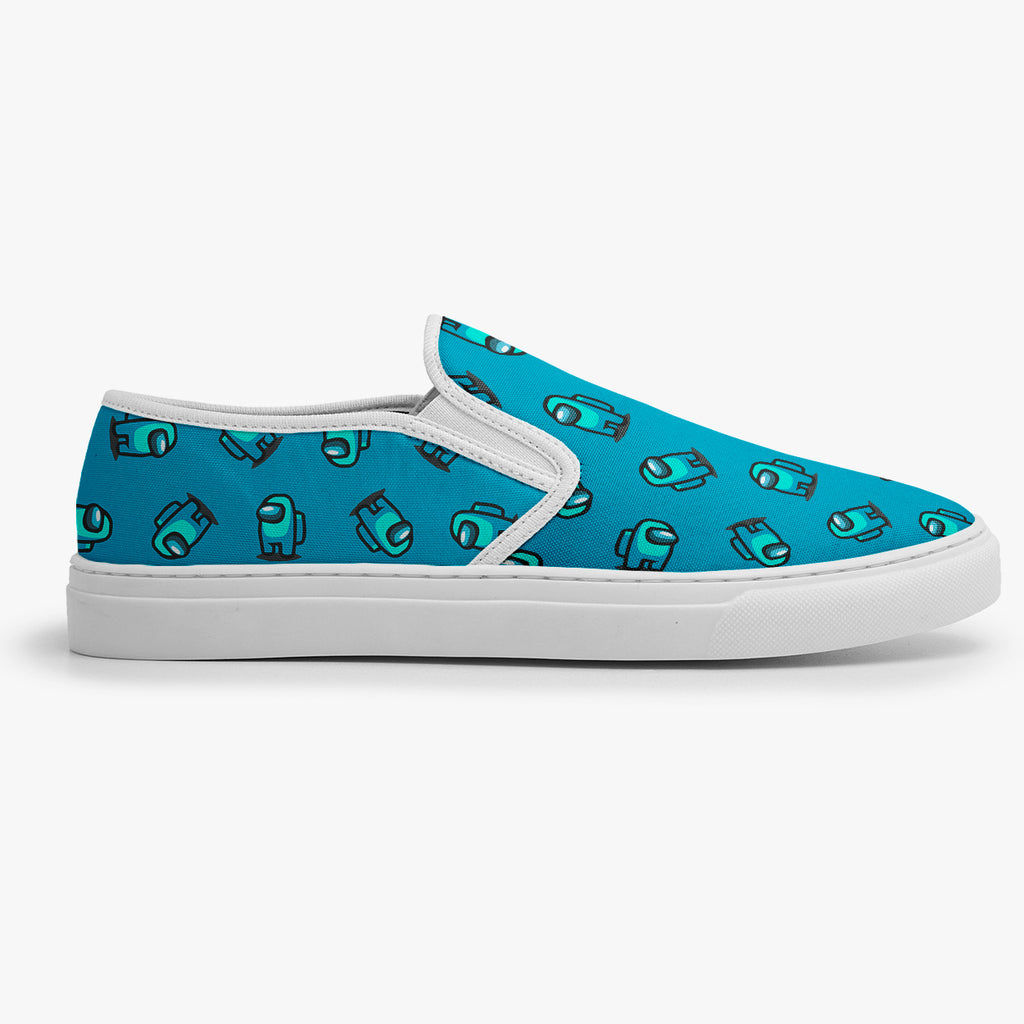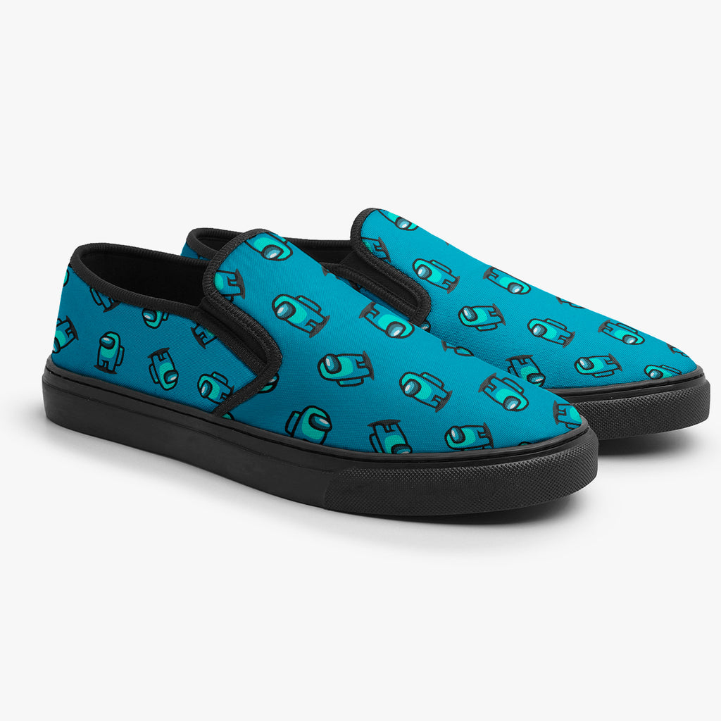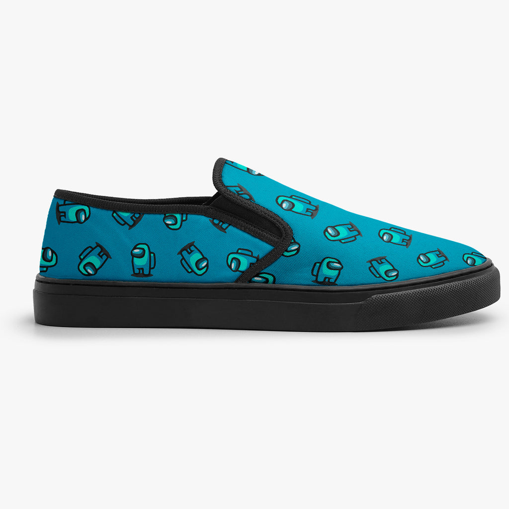 Tênis Slip On Azul Personagem Among Us Games, confeccionado em lona, com cores e estampas exclusivas.